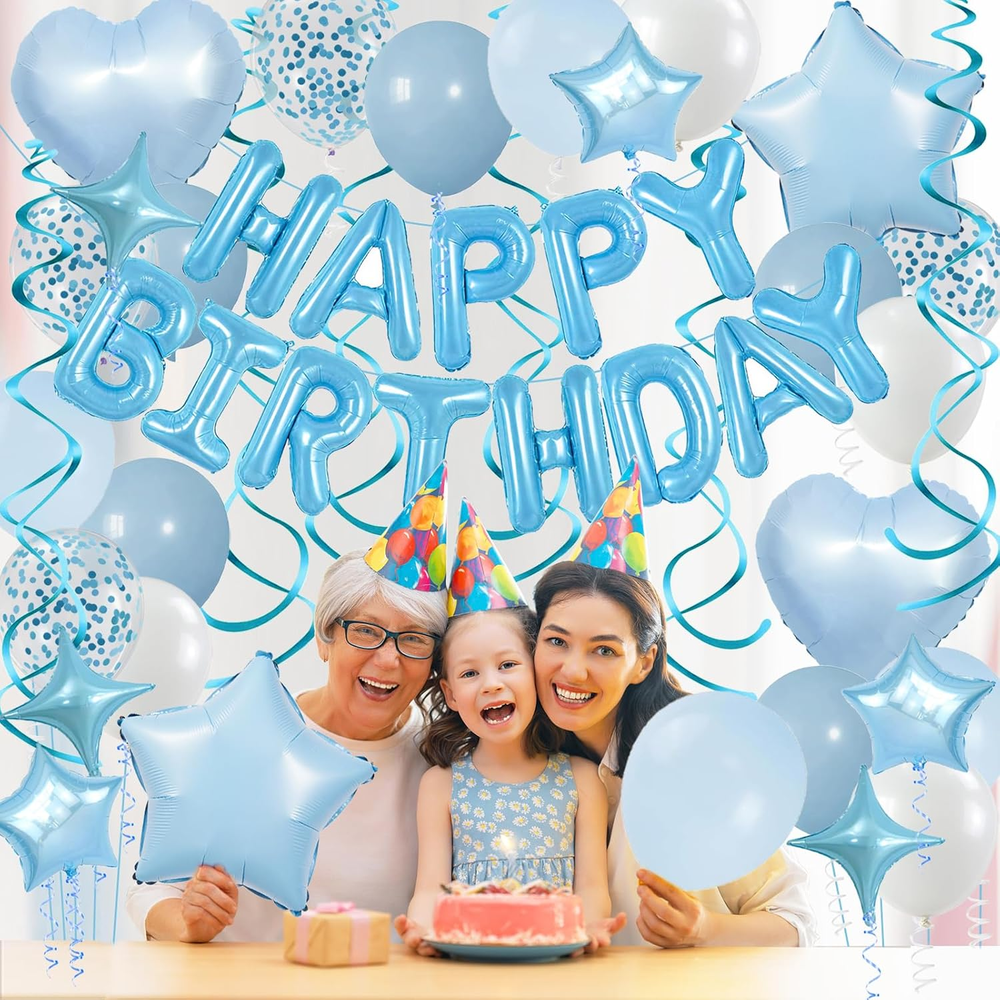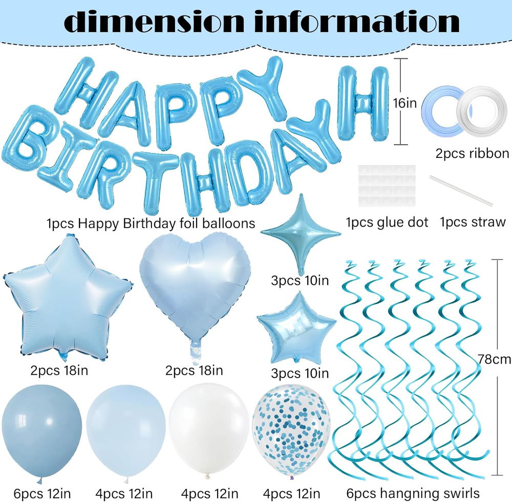 Light Blue and White Birthday Decorations: esigned in soft light blue tones to create a dreamy, cool, and charming making it irresistible for boys, girls, men, women, birthdays, bachelor parties, or any celebration suitable for all ages and occasions leaving an unforgettable impression at just one glance Easy to Use: You can hang the happy birthday banners and hanging swirls on walls, in rooms, outdoor courtyards, classrooms, trees, fireplaces, doorways, and curtains to create stunning photo backgrounds. Inflating balloons to about 90% will help them last longer. To make the confetti balloons sparkle, rub them with your hair after inflation to create static electricity Package includes: 1pc 16inch light blue foil “Happy Birthday” banner, 6pcs dusty blue birthday balloons, 4pcs white latex balloons, 4pcs light blue latex balloons, 4pcs blue confetti balloons(Each balloon is 12 inches), 2pcs 18inch baby blue star foil balloons, 2pcs 18inch baby blue heart balloons, 3pcs 10inch light blue star balloons, 3pcs 10inch light blue four-pointed star balloons, 6pcs light blue hanging swirls, 2pcs ribbons, 1pcs dot glue High-Quality Materials: Made from shiny premium Mylar foil, our birthday banner keeps its shape and stays inflated longer without leaking. These tough balloons are reusable—just deflate, store, and get ready to party again! Brighten up every celebration with decorations that last and dazzle. Customer Service: We are committed to providing top-quality products and ensuring your satisfaction. If you're not completely happy with this baby blue happy birthday decorations, feel free to contact us for a solution. Foil Balloons Birthday Decorations