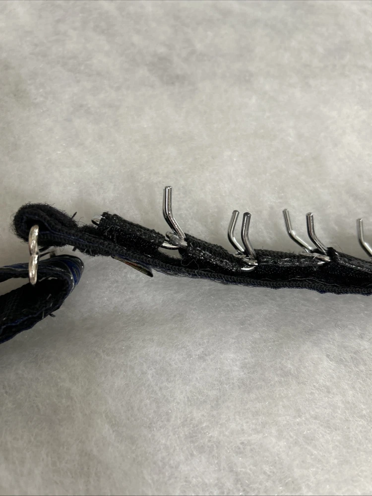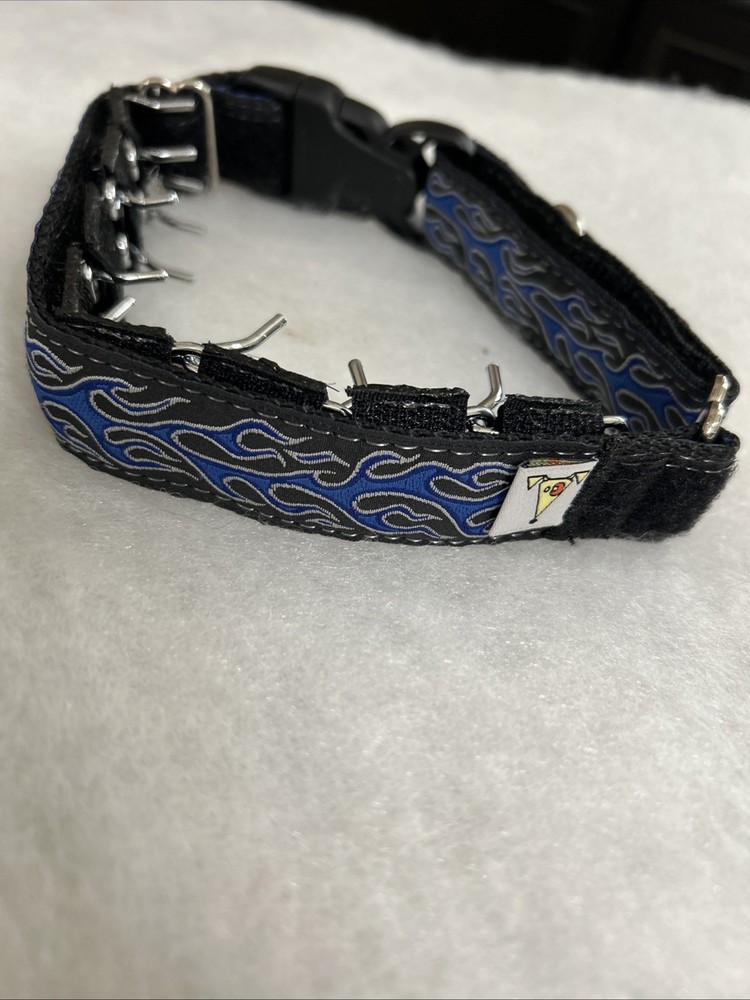 Dog Prong Collar Blue Black Silver Fire Design All Hound Apparel Size 1 inch wide Medium, approx. 16 to 17 inches long. It doesn't get any larger than 17 inches total. The prongs are detachable so you can use just a few or all and taper down to just a few and then none. This collar does have a snap clip entry to get it on and off, it does not have to go over your dogs head. It is a martingale type collar, which means it gets tighter on the dogs neck if they pull, preventing them from backing out of the collar. It is new, very clean, never used, I purchased two and only need one. Original Owner. Please see all photos. Shipping to USA only. Sold “as is”. TERMS OF SALE.Payment is expected at end of sale. Item will be mailed within 24 hours from time of received cleared payment. Everything will be securely packaged and sent from a smoke free home. Thank you for checking out our treasures. We strive for a five star transaction.