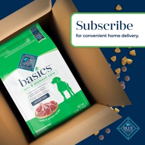Important Note for Our Valued Customers: To offer you the best prices with free shipping, we occasionally experience shipping delays. If this happens, we’ll notify you immediately, issue a full refund, and invite you to place a new order at your convenience. To keep costs low, we sometimes reuse branded packaging boxes for shipments—we appreciate your understanding if you receive your order in repurposed packaging. Rest assured, all products we sell are 100% brand new, unopened, and freshly manufactured, including pet food and human-grade items, with a minimum 8-month shelf life remaining. If any issues arise, please contact us first—we’re committed to resolving them quickly. If you’re not completely satisfied, we offer a full refund with no hassle. Thank you for your trust and support! Description BLUE Basics Dog Food is a delicious, limited-ingredient diet made from fewer ingredients selected with care, that may prove helpful to dogs with food sensitivities. All BLUE Basics recipes start with real meat from a single animal protein source not often used in dog food, plus they include pumpkin and easily digested carbohydrates. highlights STARTS WITH REAL LAMB: A recipe that starts with real lamb as the first ingredient, this adult dry dog food features a single animal protein source along with potatoes, peas and pumpkin to support gentle digestion in your dog without the grains that contain gluten, making it a good option for dogs with a sensitive stomach. LIMITED INGREDIENT DOG FOOD: BLUE Basics is a limited ingredient grain free dog food that doesn’t contain any chicken, beef, corn, wheat, soy, dairy or eggs making it a good option for dogs with food sensitivities. Plus, it’s specifically formulated with essential proteins and carbohydrates to help meet energy requirements and promote a healthy lifestyle. WITH LIFESOURCE BITS: This formula contains BLUE’s exclusive LifeSource Bits® – a precise blend of antioxidants, vitamins and minerals carefully selected by holistic veterinarians and animal nutritionists to support immune system health, life stage requirements, and a healthy oxidative balance. NATURAL DOG FOOD: BLUE dry dog food is formulated for the health and well-being of your adult dog and features the finest natural ingredients enhanced with vitamins and minerals. It never contains chicken (or poultry) by-product meals, corn, wheat, soy, artificial flavors or preservatives. Contains (1) 4lb bag of BLUE Basics Limited Ingredient Diet, Grain Free Natural Adult Dry Dog Food, Lamb & Potato