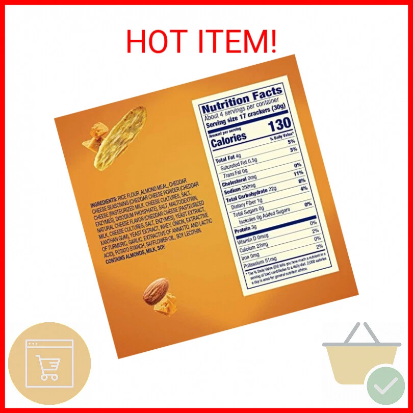 100% Genuine Free Shipping Gift Cards WELCOME TO THE SHOP Blue Diamond Almond Nut Thins, Cheddar Cheese, 4.25 Oz - Contains one 4.25-ounce box of Blue Diamond Almonds Cheddar Cheese Nut-Thins - A crunchy gluten free cracker made with Almonds and a cheesy taste; certified Kosher - A tasty and healthy snack with 3 grams of protein per serving - Perfect with your favorite snack dips, cheeses, and spreads. Serve them at your next party and your guests won't leave until they're gone. - Free of cholesterol and saturated fat - great for adults in the office or kids at school Payments We accept the following payment methods PayPal Please pay as soon as possible after winning an auction, this will allow for quicker shipping times! Returns We accept returns. You can return unopened items in the original packaging within 30 days of your purchase with receipt or proof of purchase. If 30 days or more have passed since your purchase, we cannot offer you a refund or an exchange. Upon receipt of the returned item, we will fully examine it and notify you via email, within a reasonable period of time, whether you are entitled to a return. If you are entitled to a return, we will refund your purchase price and a credit will automatically be applied to your original method of payment. Only regular priced items may be refunded. Sale items are non-refundable. Shipping Shipment processing time All orders are processed within 2-3 business days. Orders are not shipped or delivered on weekends or holidays. If we are experiencing a high volume of orders, shipments may be delayed by a few days. Please allow additional days in transit for delivery. If there will be a significant delay in shipment of your order, we will contact you via email or telephone. Shipping rates & delivery estimates Shipping charges for your order will be calculated and displayed at checkout.