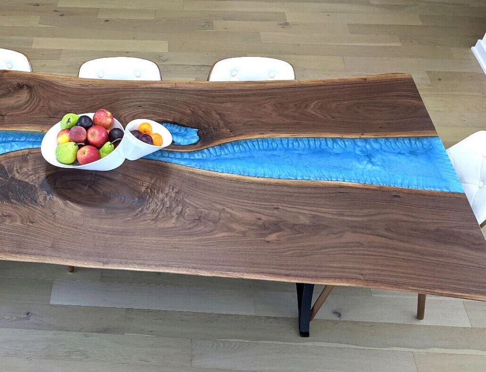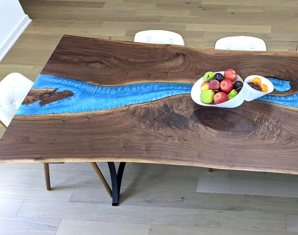 Blue Epoxy Resin Dining Table, Live Edge Wooden Desk Table, Acacia Furniture