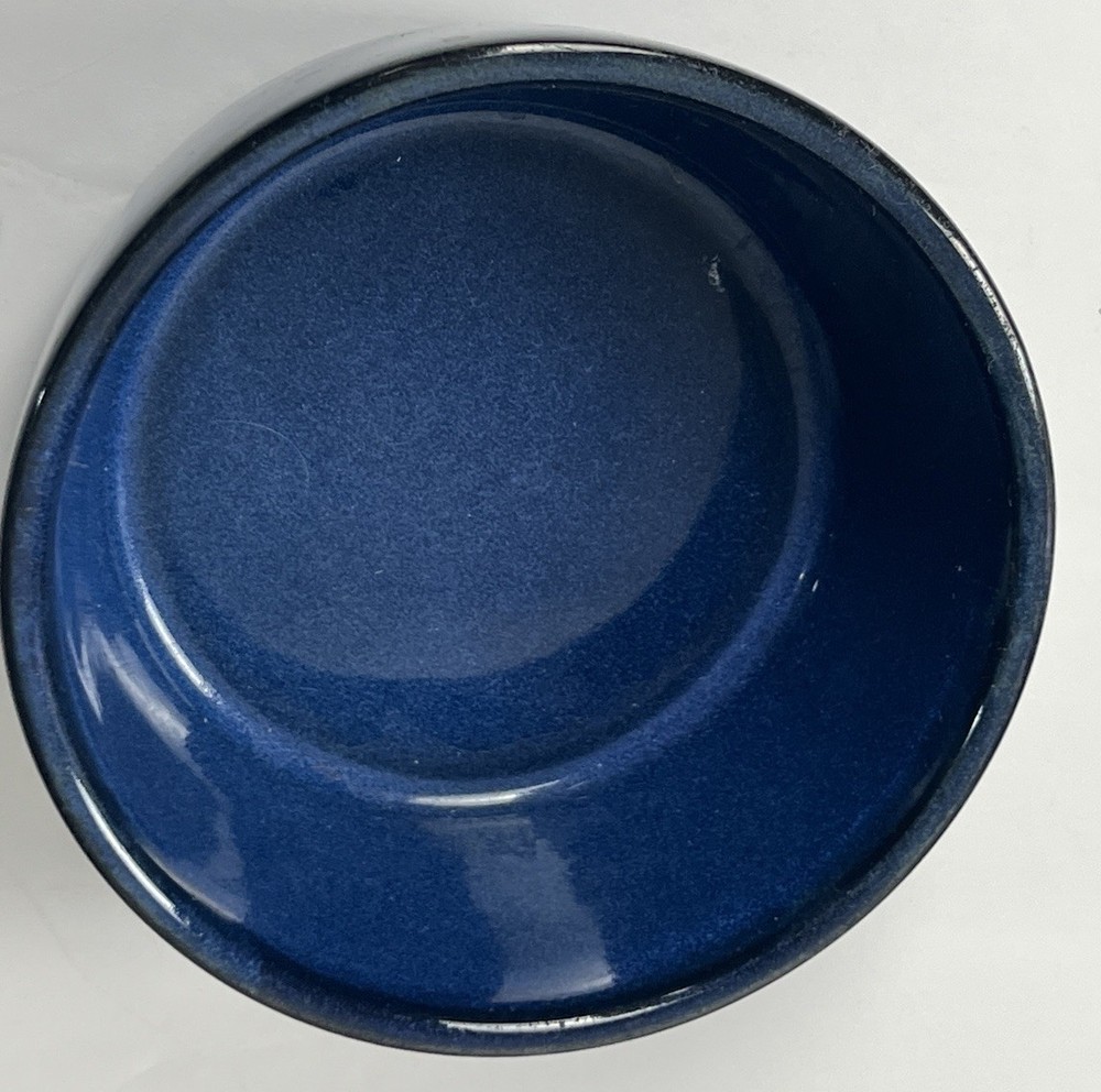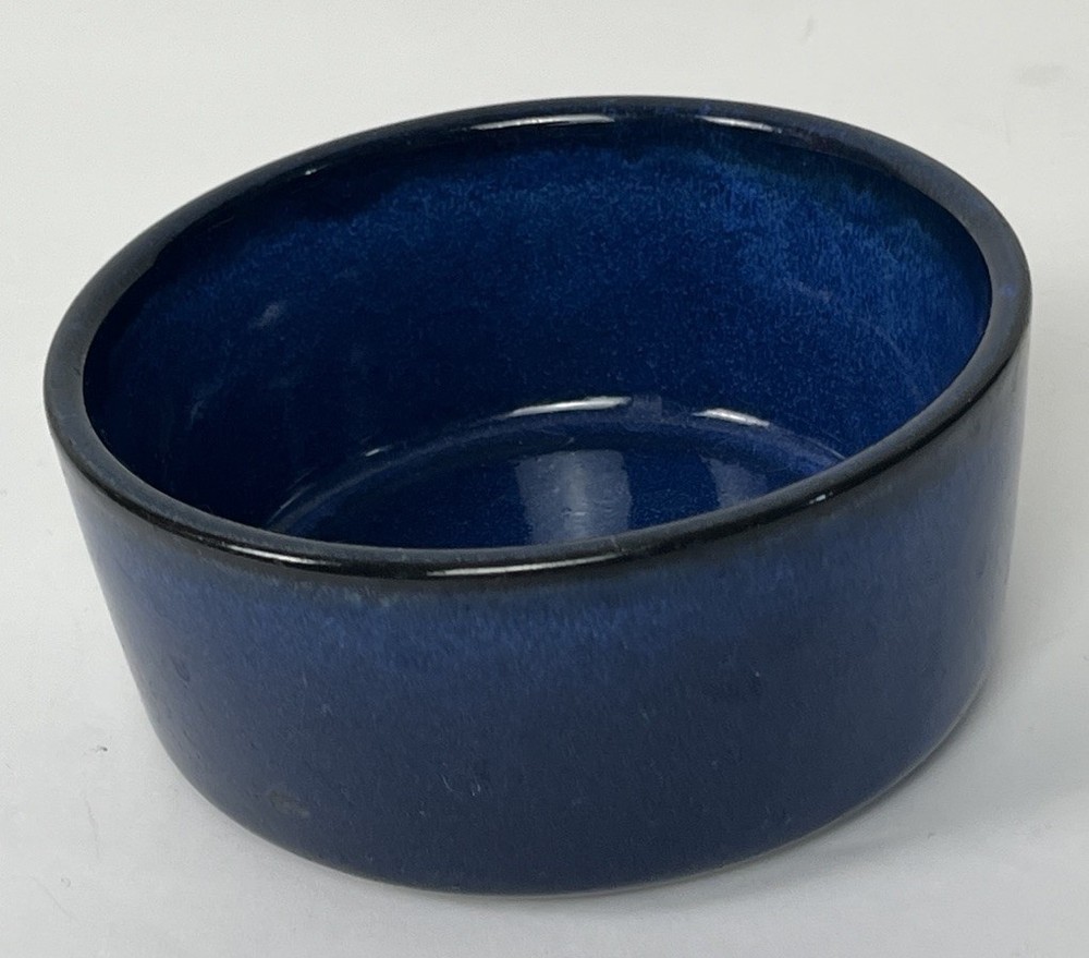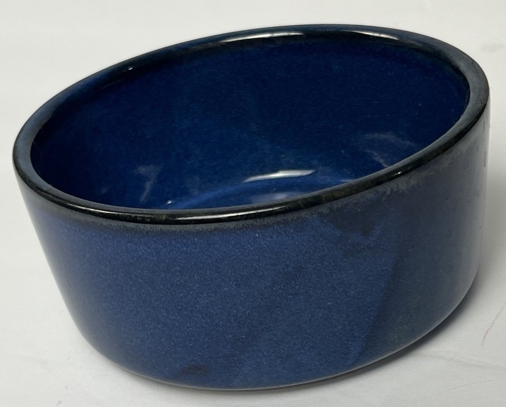 Dark Blue Ceramic Pet Bowl Glossy glazed ceramic bowl in dark blue with natural pottery color variations. Dishwasher safe pet bowl perfect for wet or dry food or as a water bowl. Medium size with a 5-inch diameter and 2-inch depth for small to medium dogs or cats. Pre-owned no chips or cracks - light base wear. Versatile decor blending in easy care quality ceramic.