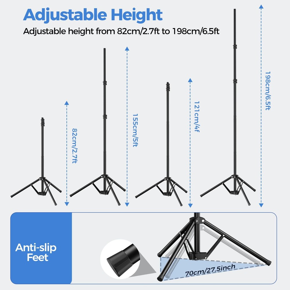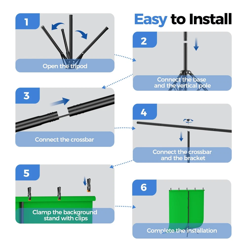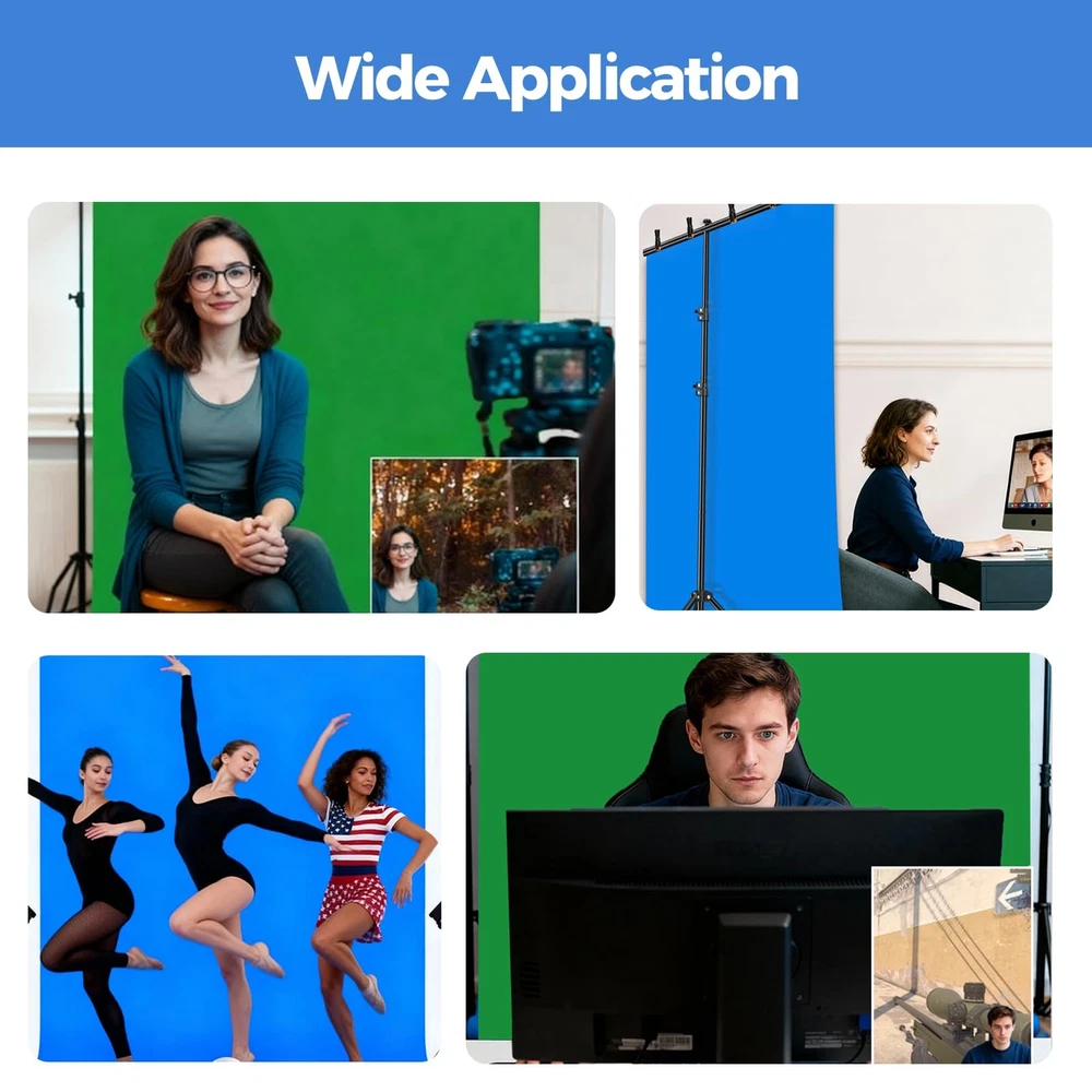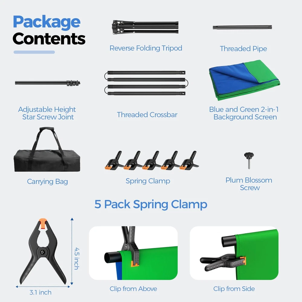Meet the Blue Green Screen Backdrop Kit—your go-to for turning any space into a polished setup, whether you’re creating content or joining important calls. Inside the kit, you’ll find all essentials: a 5x7ft reversible blue-green backdrop (soft polyester that stays smooth), a 5x6.5ft T-shape stand, 5 clips to keep the backdrop taut, and a roomy carry bag—so you can grab and go without fumbling with loose parts. What makes this kit stand out? Its innovative reverse-folding bracket: unlike clunky traditional stands, it unfolds wide for steady use (no wobbling mid-stream!) and folds down small enough to tuck into a closet or backpack. The stand adjusts easily, too—stretch it to 6.5ft for full-body shots, or shrink it to desktop size (as low as 2.7ft) for Zoom calls at your desk, fitting tight spaces like apartments or home offices. The dual-color backdrop is a game-changer: switch between blue and green in seconds to match different lighting or editing needs, and it’s low-maintenance—toss it in the wash if it picks up dust, or iron out folds for a crisp look.Setup takes just minutes (no tools needed!)—great for beginners or anyone who hates complicated gear. Use it for more than just streaming: nail professional-looking product photos, keep your home background neat for work calls, or create fun virtual backdrops for gaming streams.It’s light enough to take to a friend’s shoot or a small event, yet sturdy enough to hold up through regular use—making it a smart pick for anyone who wants quality without the hassle. [New Type of Reverse Folding Bracket]Innovative tripod base can be reverse-folded, with larger unfolding area, better stability and compact storage than conventional stands [2-in-1 Reversible Blue Green Screen Backdrop]Blue and green dual-color photo backdrop provides for more flexibility in use, which is made of polyester fibric, all edges are carefully finished preventing tears.Machine and hand washable, ironable, foldable [Adjustable T-shaped Stand]The height of the stand can extend from 120 cm to 198 cm (4 ft to 6.5 ft).After removing the telescopic rod, it can be adjusted from 82 cm to 152 cm (2.7 ft to 5 ft), with a width of 5 feet, making it suitable for use in both desktop and floor scenarios [Portable & Set-up Fast] The 2-in-1Blue Green Screen adjustable background stand is convenient to assemble and disassemble.With a carrying bag, both the backdrop stand, 5 clamps and the green blue backdrop can be stored, easy to store or carry [Application]The chromakey blue green screen backdrop stand kit enables quick and clean chroma key compositing in videos and images, ideal for home office, vlogging, TV broadcast, gaming, VR, zoom, live streaming, YouTube video recording, webcam etc