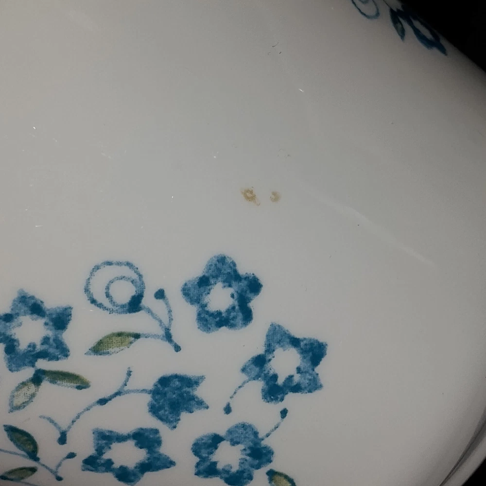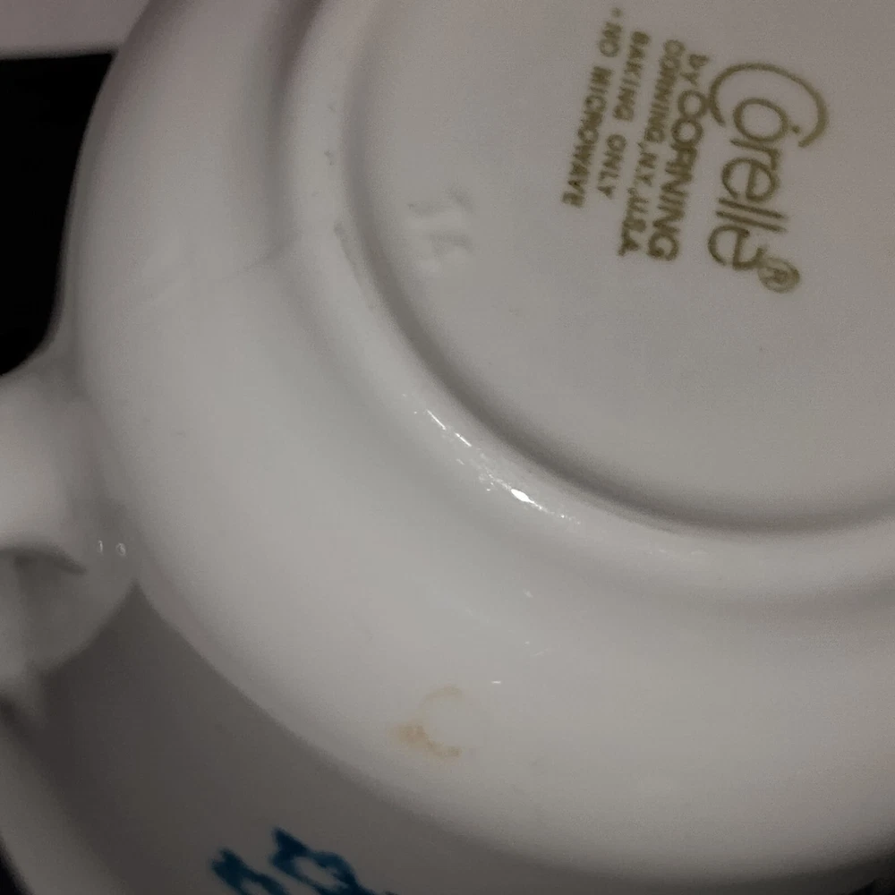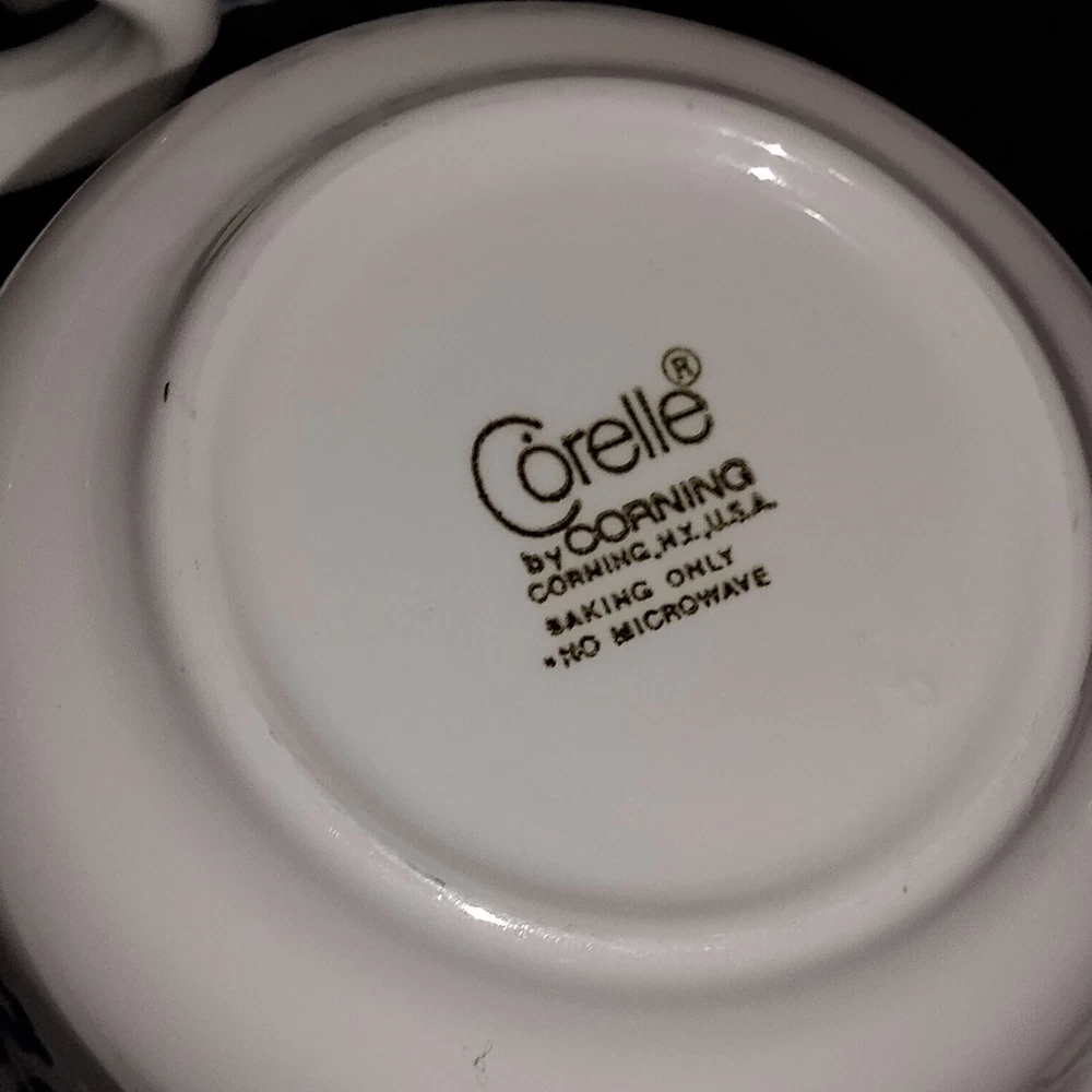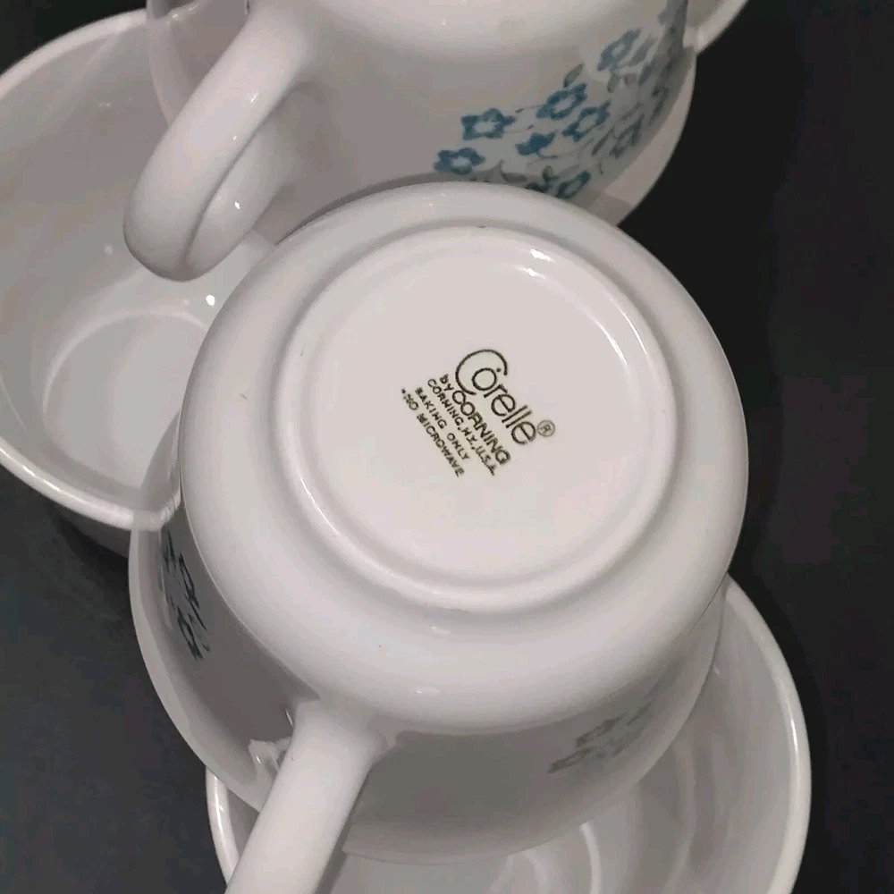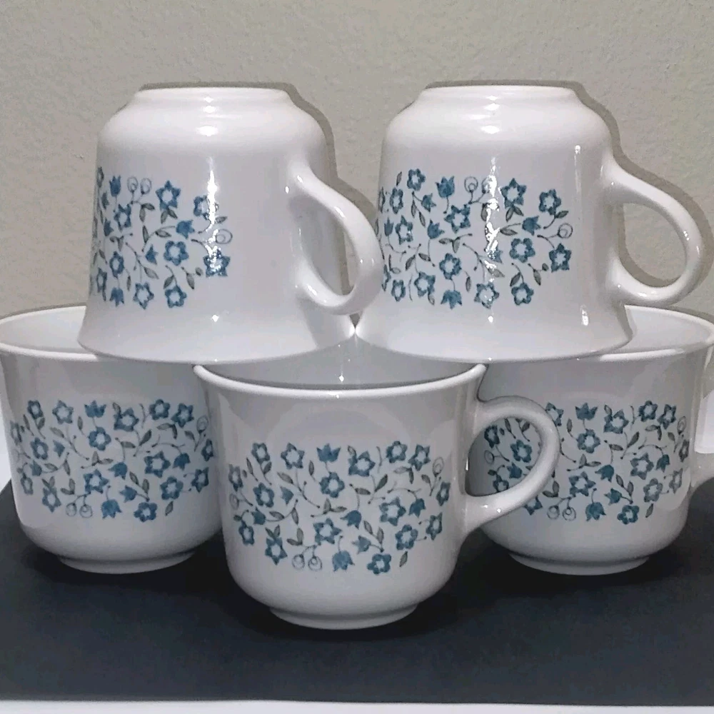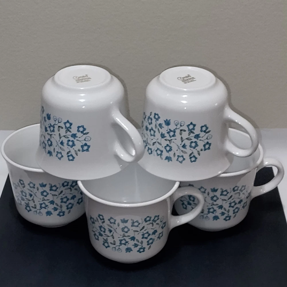 Type: Coffee Cup Material: Glass Original/Reproduction: Vintage Original Theme: Floral Pattern: Blue Heather Vintage: Yes Object Type: Mug Country/Region of Manufacture: United States Production Technique: Fused Glass Type of Glass: Pressed Glass Product Line: Corelle/Corning Ware Production Style: Milk Glass Number of Items in Set: Five-Piece Brand: Corelle Color: Blue Backstamp: Impressed Occasion: All Occasions