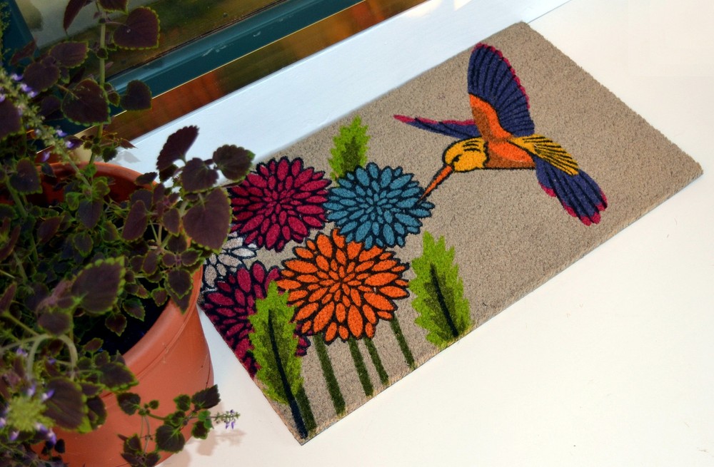 Welcome guests with this lovely doormat boasting a colorful hummingbird & floral design adding a touch of nature to your front door. This doormat is constructed from the best quality coir & printed with water based colors. Coir is the natural fiber extracted from the husk of Coconuts, is relatively waterproof, has superior scrubbing power & is resistant to the elements. The vinyl backing provides reinforcement & prevents the doormat from skidding. With a coir doormat from Decor, you can feel confident dirt & debris will be left at the front door & not in your home. 100% coir fiber Vinyl backing prevents skidding Lovely hummingbird design is painted with water based colors Ideal for moderate to heavy-use traffic areas Measures at 18-inches deep by 30-inches wide by .5-Inches thick
