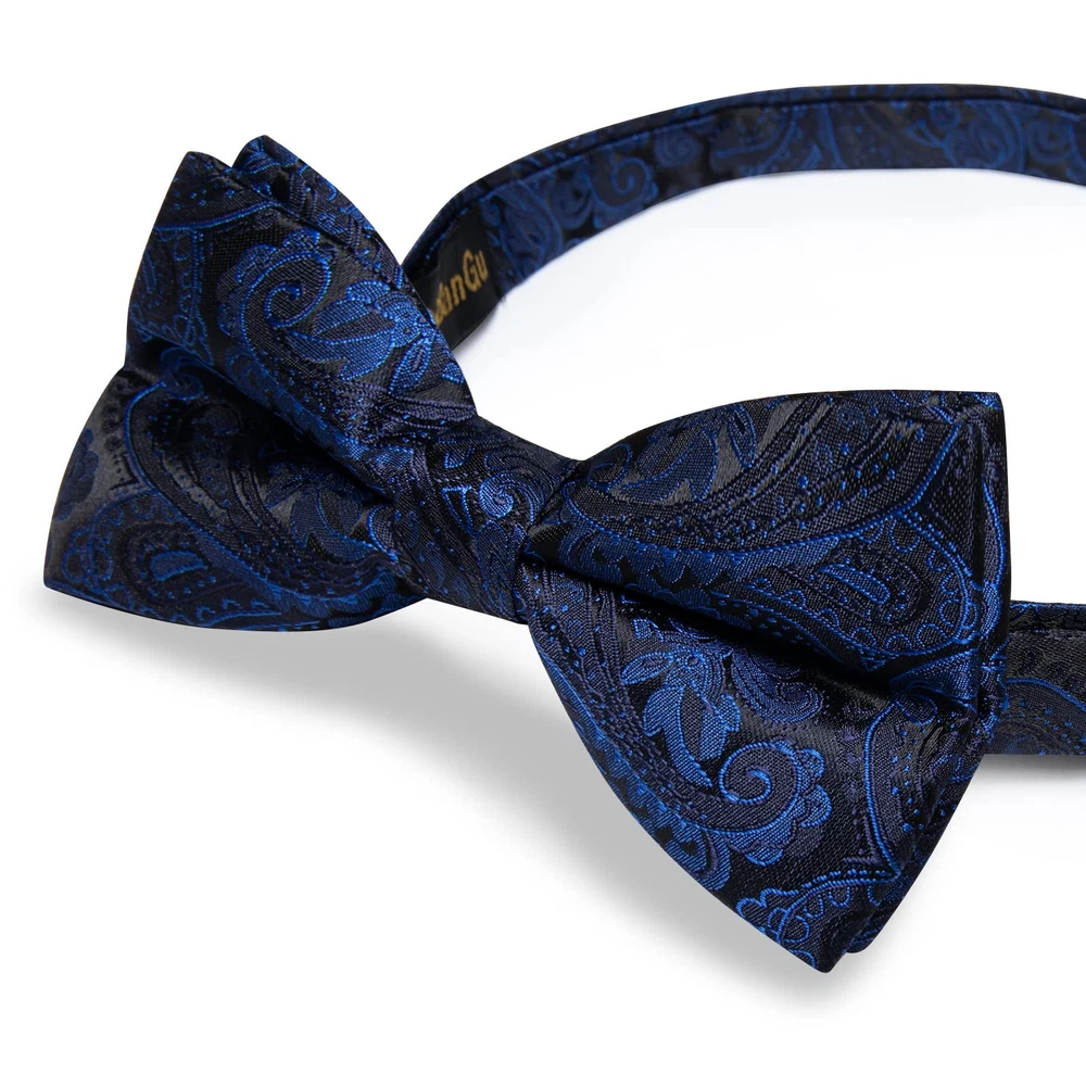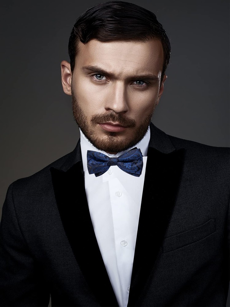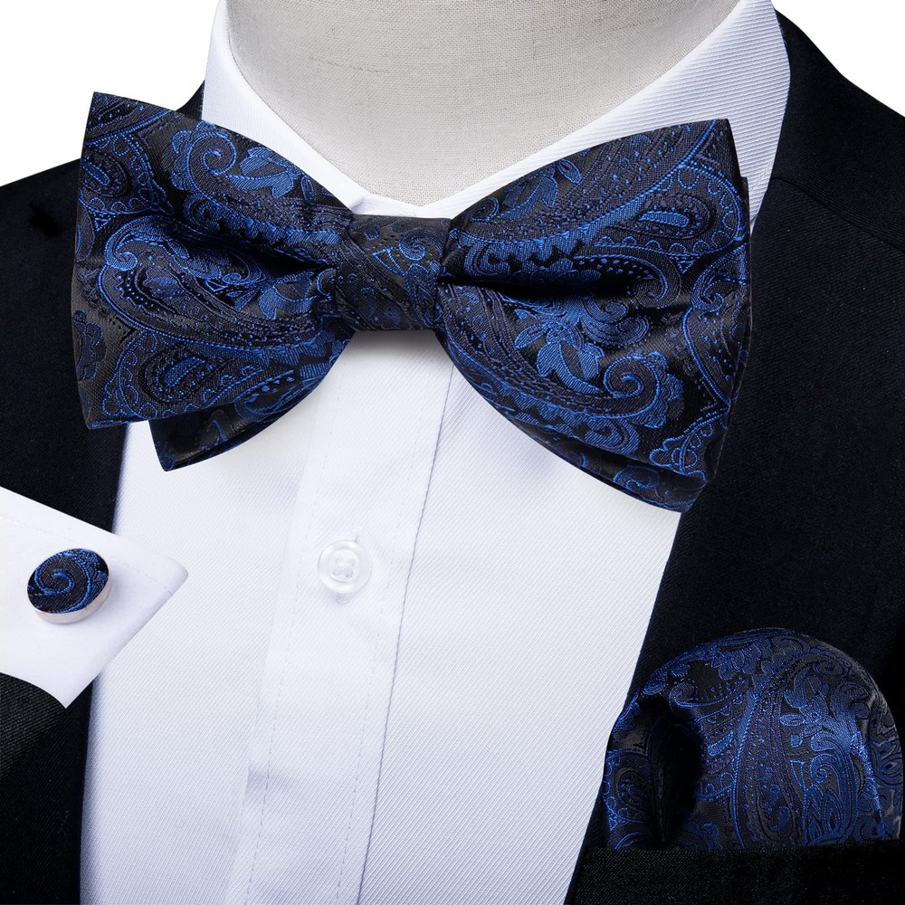 pre-tied bowtie + pocket square + cufflinks 【Package Includes】Blue Pre-tied Bowtie + Handkerchief + Cufflinks + Gift Box. This bowtie set is the best gift for father, son, husband, friends on Father's Day, Christmas, Valentine's Day, New Year and so on 【Adjustable Size】Adjustable Neck Size 11 inches - 19 inches, suitable for boy aged older than ten years and adult male. Bow tie size: 4.7 inches x 2.4 inches (12 cm x 6 cm), Pocket square size: 9 inches x 9 inches (23 cm x 23 cm), Cufflink Diameter: 0.55 inches (1.4 cm) 【Top Quality】This bowtie and handkerchief are made of high-quality silk, which will make you feel comfortable wearing. And this bowtie has good durability and wear resistance 【New Design】This is an adjustable bow tie with classic patterns and a variety of colors suitable for all formal and informal occasions, becoming the focus of attention with its unique accessories 【Occassion】This pre-tied bow tie set is suitable for various occasions, such as weddings, gatherings, events, banquets, graduation, dates, business meetings and so on. Wearing this bow tie will make you exude charming charm in these occasions