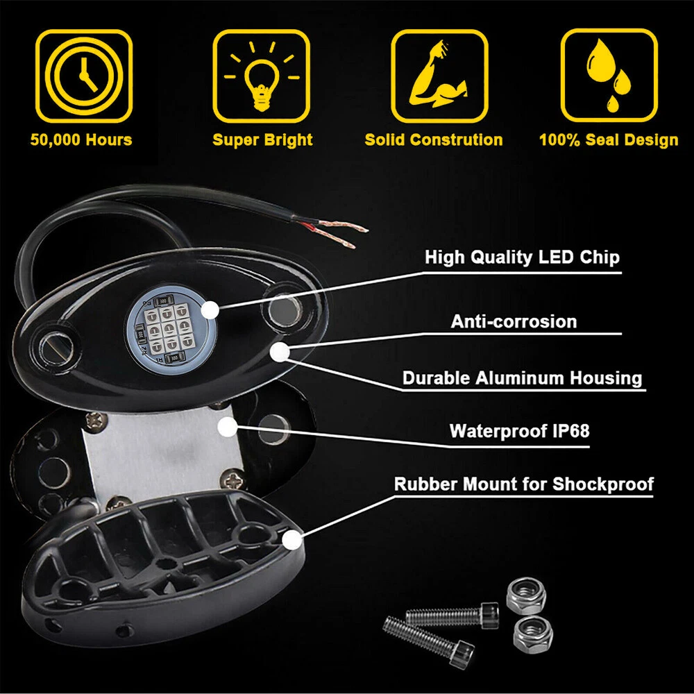 Specifcations: LED quantity: 9 LED per unit Light color:blue Waterproof grade:IP68 Service life:50000h+ Features: *High brightness Equipped with 9 LEDs chips per unit for providing high brightness and superior lighting effect. *IP68 High waterproof grade with better waterproofness, there is no need to worry even at the outdoor environment. *Excellent material Made of toughed glass with solid aluminum housing ensuring its resistance to heave impacts. *Application It is designed for all models, fit for cars, trucks, off-road, boat deck, touring, underbody interior exterior, etc. *Connection The red wire connects to positive. Blue Pods LED Rock Lights For Off-Road UTV ATV Truck 4Pods Underbody Wheel Light Specifcations: LED quantity: 9 LED per unit Light color:blue Waterproof grade:IP68 Service life:50000h+ Features: *High brightness Equipped with 9 LEDs chips per unit for providing high brightness and superior lighting effect. *IP68 High waterproof grade with better waterproofness, there is no need to worry even at the outdoor environment. *Excellent material Made of toughed glass with solid aluminum housing ensuring its resistance to heave impacts. *Application It is designed for all models, fit for cars, trucks, off-road, boat deck, touring, underbody interior exterior, etc. *Connection The red wire connects to positive. The black wire connects to negative. Packaging include: 4x LED Rock Lights 1x Installation kit Item Specifics Brand Unbranded Manufacturer Part Number Does Not Apply Number of Bulbs 4 Type Light Bulb Wattage 9W Placement on Vehicle Front Rear Left Right Under Fender Wheel Eyebrow Grill Wheel Arch Mudgua Fitment Type Performance/Custom Manufacturer Warranty 2 Year Waterproof IP68 Voltage 12V/24V Superseded Part Number Made for all makes and models. Size 2.75" Housing Color Black Lifespan Over 50000 hours Material Aluminum Color Blue Operating Temperature -20~40 degree Celsius Beam Angle 120 degree LED Qty 9 Light Color Blue Lighting Technology LED Suitable For Underbody Light Wheel Light Bulb Fitment Code C5W Features CANbus Compatible OE/OEM Part Number LED Rock Lights Color Temperature 3000K Lumens 2500 lm Bulb Life Hours Up to 30,000 Hours Interchange Part Number LED Rock Lights Model Blue LED Rock Lights Bulb Life Hours Up to 30,000 Hours Interchange Part Number LED Rock Lights Model Blue LED Rock Lights Warranty 2 Year Payment Returns DESCRIPTION PAYMENT SHIPPING RETURN POLICY CONTACT US Shop Category Store Home LED Headlight ◈ H13 LED FogLight ◈ H10 / 9145 / 9140 LED Reverse Light ◈ T15/921/W16W LED Side Marker Light Car Parts & Accessories Tail Light assemblies Other Hot Item Front Left Driver Power Seat Switch Fits 2005-19 Chrysler 200 300 Town & Country USD 20.89 New Fits 2013-20 Nissan Pathfinder Front Left & Right Outer Bumper Cover Bracket USD 17.09 10ft Seal Strip Trim For Car Front Rear Windshield Sunroof Weatherstrip Rubber USD 12.34 Fuel Gas Door Lock Cylinder & Keys For Toyota 1995-2004 Tacoma 2000-2003 Tundra USD 13.99 Ignition Control Module 4 Pin HEI Distributor for GM Chevy 1974-1988 Replacement USD 11.99 Picture New List Item 2Pcs Front Rear RH Switch Window Panel Bezel Trim For Toyota Yaris 2012-2014 USD 39.99 4" Amber & Red Round 16 LED Stop Turn Brake Trailer Tail Light for Jeep Truck 4x USD 33.99 2x T10 Red Park LED Tail Light Stop Globe For HOLDEN VU COMMODORE VT VY VX VZ USD 10.99 For BMW Set of Intake 1 & 1 Exhaust Cam Camshaft & 1 Crankshaft Position Sensor USD 22.99 For Honda Civic 2012-2015 8Pcs Black Set Pillar Posts Door Trim Glossy Cover Kit USD 14.99 Help & Info Payment Policy Shipping Policy Return Policy FAQ About Us Blue Pods LED Rock Lights For Off-Road UTV ATV Truck 4Pods Underbody Wheel Light Specifcations: LED quantity: 9 LED per unit Light color:blue Waterproof grade:IP68 Service life:50000h+ Features: *High brightness Equipped with 9 LEDs chips per unit for providing high brightness and superior lighting effect. *IP68 High waterproof grade with better waterproofness, there is no need to worry even at the outdoor environment. *Excellent material Made of toughed glass with solid aluminum housing ensuring its resistance to heave impacts. *Application It is designed for all models, fit for cars, trucks, off-road, boat deck, touring, underbody interior exterior, etc. *Connection The red wire connects to positive. The black wire connects to negative. Packaging include: 4x LED Rock Lights 1x Installation kit Payment Returns All rights reserved. On Nov 24, 2024 at 12:16:26 PST, seller added the following information: