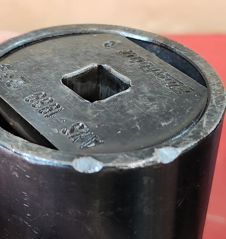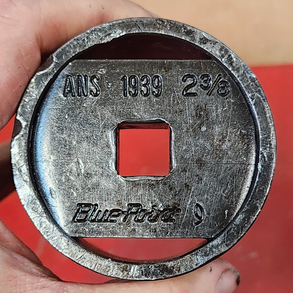 Blue Point 1/2" Drive 2-3/8" Axle Nut Socket 6 Point ANS 1939 Good to fair condition. Has scratches, blemishes, light surface rust in spots, small nicks, and other signs of use/wear. Owners marks consist of two notches ground into edge.