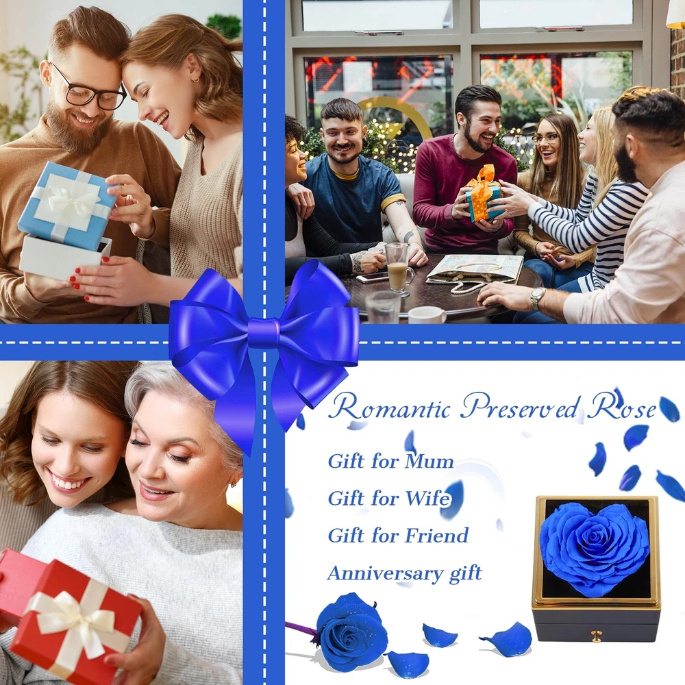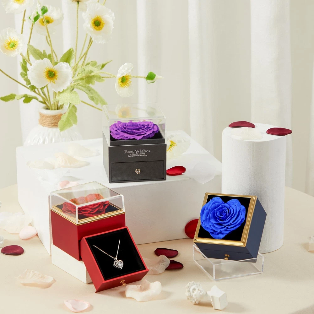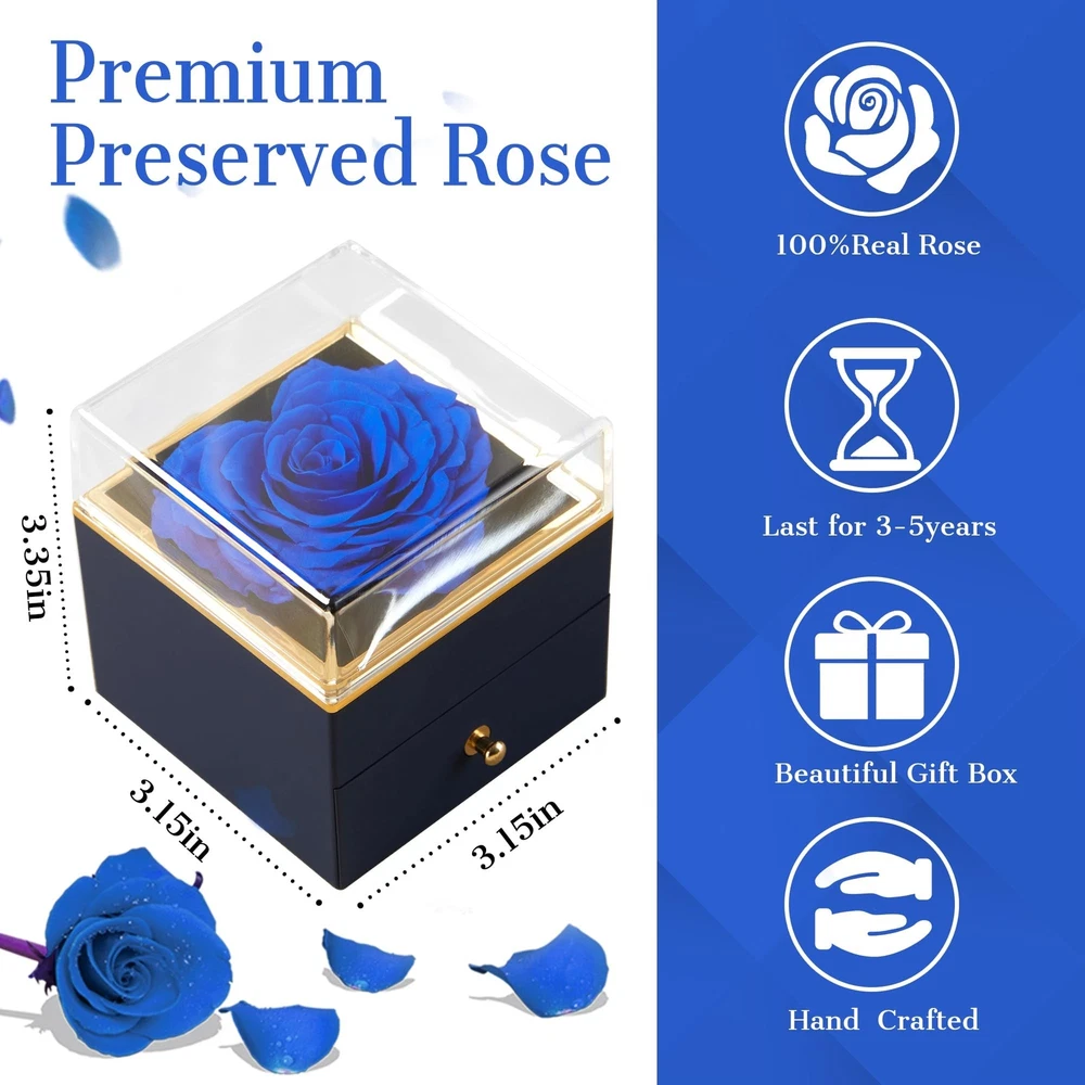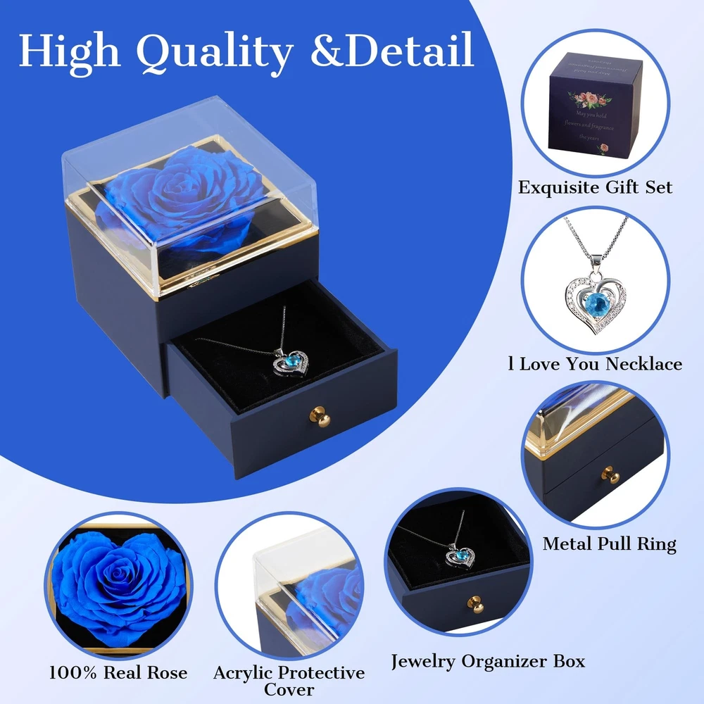 Blue Preserved Rose with Necklace Gift, Heart Rose Eternal Rose Flower Fresh Cut Flower Decor for Women Wife Girlfriend Mother's Day Valentine's Day Wedding Party Birthday Product Details Color: Blue Size: Small Brand: SHINEFLOR UPC: 658359691877 EAN: 0658359691877 MPN: Does not apply Product Dimensions: 3.15 x 3.35 x 3.15 inches Item Weight: 5.9 ounces Country of Origin: China Batteries required: No Handmade Heart-Shaped Eternal FlowersSelected top quality roses, carefully made by skilled craftsmen heart-shaped roses, not only in the appearance of bright colors, petals feel great, with fragrance tablets at the same time exudes a light fragrance. Elegant Rose Jewelry Box with NecklacePreserved roses are displayed in an elegant jewelry box, while the drawer comes with a romantic and delicate necklace. The jewelry box is of high quality, sturdy and durable, yet elegant and romantic. The drawer of the jewelry box not only protects the delicate necklaces well, but also serves as a jewelry organizer. As a well-crafted gift, SHINEFLOR will do its best to help you convey your eternal love. The Perfect Gift For Any OccasionSurprise your loved ones with a charming heart-shaped preserved flower and sparkling neck pendant to keep their fond romantic memories alive for years to come. Preserved roses with necklace make great gifts for Valentine's Day, Mother's Day, Christmas, weddings, anniversaries, birthdays and more. This gift for women can also be used as a keepsake to collect her other jewelry. Easy Care Forever Preserved Real RoseEternal Roses are made from real fresh roses. Simply stored in a dry place to avoid moisture and with no care, these Heart Roses will last three to five years. Because they are all carefully handcrafted, each Heart Rose will have a slightly different shape, but this does not detract from their beauty. I'm sure your loved ones will be in a good mood when they see such a gift! High QualitySHINEFLOR strives to create high-quality preserved flowers to pass on eternal love. If you have any questions or comments, please feel free to contact us at any time. Your satisfaction is our greatest pursuit!