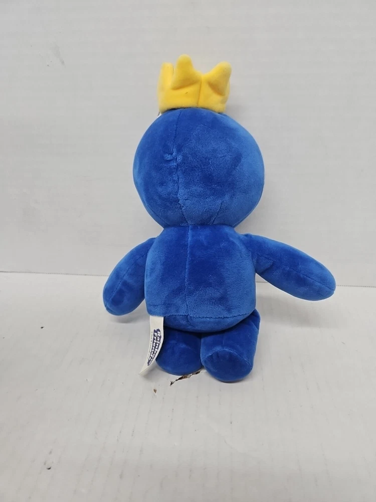 The "Blue Rainbow Friends Plush" is a small (9") stuffed animal from the Roblox Phatmojo Monster Yellow Crown series. It features a blue color and belongs to the Rainbow Friends character family. Ideal for birthdays, this plush toy is suitable for all ages and was manufactured in China.
