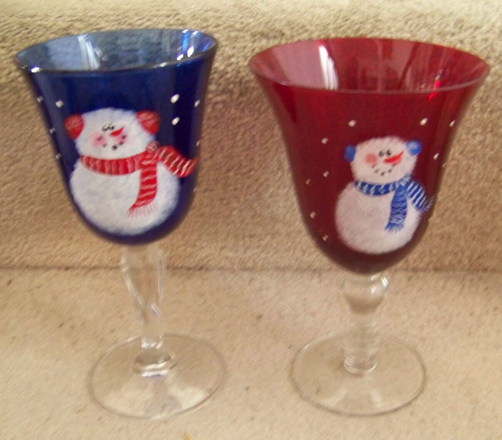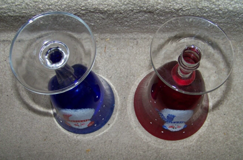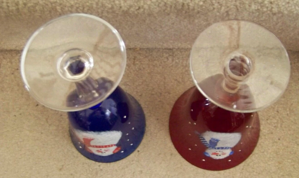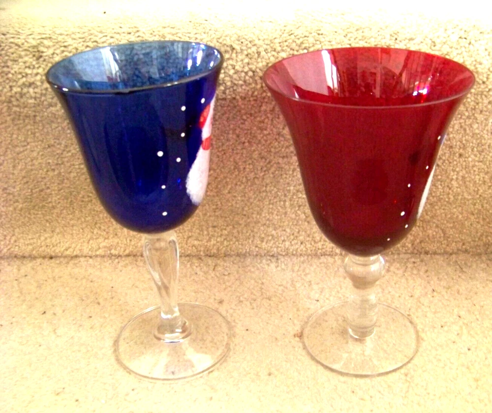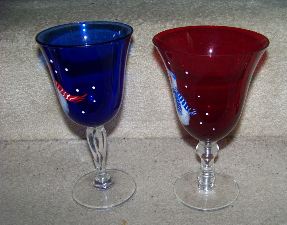 Blue & Red Snowman Stemware Glasses - 7.6" & 7.3" Tall - Free Shipping