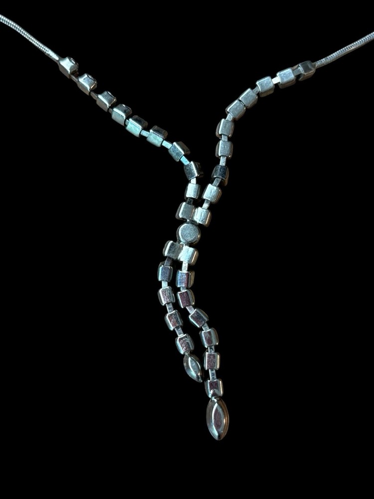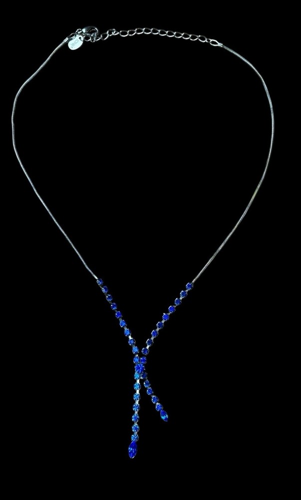 This Blue Rhinestone and Silver Tone Fashion Necklace by Icing features an asymmetrical pendant with blue rhinestones set in a prong setting. The adjustable necklace has a lobster closure and a snake chain design, making it suitable for any occasion. With a vintage style and Y-drop design, this necklace exudes beauty, art, and fashion & costumes themes. Perfect for those who appreciate statement pieces with a touch of glamour.