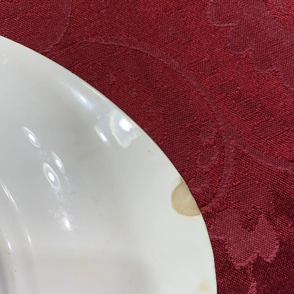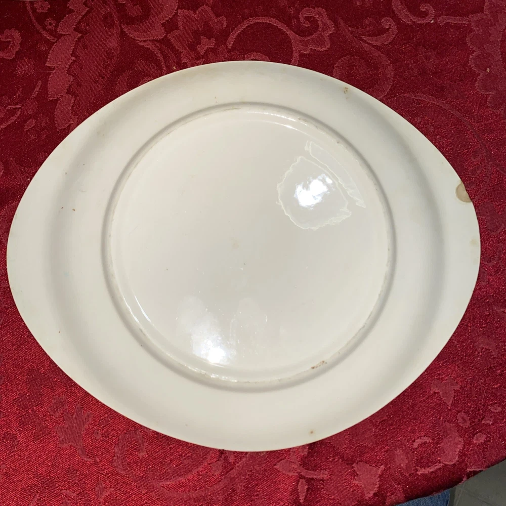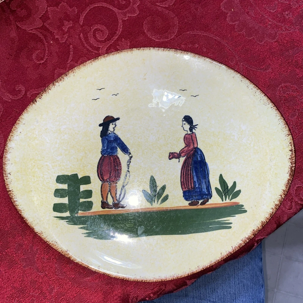 This Blue Ridge Southern Potteries NORMANDY Oval Serving Plate is a unique addition to any collection. The plate features a beautiful hand-painted design that showcases a mid-century modern style. The round shape and multicolor pattern make it perfect for all occasions, while the ceramic material adds a touch of elegance. The plate is vintage and antique, with production techniques dating back to the United States. It is a serving platter and measures 11 3/4 inches in diameter. The plate is handmade and features a peasant design, with a man and woman theme. This art pottery piece is perfect for collectors and enthusiasts alike. Small chip on bottom side of platter as shown in picture
