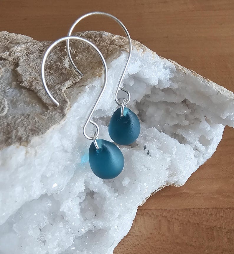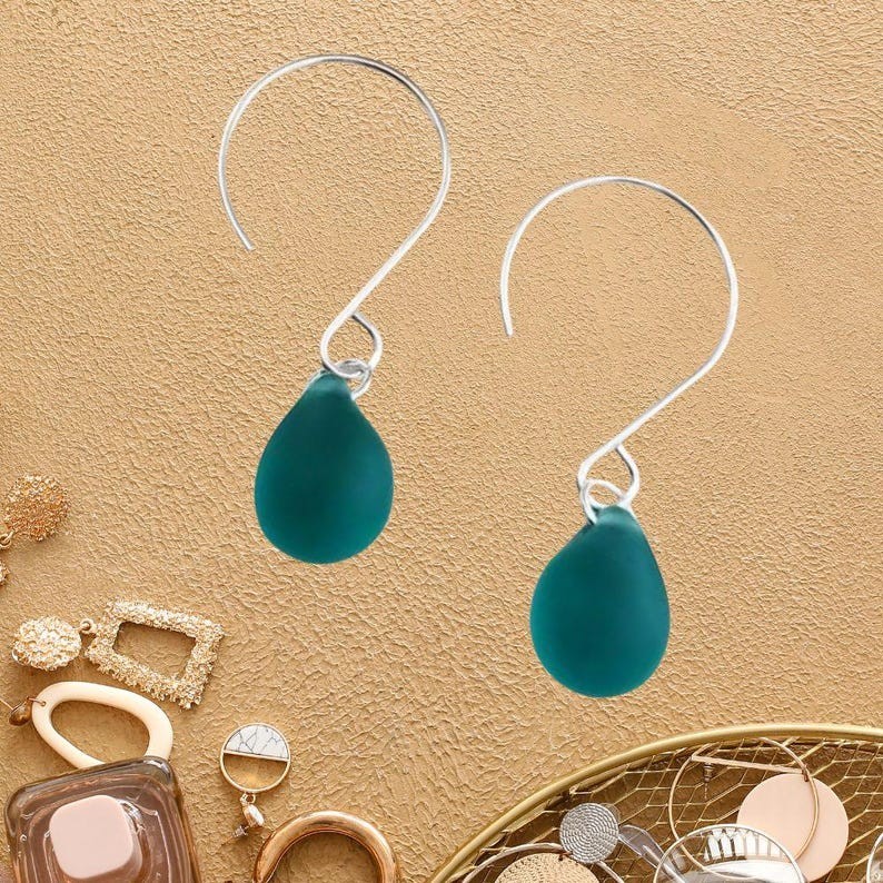 Featuring smooth, frosted sea glass in a stunning teardrop shape, paired with sleek sterling silver ear wires, these earrings are the perfect blend of casual elegance and timeless style. ✨ FEATURES Genuine eco-friendly sea glass with a natural frosted finish Teardrop-shaped sea glass in rich dark teal green High-quality .925 sterling silver ear wires — lightweight and comfortable Perfect for everyday wear or special occasions 🌊 ABOUT THE SEA GLASS Our sea glass is carefully cultured to resemble authentic ocean-tumbled beach glass, offering uniform shape and size for a polished look. Each piece reflects the calming essence of the sea, making these earrings a beautiful reminder of nature’s tranquil beauty. 📏 SIZE & MATERIALS Sea glass teardrop size: Approximately 12-15mm (varies slightly) Ear wires: Solid .925 sterling silver Lightweight and easy to wear all day long