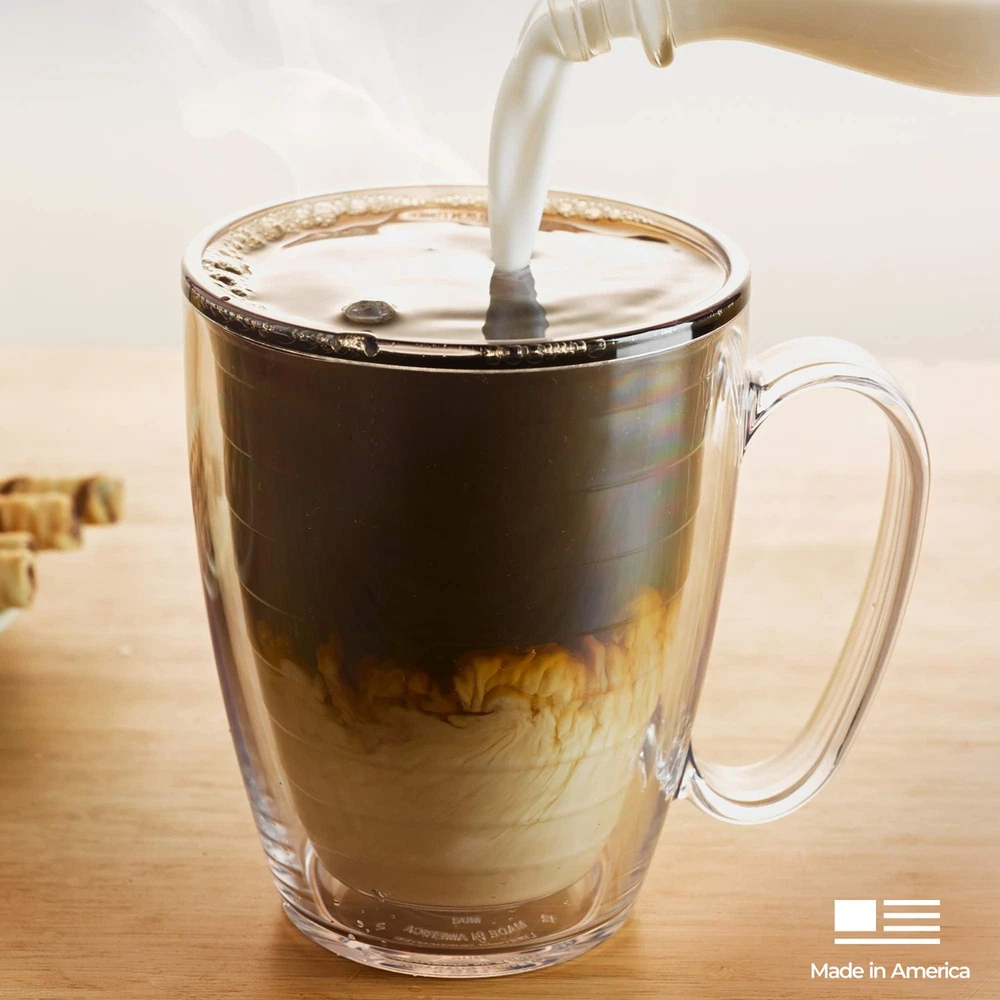 tumblers feature double-wall insulated construction that keeps drinks hot or cold longer and reduces condensation to prevent rings on your table. Strong, impact resistant BPA-free material means these tumblers can take a tumble without shattering and won't retain tastes or odors. Our 16oz classic mug features a comfortable and easy-to-grip handle. Most tumblers are microwave, freezer and dishwasher safe for no-worry convenience and fit most cup holders. Each classic mug is proudly made in America and backed by a so you can buy with confidence.