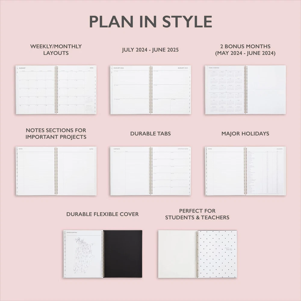 Blue Sky 2024-2025 Academic Year Weekly and Monthly Planner, 8.5” x 11”, Wirebound, Pippi (142574-A25) Plan your year in style with the beautiful color palette of the 2024-2025 academic year Pippi planner. This stylish weekly and monthly planner will keep you organized everywhere you go. Simple page designs add a touch of sophistication and offer plenty of room for all of your important information. Designed with practicality and ease of use in mind, this academic agenda's monthly calendar tabs allow for easy access to each month’s plans while weekly views offer ample writing space for detailing each day. Use this dated academic planner to keep track of your appointments, and to write down notes and ideas in one place. Durable coated tabbed dividers are long lasting and make accessing information a breeze. Premium quality covers and twin-wire binding provide reliable durability for daily use. Stay on track throughout the academic year with this portable 8.5” by 11” planner dated July 2024 - June 2025. Mix and match with other Bakah Blue Collection planning products from Blue Sky to organize your daily life. • Blue Sky creates modern and sophisticated organizational planners and calendars to fit the scheduling needs of busy people - whether it’s for business professionals, college students, teachers, or anyone with appointments to make note of. Keep your life organized with our full line of products including desk pad calendars, wirebound tabbed weekly and monthly planners with contacts and notes pages to accommodate your scheduling needs, and laminated two-sided wall calendars, all in a variety of colors and patterns to suit your lifestyle and personality. July 2024 - June 2025 planner with 12 months of monthly and weekly pages for easy academic planning and scheduling; 2 additional monthly pages (May 2024 - June 2024) are included Monthly view pages contain previous and next month reference calendars for long-term planning, and a notes section for important projects; Major holidays listed, elapsed and remaining days noted Weekly view pages offer ample lined writing space for more detailed planning, allowing you to keep track of your appointments, reminders, ideas and to-do lists every day of the week Yearly calendar layout includes a convenient list of holidays, reference pages, contacts pages and extra notes pages to accommodate your scheduling needs; Perfect for students and teachers Printed on high-quality white paper for clear writing, with premium quality covers in a beautiful pattern and durable, coated tabs that withstand constant use throughout the year Shipping from the USA All of our products are shipped from the USA, ensuring quick delivery to your destination. Payment We offer the following payment methods: PayPal, credit card, bank transfer, and eBay's secure payment system. Free Shipping & Free Returns Shipping within the USA is FREE. Additionally, any return is absolutely free for you. Risk-Free Purchase You have the option to return an item within 30 days without any justification. We cover the return shipping costs! Fast Shipping We ship immediately upon receipt of payment. Generally, the package is delivered within 2-3 days in the USA. If it takes longer, we will contact you. Quality and Costs Made in Europe, USA, China No customs fees or additional charges Total satisfaction guarantee Invoice with declared VAT available upon request in .pdf format Feedback Your feedback is very important to us. After you pay for your purchase, you will automatically receive positive feedback from us.
