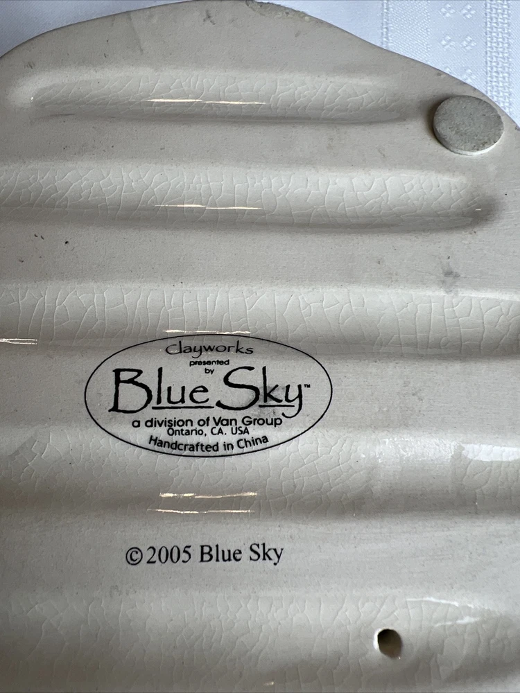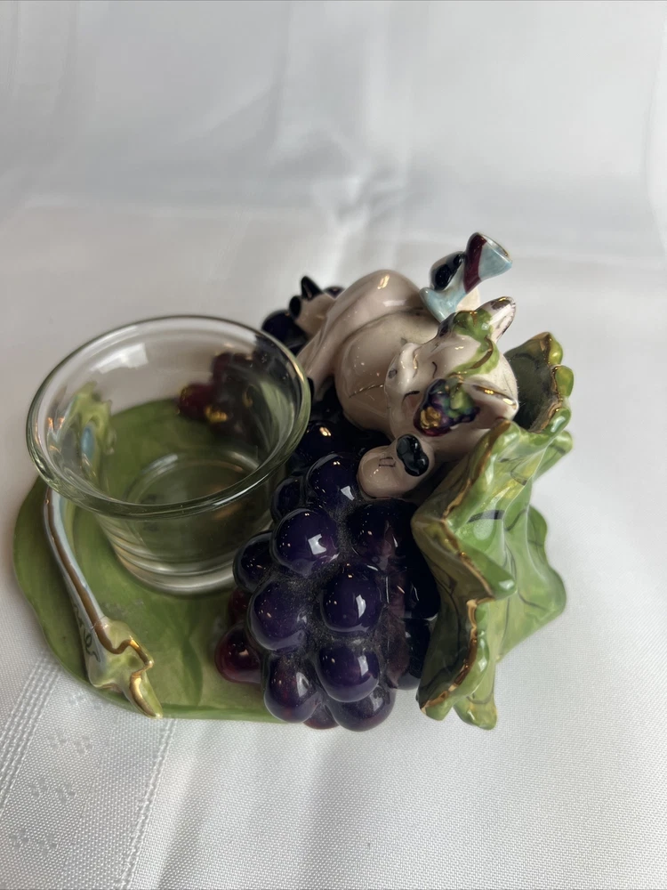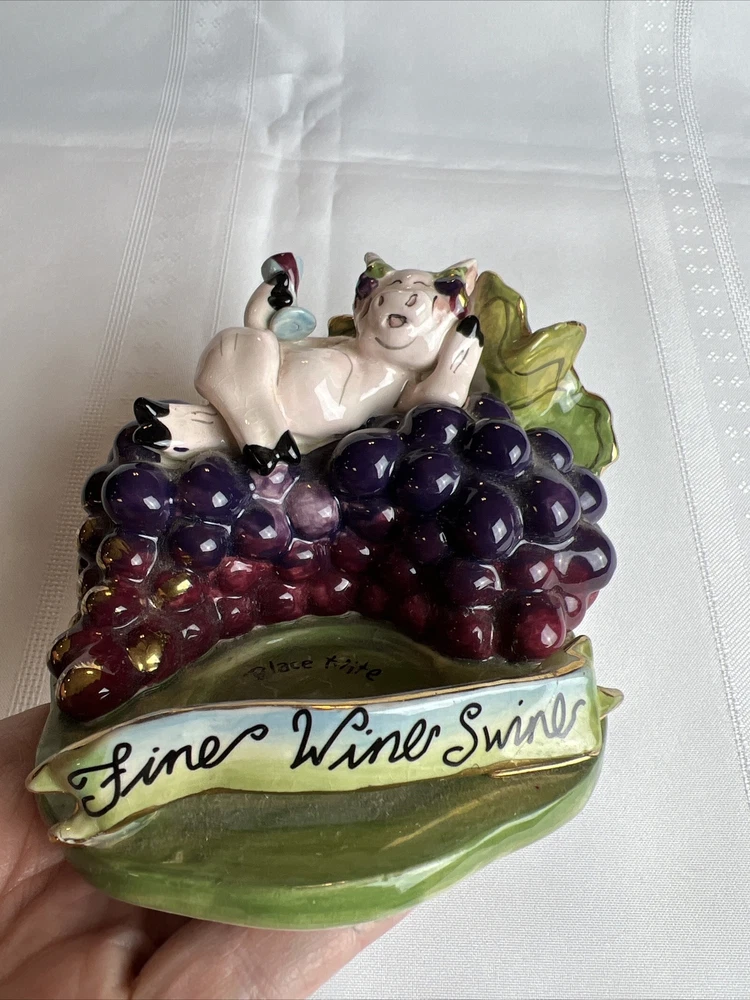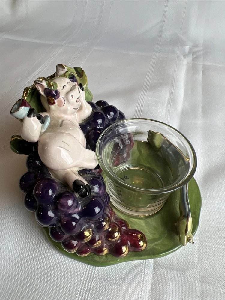 This Blue Sky Clay Works Pottery Fine Wine Swine Candle Holder is a licensed reproduction with glossy finish. The hand-molded stoneware piece is suitable for tea light candles and features a Wine Swine Figure pattern. The item dimensions are 5" length x 4" height x 4.25" width, and it weighs 1lb 1oz. The candle holder comes with a printed backstamp and belongs to the Blue Sky Pottery product line. The decorative piece is perfect for any room and adds a touch of whimsy to your decor. The Faience Pottery production style and pottery production technique used in China in the 21st Century (2000-2009) make it a unique addition to your collection. This item is not antique and is not handmade. See more TreasureHuggersUnlimited WillCombineShipping