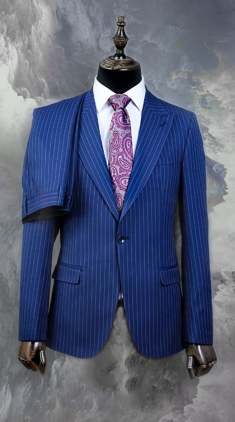 Blue Striped Men's Peak Lapel Suit Wedding Groom Tuxedo 2-Piece Set