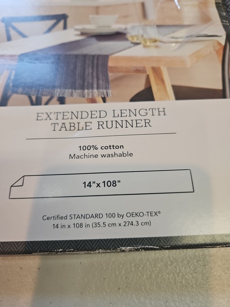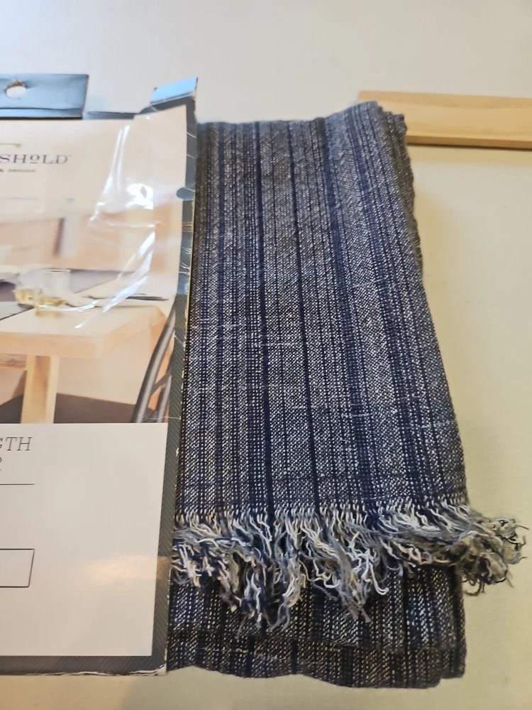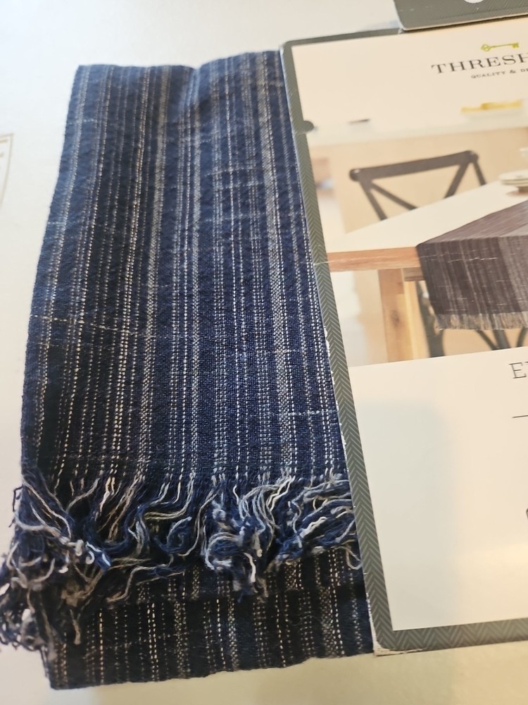 Add a touch of elegance to your dining table with this beautiful blue table runner from Threshold. Measuring 108 x 14 inches, it is perfect for any dining table and will complement any decor. Made from high-quality materials, this table runner is durable and easy to clean. Ideal for use in your home or office, this table runner is a must-have for anyone who wants to add a touch of style to their table setting. The Threshold brand is known for its quality and style, and this table runner is no exception. Whether you're hosting a dinner party or having a family meal, this table runner will make your table setting look stunning. New in wrapper Fringed From a smoke and pet free home.