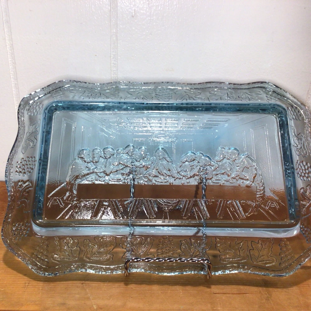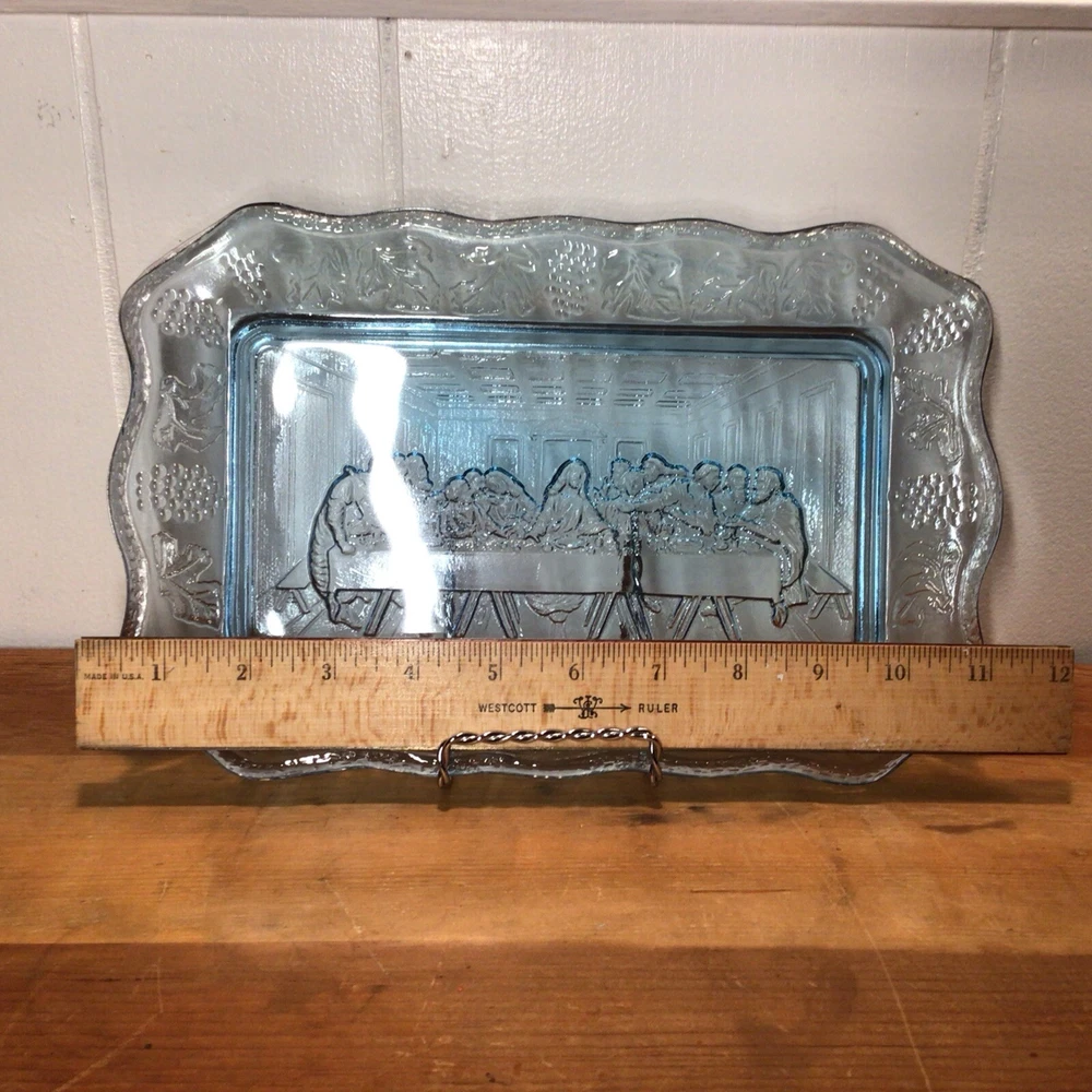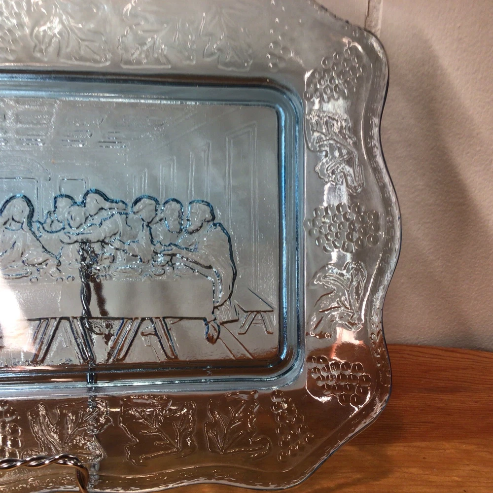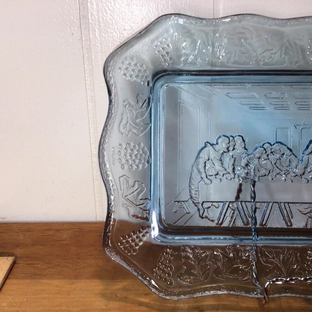 Brand: Indiana Glass Pattern: Vintage Set Includes: Tray Product Line: Last Supper Type of Glass: Depression Glass Production Style: Pressed Glass Production Technique: Fused Glass Handmade: No Occasion: All Occasions Color: Blue Antique: No Material: Glass Number of Items in Set: 1 Vintage: Yes Shape: Rectangle Type: Bread Plate Original/Licensed Reproduction: Original Origin: America Time Period Manufactured: 1970-1979 Country/Region of Manufacture: United States Theme: Jesus MPN: X