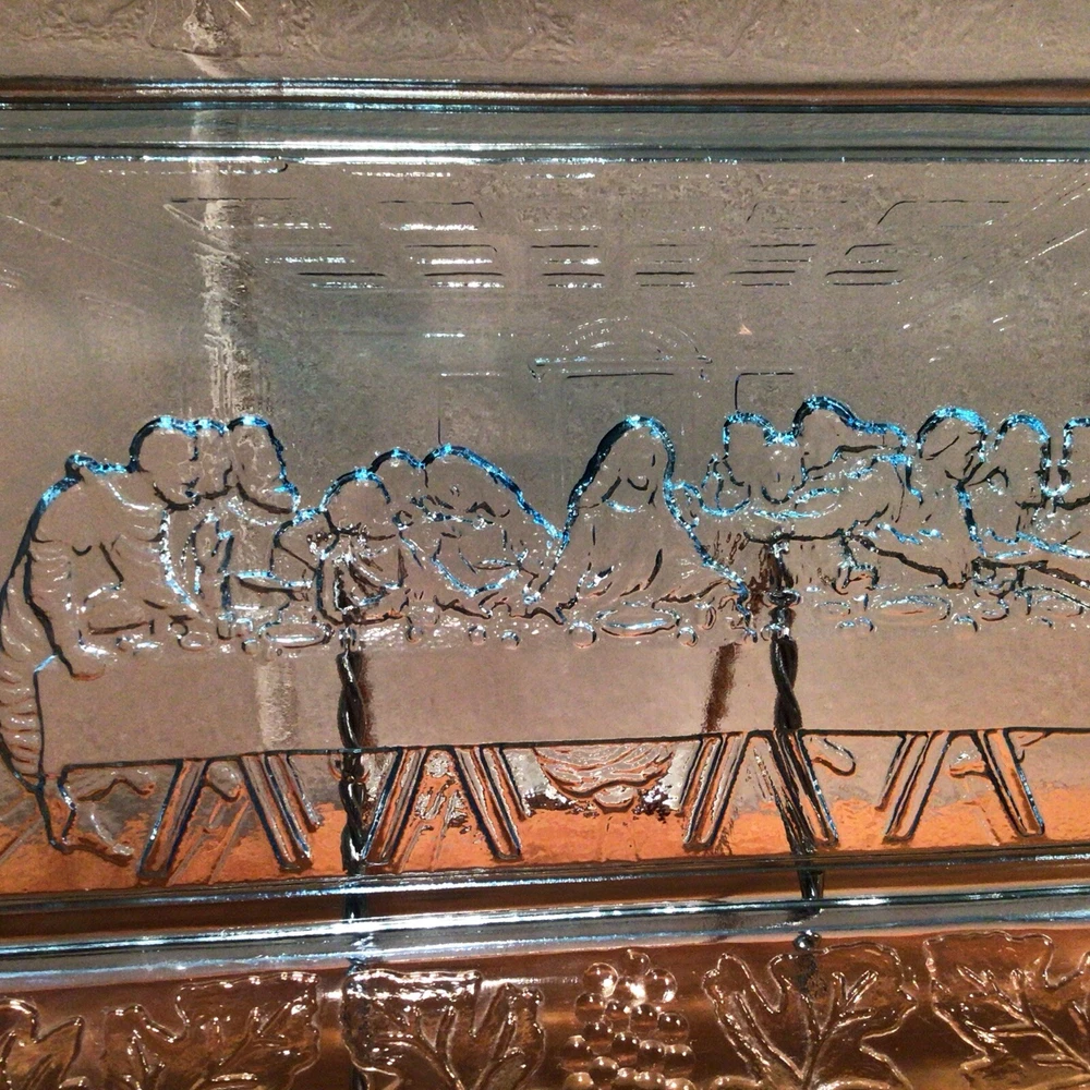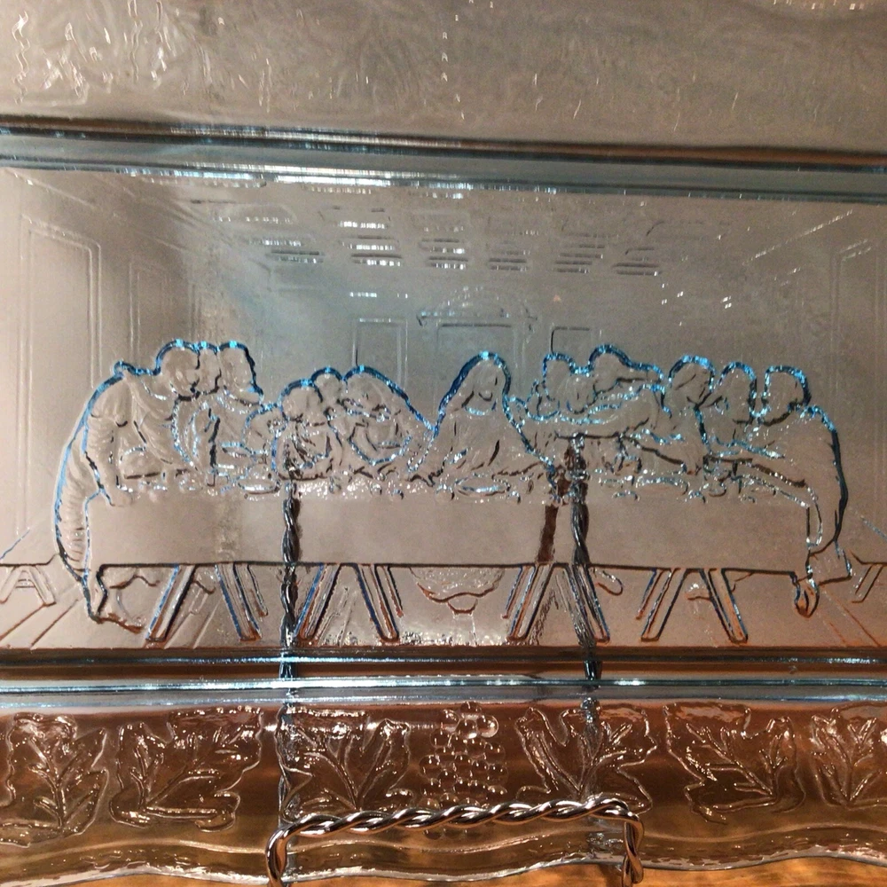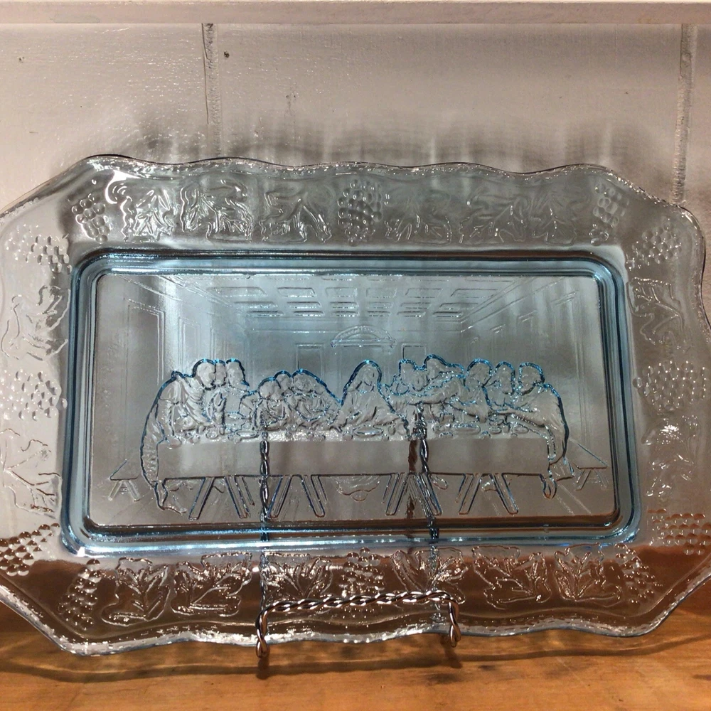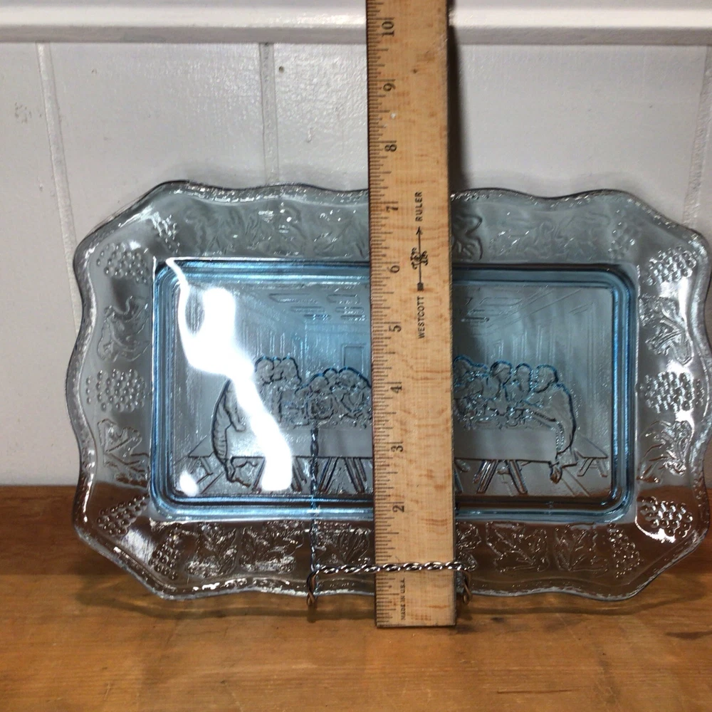 Brand: Indiana Glass Pattern: Vintage Set Includes: Tray Product Line: Last Supper Type of Glass: Depression Glass Production Style: Pressed Glass Production Technique: Fused Glass Handmade: No Occasion: All Occasions Color: Blue Antique: No Material: Glass Number of Items in Set: 1 Vintage: Yes Shape: Rectangle Type: Bread Plate Original/Licensed Reproduction: Original Origin: America Time Period Manufactured: 1970-1979 Country/Region of Manufacture: United States Theme: Jesus MPN: X
