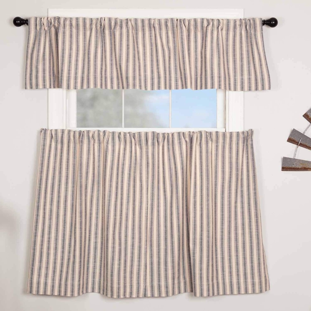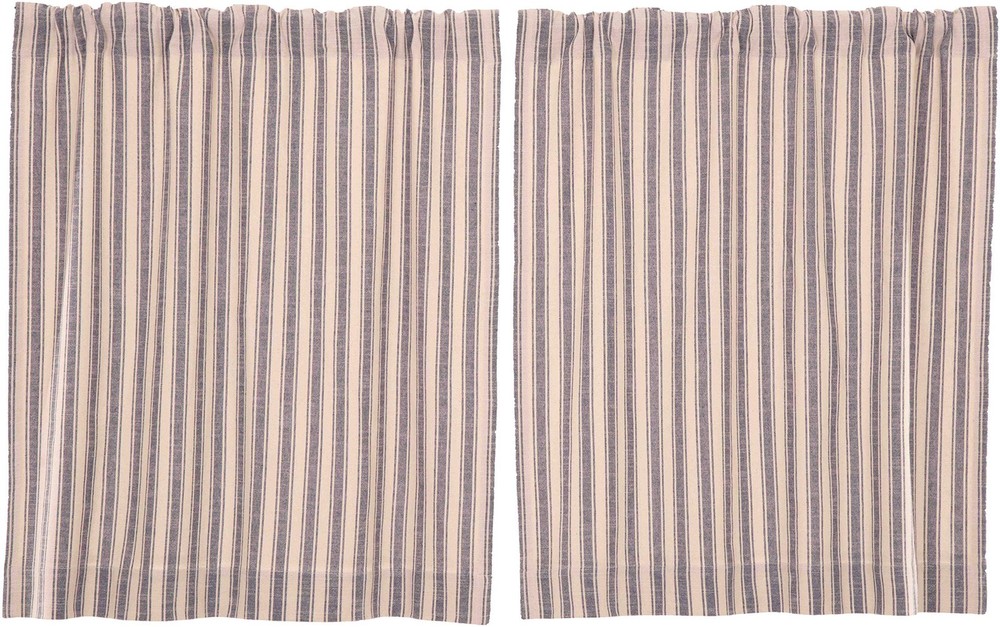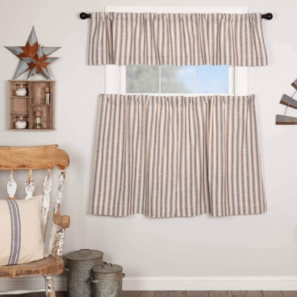 In today's farmhouse-style decor trend, ticking stripe fabrics are highly coveted, and our Market Place Collection features some of the best. Crafted from luxuriously textured cotton with a substantial weight and soft touch, our Market Place Blue Ticking Stripe 36" Curtain Tiers exude rustic charm. The woven ticking stripes in denim blue create a striking contrast against the natural cream base, adding timeless elegance to any space. Paired with a coordinating grain sack stripe fabric option, mixing and matching becomes effortless, allowing you to curate your ideal farmhouse-inspired look. Our ticking stripe tier curtains, lined with white cotton and featuring a 3.25" rod pocket with fabric loops for versatile hanging options, measure 36"L x 36"W each. Sold as a set of 2, their total width is 72". Elevate your farmhouse decor with these stylish and functional tier curtains, perfect for adding a finishing touch to your windows and enhancing the cozy ambiance of your home. 36" TIERS: Package contains 2 tier curtains, each measuring 36" LONG x 36" WIDE (72" total width) DENIM BLUE TICKING STRIPES are woven into a natural beige base for a classic vintage farmhouse style. It's the perfect finish to your farmhouse home décor. 100% Cotton IMPORTANT DETAILS: Lined with white cotton. Hang using either the 3.25" rod pocket or for a more modern and tailored style use the fabric back tabs. No header for a clean look. LIGHT FILTERING: Lined with white cotton to provide additional privacy while f COORDINATING HOME DECOR ACCESSORIES - All of our decor items are sold separately so that you can curate the perfect look for your home. Create your dream room by mixing and matching any of our Market Place items such as quilts, curtains, table runners, and more! MODERN FARMHOUSE STYLE: Elevate your space with versatile styling that effortlessly complements country chic, vintage farmhouse, or cottage decor. EASY CARE: Machine wash in cold water with like colors, gentle cycle. No chlorine bleach. Tumble dry low or hang to dry. Iron if needed.