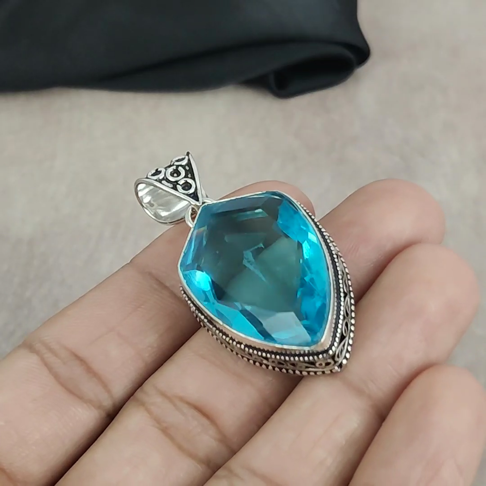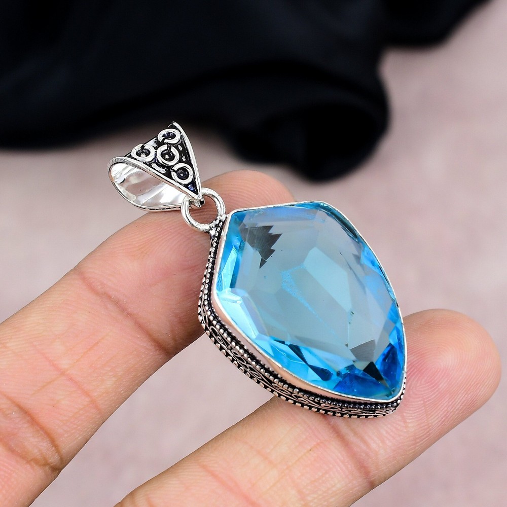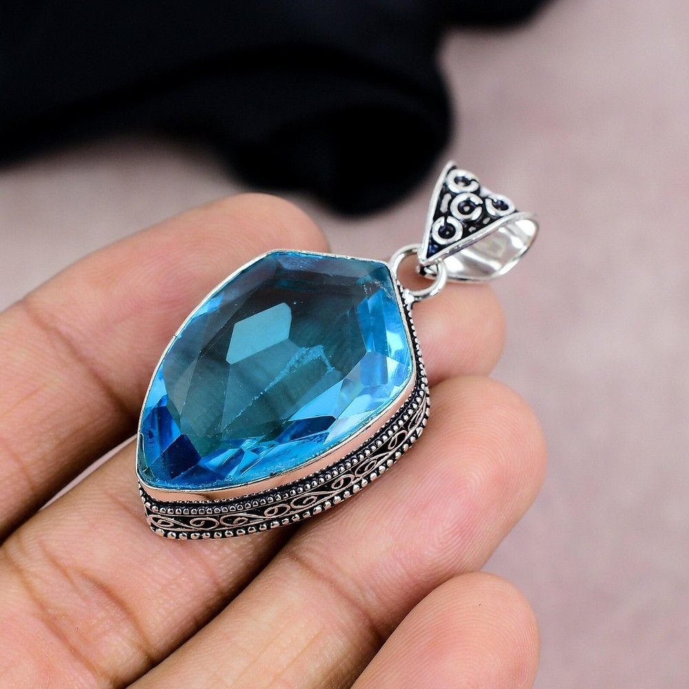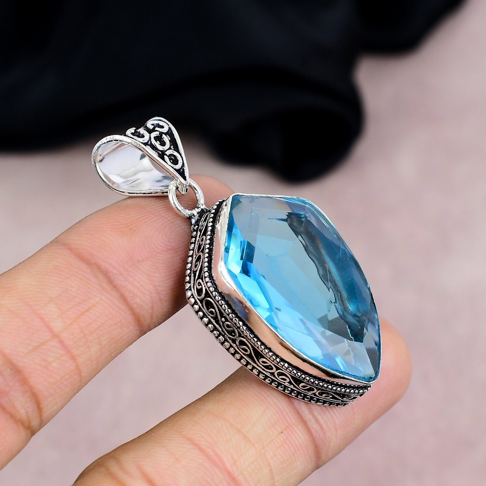 Brand:HandmadeMain Stone Shape:Same As PictureStyle:PendantDiamond Clarity Grade:N/AMaterial:GemstoneTotal Carat Weight:10 carat and aboveType:PendantClosure:Same As PictureCountry of Origin:IndiaDiamond Color Grade:N/AMain Stone Color:BlueSecondary Stone:N/AMain Stone:Blue TopazOccasion:Anniversary, Birthday, Christening, Christmas, Engagement, Father's Day, Graduation, Mother's Day, Valentine's Day, WeddingCut Grade:N/ANumber of Gemstones:1Pendant Shape:Same As PictureNecklace Length:5.1"Colored Diamond Intensity:N/APendant/Locket Type:Same As PictureChain Type:N/ACountry/Region of Manufacture:IndiaMain Stone Creation:NaturalSetting Style:BezelMain Stone Treatment:Not EnhancedCollection:HandmadeBase Metal:Sterling SilverNumber of Diamonds:N/AMetal:Sterling SilverTheme:Beauty, Bohemian, Ethnic, Halloween, Love, NatureColor:SilverMetal Purity:925Features:HandmadeCertification:N/A