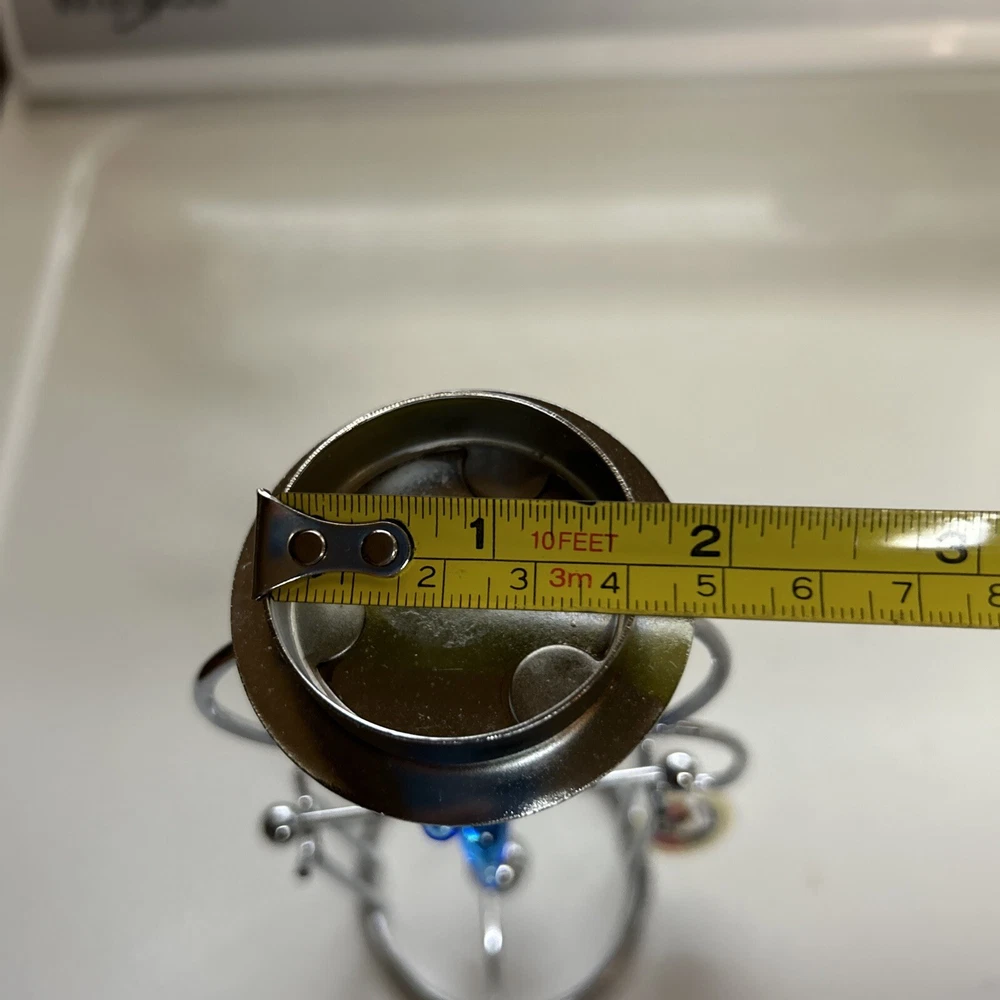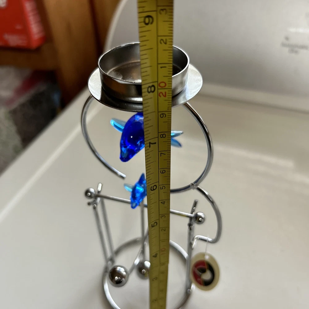 Add a touch of oceanic charm to your desk with this Blue Whale Shark kinetic motion desktop Candle decoration Tea-light. Crafted from resin and chrome, this medium-sized figurine is an asymmetrical shape with a height of 8 inches and a width of 4 inches. The blue color and marine theme make it a perfect addition to any room, including the office and bedroom. The figurine is a Whale Dolphin Figurine Kinetic Candle Holder, featuring a cute and cuddly dolphin design. It is made in China and is perfect for those who love sculptures and figurines. The item is a great gift for anyone who loves marine life and wants to add a unique touch to their home decor. New with tag Tealight NOT INCLUDED