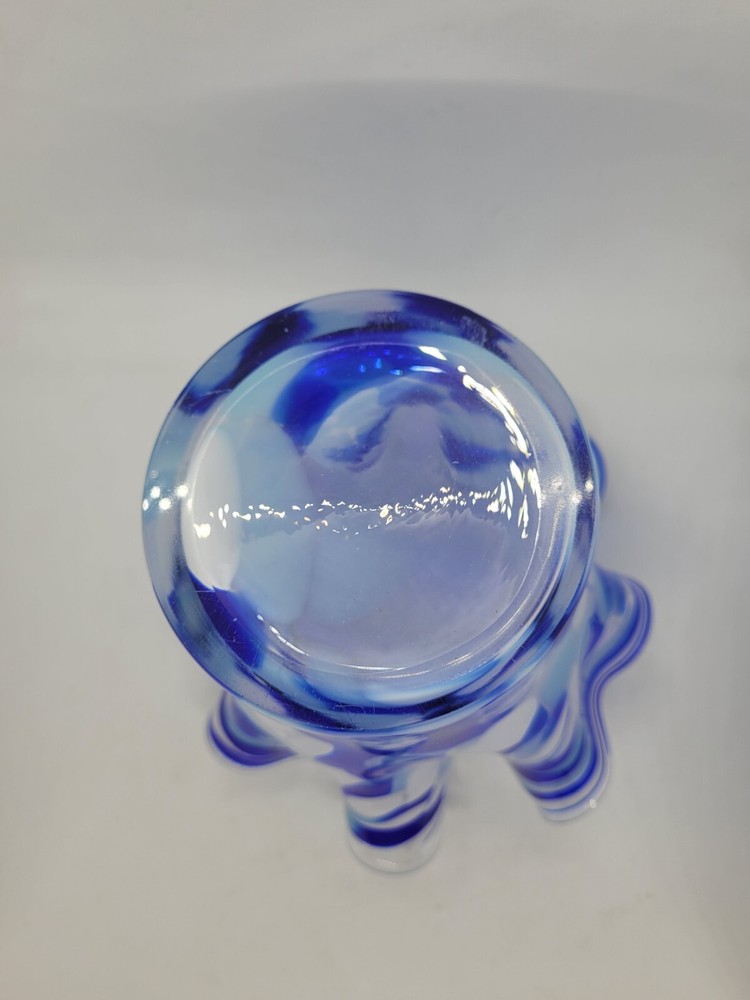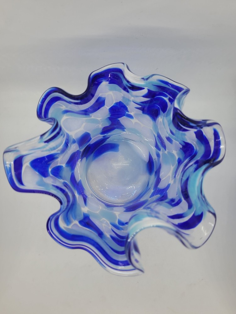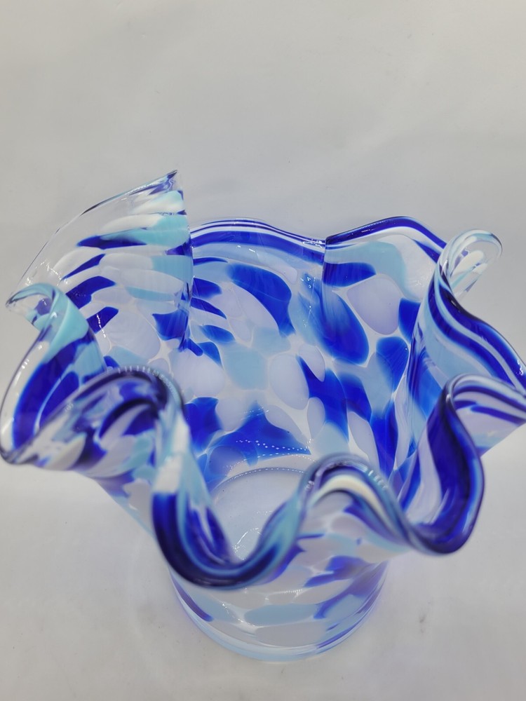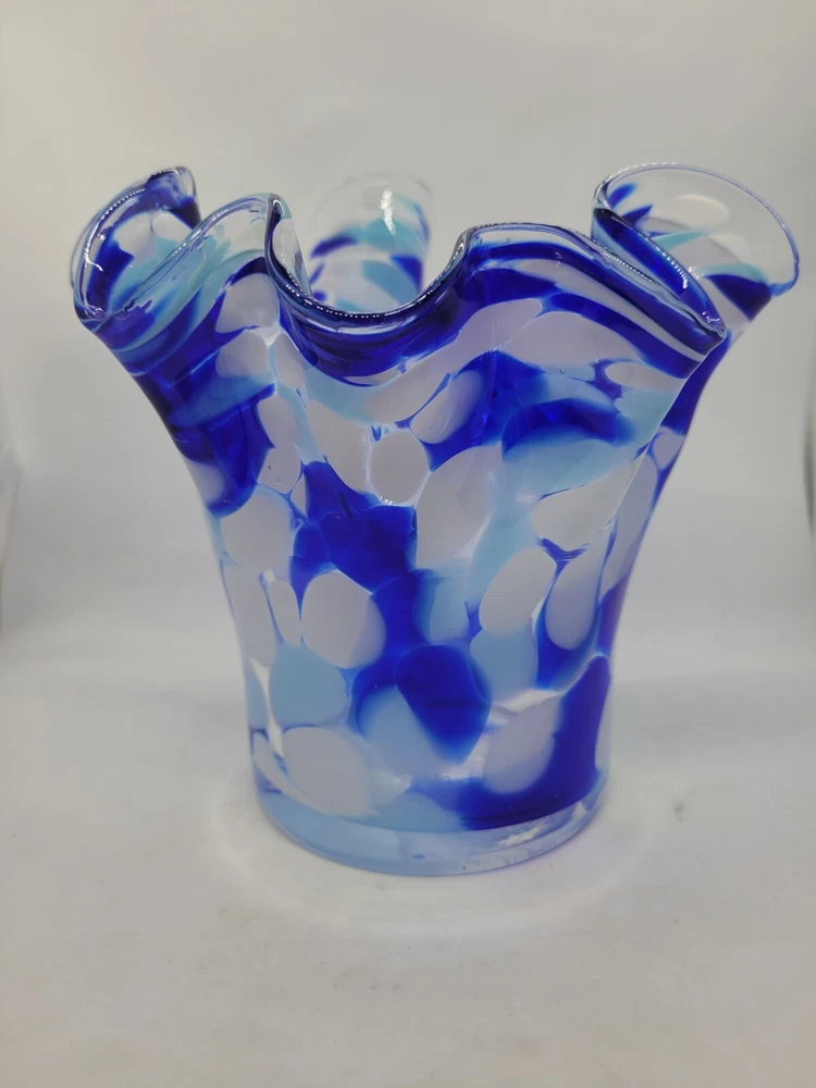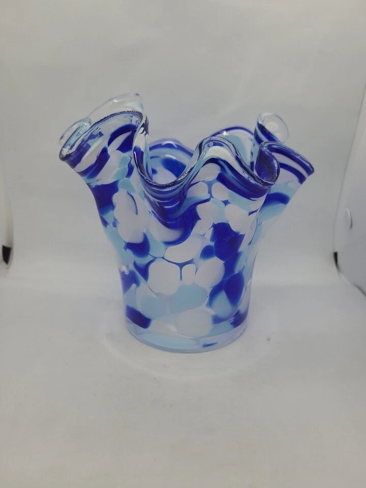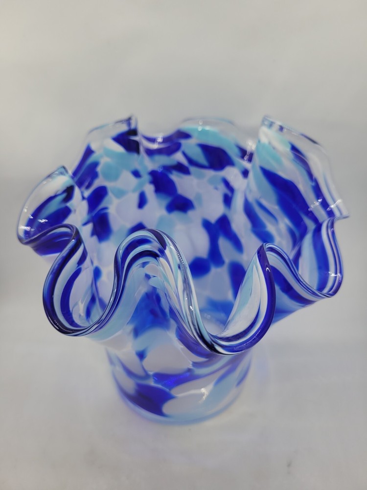Beautiful blown glass handkerchief vase. Multi colors of blue are interspersed with white and clear glass. Ruffled edges are a definite point of interest! Use by itself for home or office decor. Could also use for candles, tea lights, or flowers. This piece is unsined but I believe it to b Zorza glass.