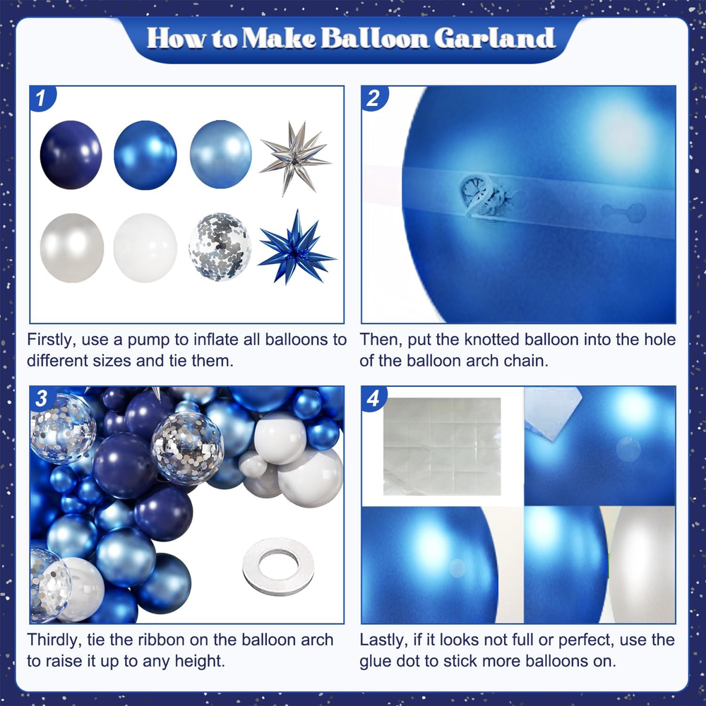 Store New Arrivals Add to Favorite View Feedback Contact OliverStore has been in the US market for over 5 years and offers free delivery to the customer's home with professional customer service Blue White Silver Balloon Garland Arch Kit, 140Pcs Navy Light Metallic Blue Silver White Confetti Balloons with Stars for Birthday Wedding Birdal Shower Graduation Fathers Day Party Decorations Description Package Includes: Navy Blue Balloon-5"*10/10"*10/12"*10/18"*1;Metallic Blue Balloon-5"*10/10"*15/12"*10/18"*1;Metallic Light Blue Balloon-5"*10/10"*15/12"*5/18"*1;Silver Balloon-5"*5/10"*10/12"*5;White Balloon-5"*5/10"*10;Cofetti Balloon-12"*10; Blue and Silver Foil Star-22"*2 Easy DIY Arch Kit: Create arches in any size or shape! For a fuller look (perfect for big events like Christmas, graduation, or birthdays), we recommend using 2+ sets—mix colors for a custom style Long-Lasting Latex Balloons: Made of natural latex, these balloons can be filled with air or helium and last 3-5 days. For best results, inflate to 80% capacity (overinflating may reduce durability) Perfect for Any Celebration: Birthdays, weddings, baby showers, bachelorette parties, gender reveals, Christmas, graduation, and more! Instantly brighten up your special day Helpful Tips: Keep balloons away from sharp objects, direct sunlight, and heat. Due to packaging, 1-3 out of 100 balloons may have slight variations (normal for latex balloons) Product description CPSIA Cautionary Statement No Warning Applicable Unit Count 140.0 Count Item dimensions L x W x H 5 x 5 x 5 inches Color Metallic Blue Silver Product Dimensions 5 x 5 x 5 inches Material Rubber Item Weight 12.3 ounces Theme party Manufacturer recommended age 10 years and up Occasion Birthday, Bridal Shower, Father's Day, Graduation, Retirement Special Feature Confetti Included Components Balloon Arch ABOUT US We offer the best prices around on high quality products. Our E-store includes media such as books, movies, music and games while offering electronics, toys, sporting apparel, clothing, tools, general home, garden items and more. SHIPPING We are always working hard to ensure your package arrives as soon as possible. Please understand that some factors like weather, high postal traffic, and the performance of shipping companies are outside of our control. We offer free shipping to the lower 48 states and ship within 2 business days of payment, usually sooner. We do not accept P.O. Boxes. Please provide a physical address. For shipping outside of the continental USA, we only use eBay's Global Shipping Program. The item is shipped to KY and then sent to the rest of the world. International customers are responsible for all duties and taxes. Continue to 'check out' to calculate costs for shipping the item to your country. Messages regarding eBay's Global Shipping Program MUST be directed at eBay EXCLUSIVELY. RETURNS We offer a 30-Day Return Policy on items in which you are not completely satisfied with. You have the option of a full-refund or an exchange of the item. No returns are available on items shipped outside of the USA PAYMENT We accept PayPal. CONTACT US This page content is yet to come Please ad us to your favorite seller and visit again later Thank You CUSTOMER SATISFACTION We try our very best to make sure every customer is completely satisfied. If there's a problem, message us! We're happy to help. WE ACCEPT