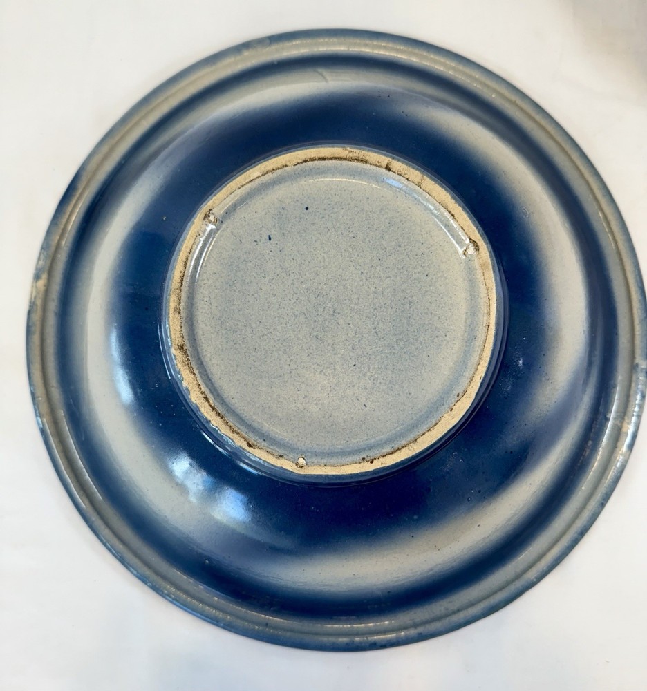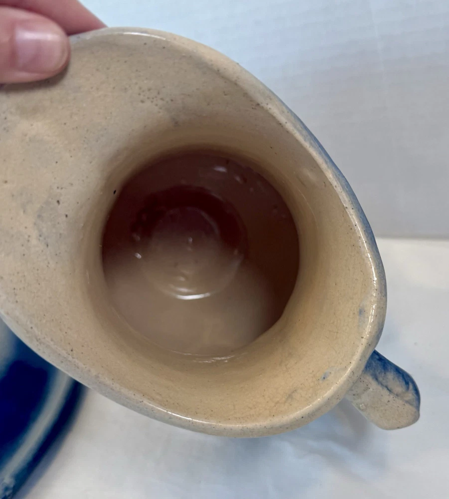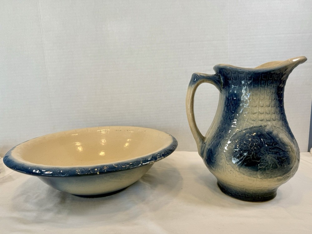 ** see pics for small chip (not all the way thru). This two-piece Blue & White Stoneware Wild Rose Pitcher & Bowl Basin Wash Bath Set is an antique Victorian-era piece handcrafted in the United States. The set features a beautiful fishscale and wild roses pattern on semi-gloss finish stoneware, with a blue color scheme. The pitcher and bowl are both round in shape, with the pitcher standing at 10 inches tall and the bowl having a diameter of 15.25 inches. This vintage wash set is perfect for all occasions and adds a touch of floral charm to any home decor.