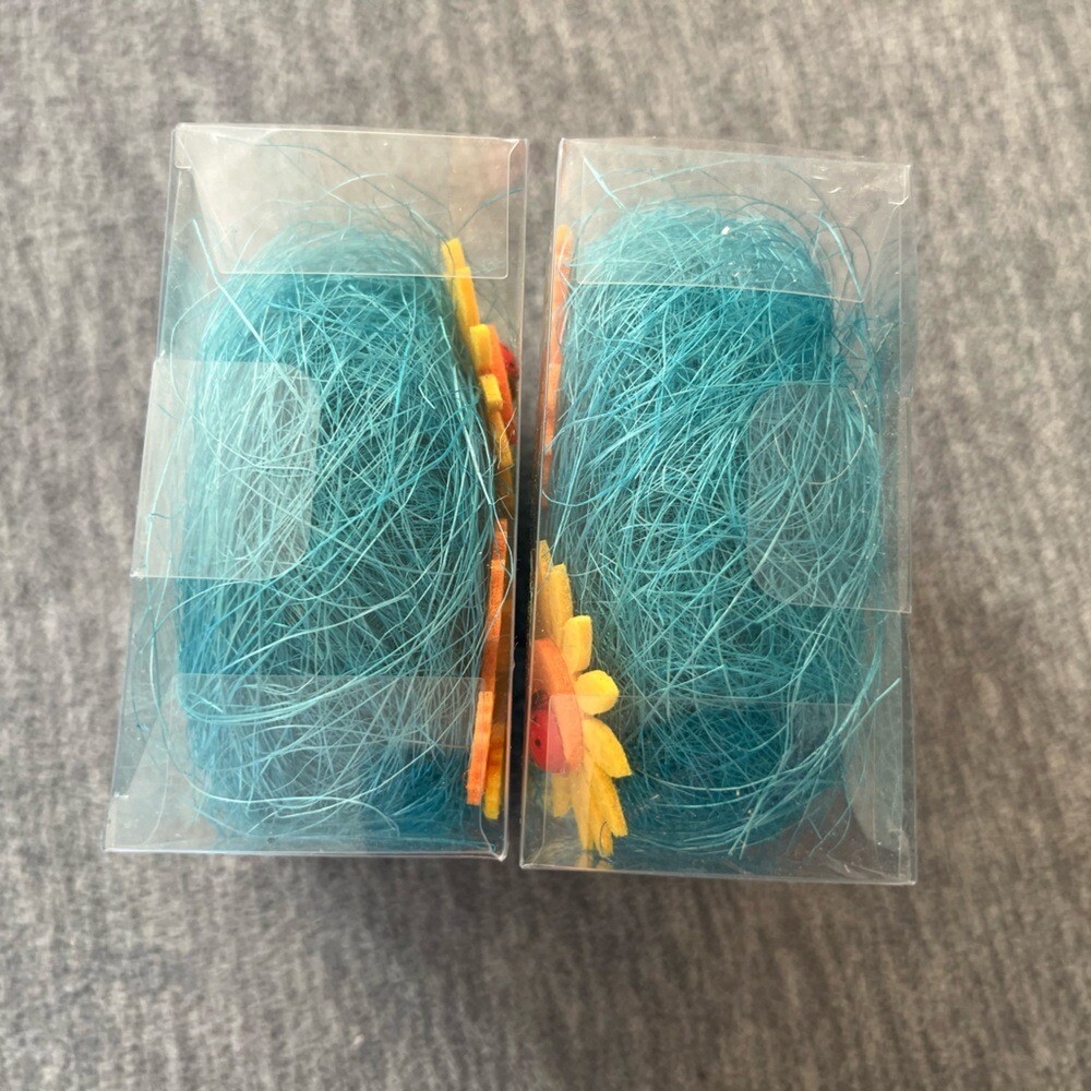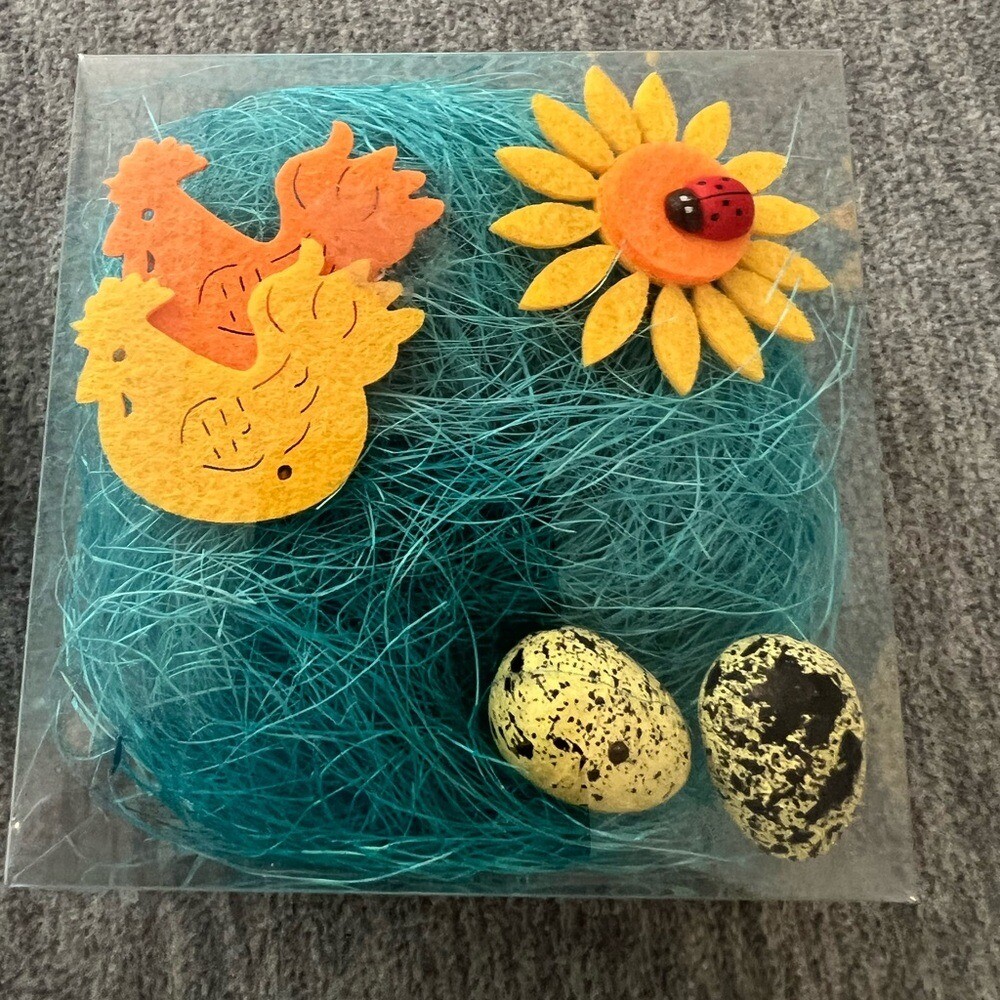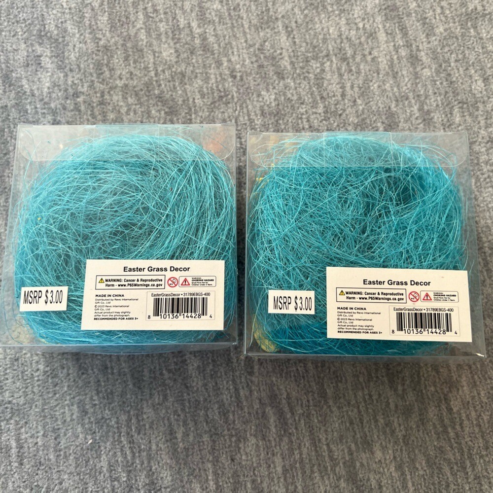 Two boxes of Easter basket/craft grass. Each box contains : one spool of colored grass, two felt rooster/chicken cut outs, one felt flower cut out, and 2 speckled eggs. Great for Easter baskets or crafts! I also have other colors available New in box Color- Blue My items are primarily thrifted and I do my very best to note any imperfections/callouts. My items are stored in a pet/smoke free home All reasonable offers are always welcomed and considered. I answer questions ASAP. Thanks for stopping in and looking! Lisa