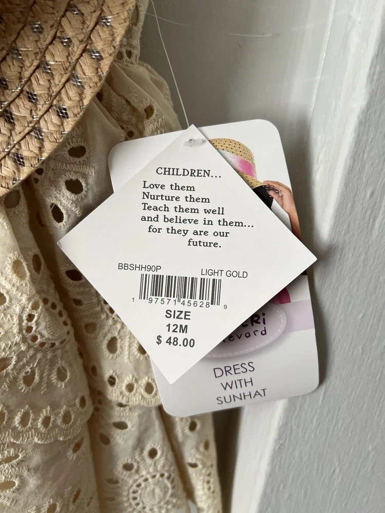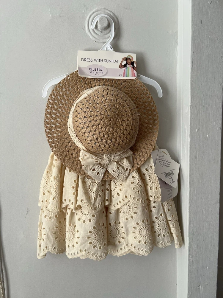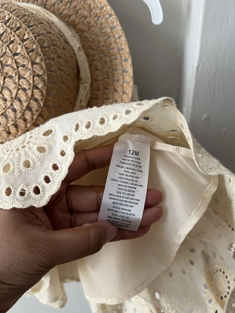 This Blueberi Boulevard Girls Sleeveless Beige Dress set features a floral pattern with a sleeveless design, perfect for summer, fall, or spring occasions. The dress has a button closure and is crafted from a blend of polyester and 100% linen, making it machine washable for easy care. The knee-length sweater dress comes in a size suitable for 12-month-old girls and includes a matching straw hat for a cute and stylish look. Ideal for parties, casual outings, or formal events, this outfit is a great addition to any little girl's wardrobe.