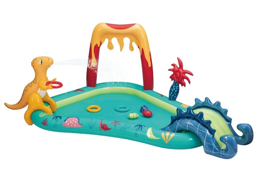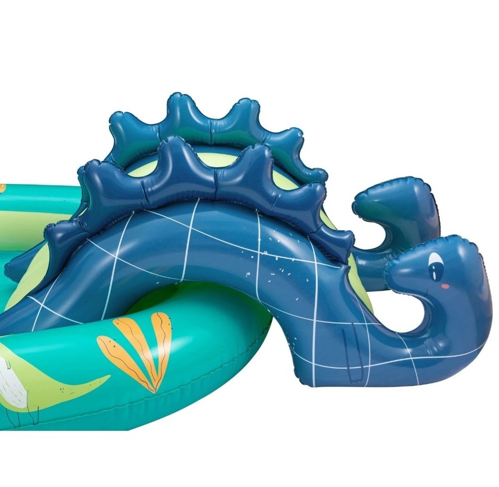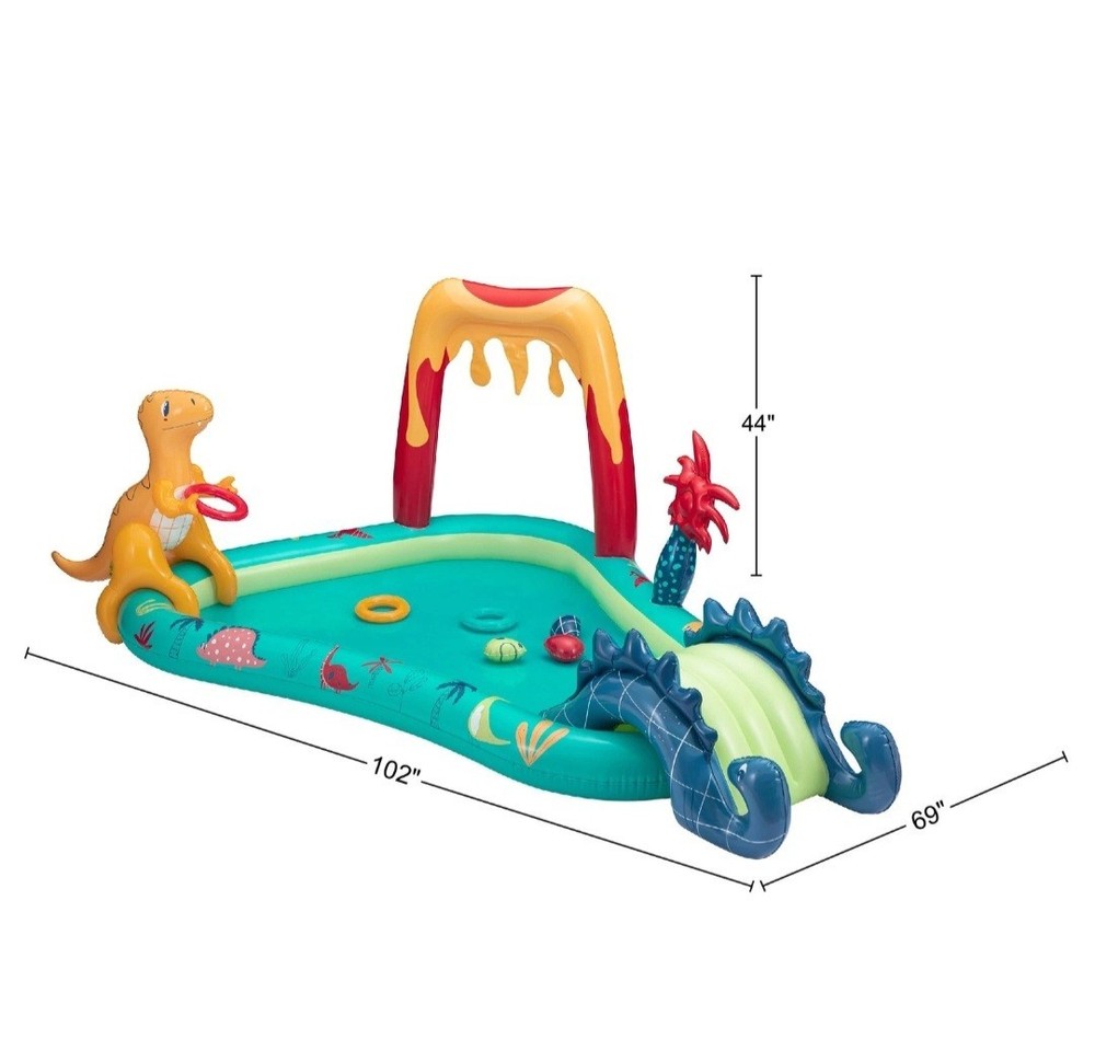 The Bluescape Dino Inflatable Play Center is a fun and vibrant kiddie pool with a sprinkler, toys, and slide, perfect for keeping children entertained during hot summer days. Made of durable PVC material, this circle-shaped play center stands at 102.00 x 69.00 x 44.00 inches tall, providing a safe and spacious environment for kids to play. The multi-color design and inclusion of a sprinkler add to the overall excitement of this inflatable play center, making it a hit with children and parents alike. With its puncture-resistant features and Bluescape brand reputation, this play center offers hours of joy for young swimmers.