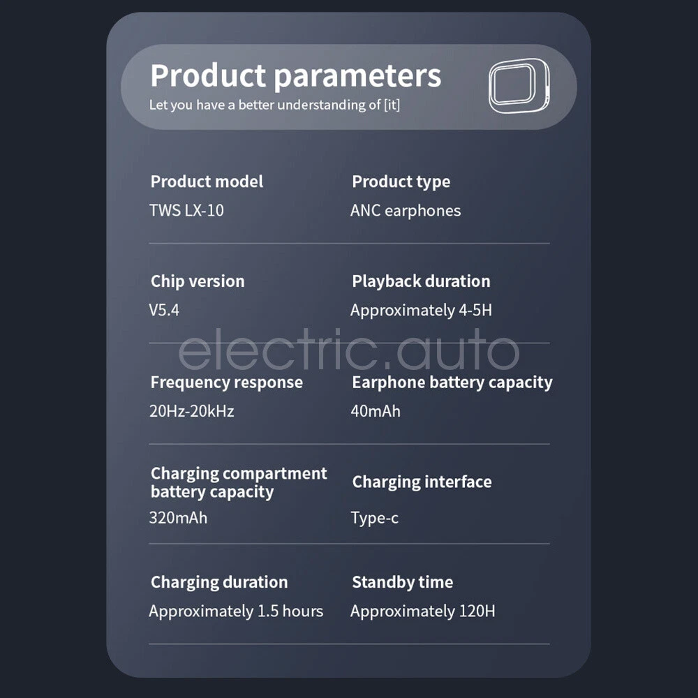 Product View Detail Features 1. Language settings. 2. Music control. 3. ANC noise reduction mode. 4. Uniformer setting. 5. Control interface style switching 6. Space audio. 7. Stop watch timer. 8. Lock screen wallpaper settings. 9. Headphone positioning search. 10. Time/date settings. 11. Call interface function. 12. Button operation display function. 13. Voice assistant. 14. Call reminder. 15. Supporting languages: English, Chinese Traditional, Simplified Chinese, Korean, Malay, Thai, Vietnamese, German, Spanish, Russian, Portuguese, Arabic, Turkish, French, Japanese. Specifications Product model: LX10 Bluetooth earphones Chip model: 5636F Bluetooth protocols: HFP, A2DP, HSP, AVRCP Audio decoding: AAC, SBC Bluetooth version: 5.4 Transmission distance: ≥ 10 meters (barrier free) ANC noise reduction: 37 decibels Horn specification: Φ F10mm composite film copper ring LCD screen: 2-inch touch screen Waterproof level: IPX level 5 waterproof Transmission rate: 24MBPS Call time: 4 hours Music time: 4-5 hours With charging case: 36 hours of playback Input voltage: DC5V1A Earphone battery capacity: 40mAh Charging compartment battery capacity: 320mAh Charging port: Type-c Charging time: 1.5 hours Product material: ABS Product color: black/white Package Included 2* Bluetooth earphones (left and right ears) 1* Charging compartment 1* User manual 4* Silicone Ear Cap 1* Type-c cable Tip: 1. Due to manual measurement, please allow an error of 1cm! 2. Due to different display resolutions, please consider slight color differences! Shipping Policy Payment Method Returns Policy Shipping Policy We only accept your Ebay Address ,Please Make sure it's 100% right. The items you ordered will be shipped out in 1 business day by Hong Kong Air Mail when your payment is clear. The arrival time is 5-20 business days to United States usually. We maintain high standards of excellence and strive for 100% customer satisfaction! Feedback is very important to us. We request that you contact us immediately BEFORE you give us neutralor negative feedback, so that we can satisfactorily address your concerns. Payment Method Returns Policy Copyright © 2017 DataCaciques Bluetooth 5.4 Earphone Full Touch Screen TWS Wireless Earbuds Noise Reduction Home Payment Shipping About us Contact us Store Categories Store Categories Consumer Electronics PC&Tablet Accessories Mobile Phone Accessories Sound&Vision Headphones Watches Camera Led Lights Others Auto Car Accessories Lights Others Motorcycle Motor Accessories Lights Others Headlamp&Torch Others Other Product View Detail Features 1. Language settings. 2. Music control. 3. ANC noise reduction mode. 4. Uniformer setting. 5. Control interface style switching 6. Space audio. 7. Stop watch timer. 8. Lock screen wallpaper settings. 9. Headphone positioning search. 10. Time/date settings. 11. Call interface function. 12. Button operation display function. 13. Voice assistant. 14. Call reminder. 15. Supporting languages: English, Chinese Traditional, Simplified Chinese, Korean, Malay, Thai, Vietnamese, German, Spanish, Russian, Portuguese, Arabic, Turkish, French, Japanese. Specifications Product model: LX10 Bluetooth earphones Chip model: 5636F Bluetooth protocols: HFP, A2DP, HSP, AVRCP Audio decoding: AAC, SBC Bluetooth version: 5.4 Transmission distance: ≥ 10 meters (barrier free) ANC noise reduction: 37 decibels Horn specification: Φ F10mm composite film copper ring LCD screen: 2-inch touch screen Waterproof level: IPX level 5 waterproof Transmission rate: 24MBPS Call time: 4 hours Music time: 4-5 hours With charging case: 36 hours of playback Input voltage: DC5V1A Earphone battery capacity: 40mAh Charging compartment battery capacity: 320mAh Charging port: Type-c Charging time: 1.5 hours Product material: ABS Product color: black/white Package Included 2* Bluetooth earphones (left and right ears) 1* Charging compartment 1* User manual 4* Silicone Ear Cap 1* Type-c cable Tip: 1. Due to manual measurement, please allow an error of 1cm! 2. Due to different display resolutions, please consider slight color differences! Shipping Policy Payment Method Returns Policy Shipping Policy We only accept your Ebay Address ,Please Make sure it's 100% right. The items you ordered will be shipped out in 1 business day by Hong Kong Air Mail when your payment is clear. The arrival time is 5-20 business days to United States usually. We maintain high standards of excellence and strive for 100% customer satisfaction! Feedback is very important to us. We request that you contact us immediately BEFORE you give us neutralor negative feedback, so that we can satisfactorily address your concerns. Payment Method Returns Policy Home Payment Shipping About us Contact us