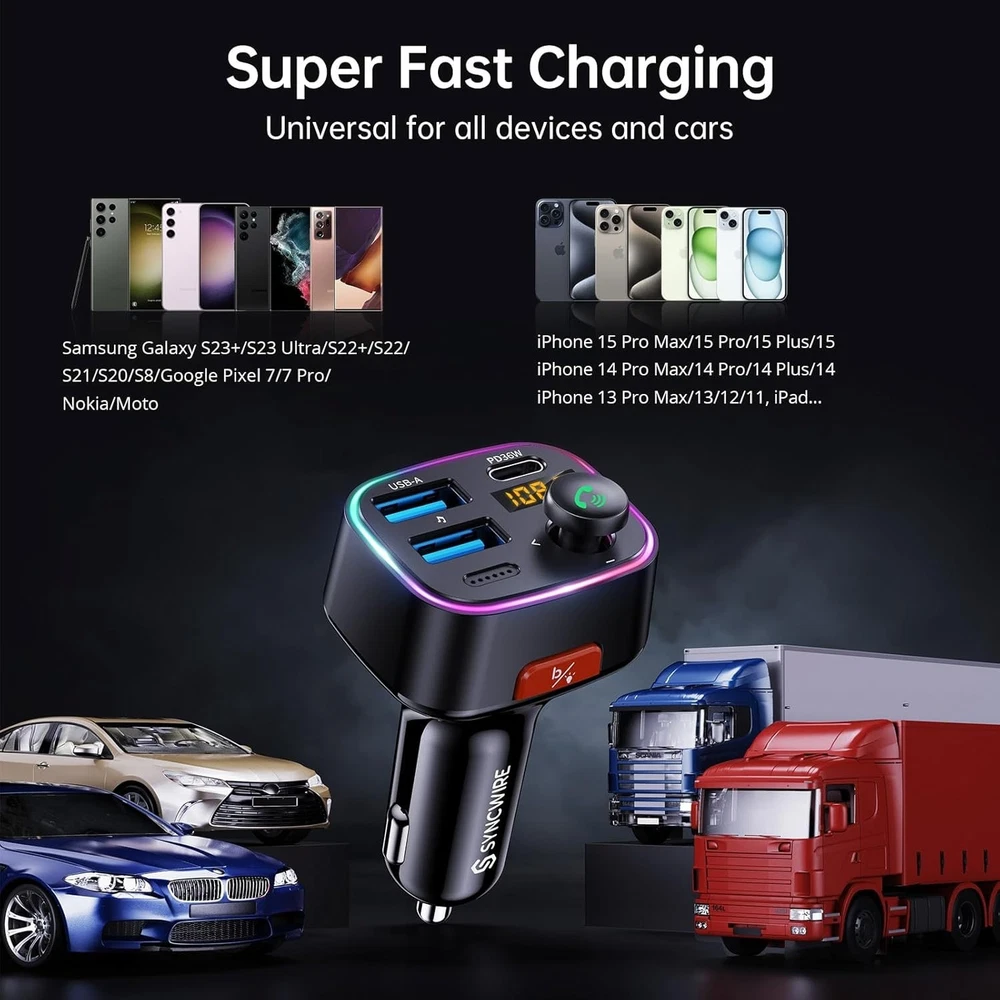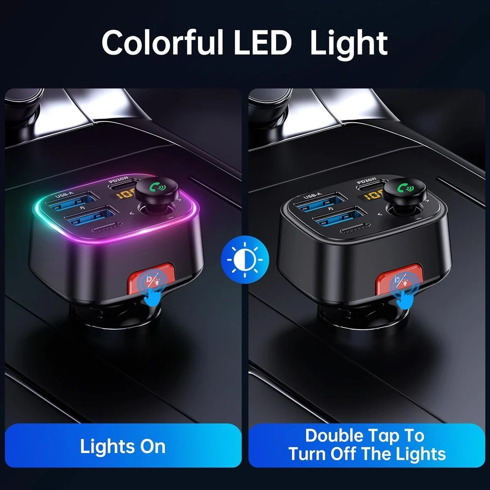 Bluetooth FM Transmitter Car Adapter 48W PD 36W & 12W [Light Switch] [HiFi Bass Sound] [Fast Charging] Wireless Radio Music Adapter LED Display Hands-Free Calling Support USB Drive [Humanized Ambient Light Switch Design] - Indulge in a delightful driving experience with our trendy rainbow light design. Immerse yourself in fun while having the convenience of easily turning off the light by double pressing the red "B" button when not needed. Enjoy the captivating ambiance of the rainbow lights and have full control over your driving atmosphere. [Upgraded Bluetooth Technology] - The latest Bluetooth technology, optimizing the transmission delay and connection defect problems, Bluetooth will bring you a faster, more stable and smarter connection with less sound quality loss, uninterrupted calls and music experience. It takes only 1 second to complete pairing, and no need to repeat pairing after the first successful pairing with your device. [Intelligent Dual USB Ports & Fast Charging] - Coming with 2 USB ports(PD 36W and USB A 12W), can charge two devices simultaneously. Built-in over-current protection, over-voltage protection, intelligent temperature control, short circuit protection, it will effectively ensure safe charging. [Great Clear Music Streaming] - Bluetooth provides a stable connection, while Noise Suppression (CVC) technology and echo-cancellation grant an amazing hands-free calling experience. In addition, this Bluetooth car adapter supports Bluetooth connection and USB stick connection (≤64GB). [Hi-Fi Deep Bass & Backlit] - Just press the button "B" and you will enjoy powerful deep bass and immersive sound. The high-fidelity Hi-Fi sound quality will also make the music more dynamic and pleasing to the ear, taking your passion for music to a new level. [Seamless Auto-Connection] - Once paired, the car bluetooth adapter automatically reconnects to your device every time you start your car—no need to re-pair. Enjoy a stable, low-latency connection with clear, high-quality audio and minimal interference. Simply find a clean FM frequency and you're set. The intuitive controls are designed for easy access, so you can make quick adjustments even while driving. [Exclusive Service] - If our cigarette lighter charger arrives doesn’t fit your car or doesn’t work, feel free to contact me to find a satisfying solution. We provide 36 s satisfaction and support. Visit the store