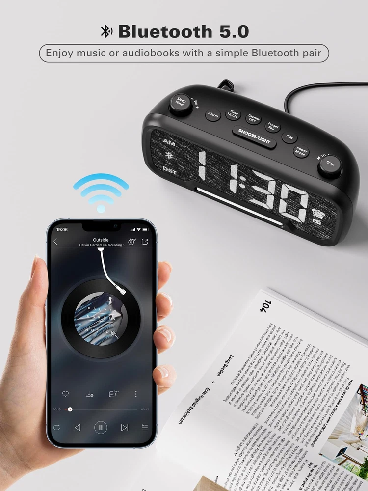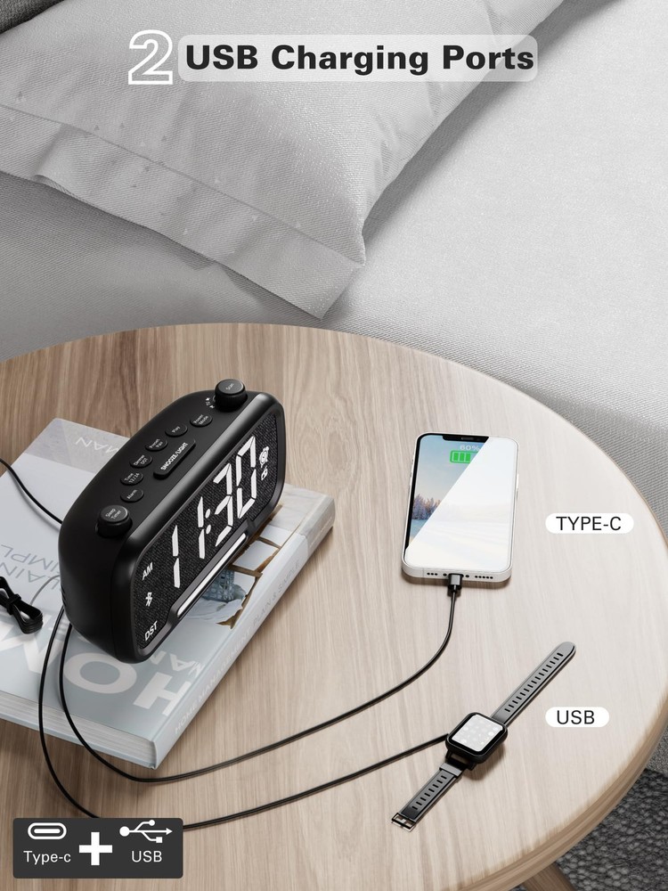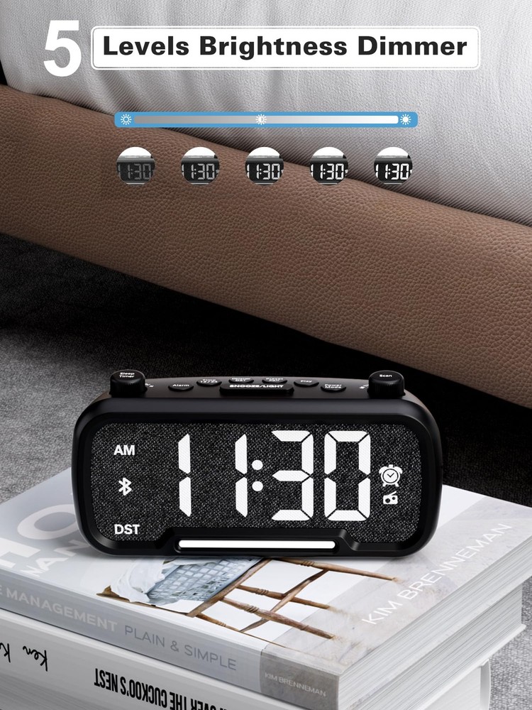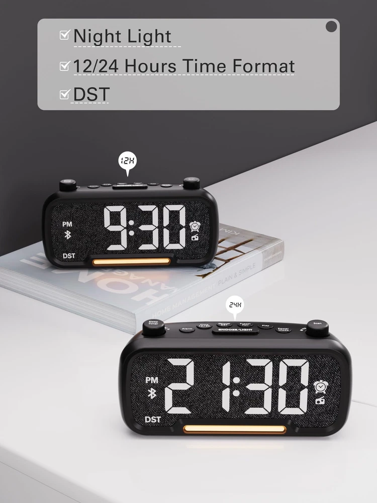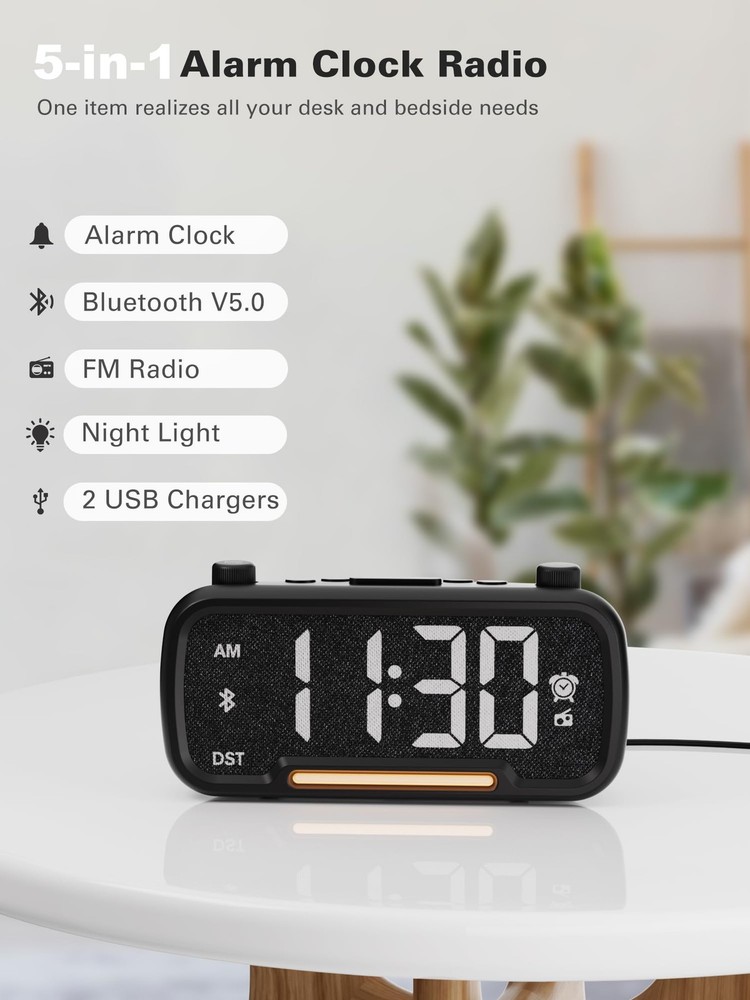 The digital alarm clock radio can help adults with heavy sleep get up on time. Suitable for bedrooms, bedside tables, living rooms and guest rooms. It's not only a digital alarm clock, but also a radio and a speaker. It is also a nice room decoration next to your bed, and no matter kids or adults can operate it easily. ⏰【Compact & Powerful Alarm Clock Radio】This space-saving bedside alarm clock (6.61"L×3.31"W×2.32"H) features a knitted fabric LED display, combining alarm clock, Bluetooth 5.0 connectivity, digital FM radio, 2 USB charger, and adjustable night light - perfect for small bedrooms, dorm rooms, office desks, and nightstand use. 📻【Digital FM Radio Alarm Clock with Clear Reception】 Enjoy crystal clear FM radio (87.5-108MHz) with easy auto-scan tuning and 20 station presets. Features 16-level adjustable volume for perfect sound control. Ideal as a bedroom alarm clock, kitchen radio, or office sound system - wake up to morning talk shows, enjoy background music, or stay updated with weather forecasts. Large LED display with night light dimmer for easy nighttime viewing. 🔌【Reliable Plug-In Alarm Clock】Requires AC power (adapter included) with battery backup to save settings. Features loud alarm with 9-minute snooze, 2 optional alarm sounds and 5 brightness levels - ideal for heavy sleepers, office workers, and elderly users. ⚡【Dual USB Charging Station with Soft Night Light】Conveniently charge your smartphone and tablet simultaneously via Type-C & USB-A ports (5V/1A each). Features a gentle fixed night light that creates a sleep-friendly environment, perfect for bedside charging in bedrooms, dorm rooms, or hotels. The compact design saves space while keeping your devices powered overnight. 🎁【Perfect Gift Choice Digital Clock Radio】This modern Bluetooth alarm clock (6.6×3.3×2.3 inches) features 12/24 hour format and DST adjustment for perfect timekeeping. With Bluetooth 5.0 wireless streaming, it fits any bedroom decor or workspace setup. Ideal for college dorms, home offices, and senior living - makes a practical housewarming gift, thoughtful retirement present, and essential office accessory.