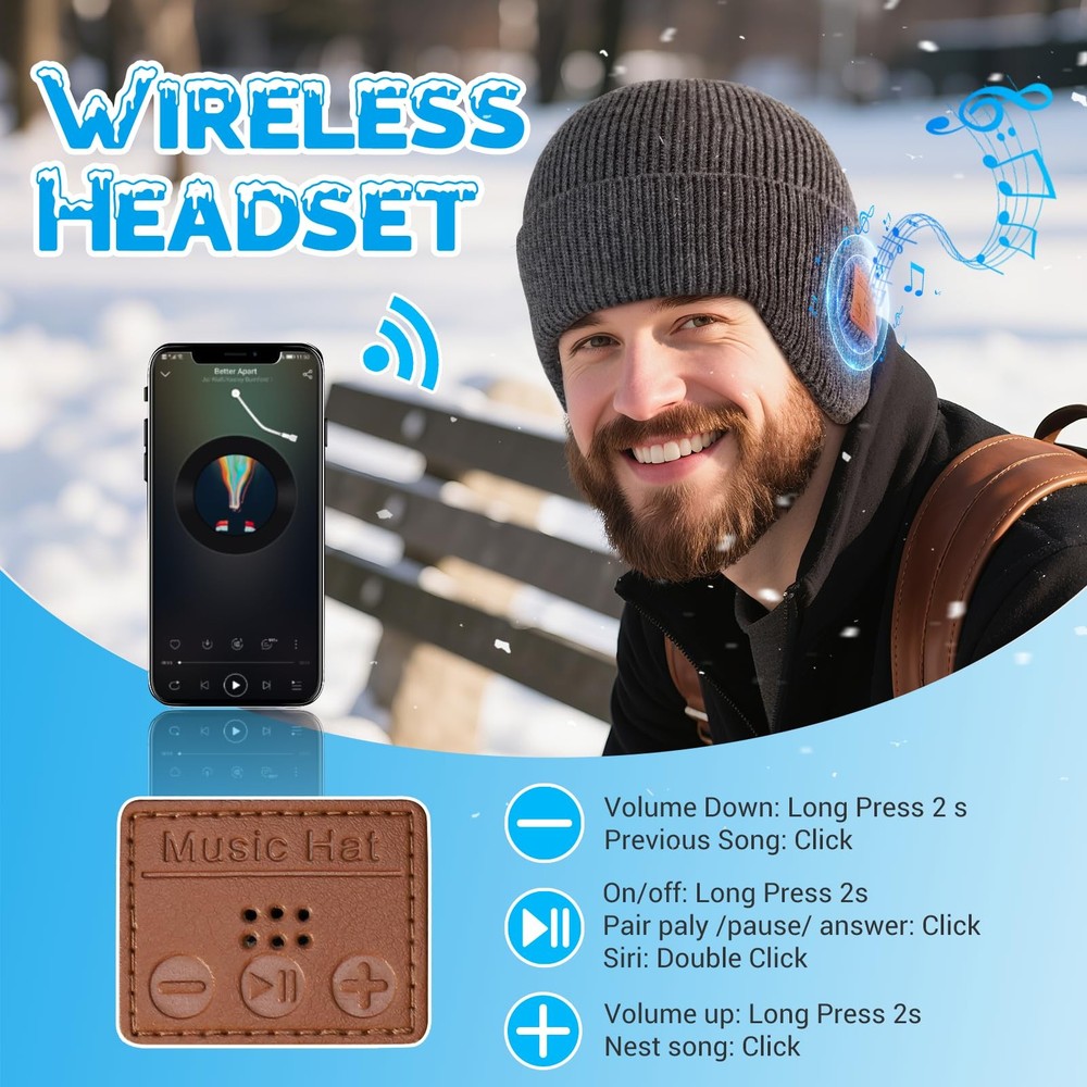 Bluetooth Beanie Hat with Headphones, Wireless Winter One Size, T-dark Grey Product Details 【Fashion, Cozy & Warm】TOUCH TWO Bluetooth Beanie provides maximum comfort and warmth in cold weather, while the innovative beanie with built-in headphones delivers an exceptional music experience. It is the perfect and stylish Bluetooth beanie for various outdoor activities during winter. 【Excellent HiFi Sound Quality】The beanie with bluetooth headphones built-in two high-quality speakers with HiFi sound quality offer up to 110Db HD stereo sound. Clear and loud sound quality without having to fear that the earphones will fall out - enjoy your playlist and take your calls anytime, anywhere! 【Upgrade Bluetooth Chip Set】Our Bluetooth beanie with Bluetooth V5.4 technology offer the most stable and strongest connection with any Bluetooth-enabled devices and automatically connect to your last paired device. 33 feet wireless range, easy and fast to pair with your smartphone or tablet. Also 3-button easy control on music, calls, activate siri. 【Longest Working Time】Built-in rechargeable Li-Ion battery, charging time is 1.5-2 hours, can provide longest continuous working time up to 8 hours for wireless music or 10 hours of hand-free call, perfect for camping, hiking, running, cycling. (Type-C charging cable included) 【Great Value Gifts & Washable】This Bluetooth beanie for men women and teens is the top birthday, thanksgiving gifts or stocking stuffers. Keeping you warm in style-there are no tangled cords to get in your way! Also, the music hat is fully washable after taking out the headphone.