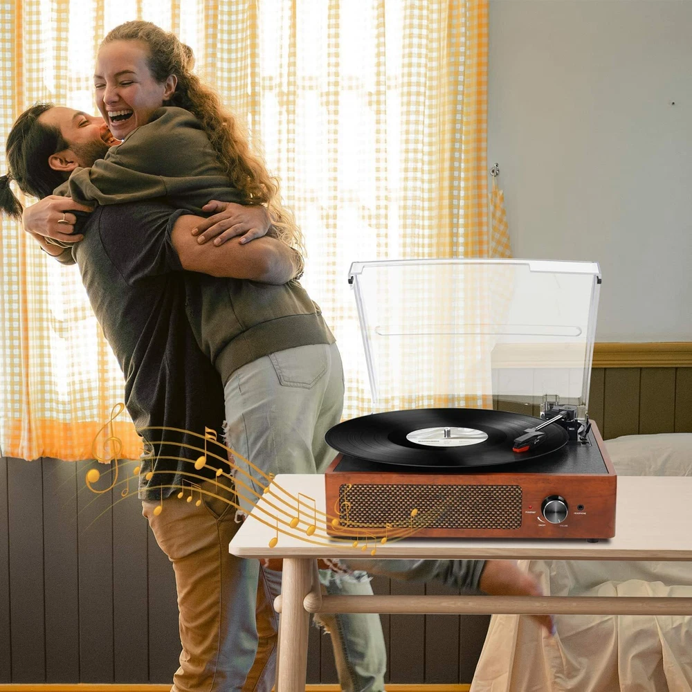 ✅【All-in-one Record Player】Bluetooth Input & AUX Audio input & RCA out put. Built in 2 stereo speakers with Bluetooth wireless technology,elegantly listen to the music from your smart phone. Or use Aux input cable which included in package to play the music of CD player,Smartphone,Digital media player, or other audio sources directly . For better or louder sound, connect external speaker via RCA cable which included in package. ✅【Vinyl Record Player】Easy to use, simple setup and operation. Great ideal for vinyl lovers. Three-speed Turntable (33, 45, 78 RPM) plays all of your 7" 10" 12" vinyl records. And it comes with 45RPM adapter, no problem for playing any of your favourite vinyl records or albums. ✅【Record Player Bluetooth Turntable with Speakers】 Built-in Bluetooth receiver & stereo speakers,,you can listen to your favorite music from your Bluetooth compatible device like smartphone with ease. Just Bluetooth in connect and play! ✅【Portable Record Player】There is a removable cover on the top to protect vinyl and turntable plat. You can shut the cover shields and keep the dust out. And the beautiful textured exterior are a perfect fit for any environment. 🎁【Vintage Record Player】It creates a warm atmosphere when family gatherings. When you are alone, it can help you relax. Even if you don't use it, it can be one of the home's premium decorations. As a gift, it also allows the recipient to feel your heart. Go Back To Vintage Vinyl Turntable Great Gift of Choice & for Beginners The vinyl record play can not only play vinyls/albums but also play your favourite digital songs with extra functions like headphone listening, Aux-in and RCA-out connection, and Bluetooth input. Even if you don't use it, it can be one of the home's premium decorations. As a gift, it also allows the recipient to feel your heart. RCA-out Connection RCA-out connection: There is one RCA output cable included in package. It can hook up your external speaker via RCA cable to get louder sound. Bluetooth Input Connection Bluetooth Input: Wireless connection allows to stream your favourite digital songs from devices like smartphone, tablet, laptop through the turntable’s speakers. Aux-in Connection Aux-in connection : There is one Aux input cable included in package. Easily connect this turntable with your phone/ipad via Aux cable, it works as a powerful speaker. Solid & Warm Premium Sound Bulit-in 2 stereo speakers: It provides you with solid and warm sound experience. Decorated with high quality grid: It would better output the stereo sound. Auto-Stop Switch Auto-stop switch: If you need the record stop automatically when finshed, just switches it to "ON", no worry about scratch your record. Durable Ruby Stylus: it comes with built-in needle, easy to use, no worry about skipping. Removable Dust Cover : able to make your record keep clean and new. 45RPM adapter is included 3-Speed Vinyl Player for 3-Size 3-Speed Vinyl Player for 3-Size: It supports 33 1/3, 45, 78RPM with 7" 10" 12" sizes, And 45RPM adapter is included.