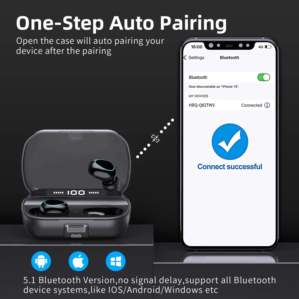 【Bluetooth 5.1 & One-Step Pairing 】The latest Bluetooth 5.1 with TWS technology on both bluetooth earbuds, provides faster pairing, stable connection and signal transmission (32ft no-obstacle range). Only need to take out two earbuds or any single earbud after you open Bluetooth function, they will open and connect automatically. Powerful Bluetooth 5.1 chip that perfectly matches tablets, laptops, iOS, and Android smartphones! 【IPX7 Waterproof Bluetooth Earbud】Wireless earphones are certified with IPX7 waterproof rating and nano-coating materials which prevent any splashes and water penetration.With ergonomics and sports design, it can be firmly fixed in the ear canal even during strenuous exercise. Very suitable for use during exercise. 【Hi-Fi Stereo Sound Quality】Wireless earbuds has the built-in high-quality audio chip and 10mm dynamic speakers for more delicate sound processing. Equipped with the latest CVC 8.0 noise reduction technology to give you a crystal clarity sound quality and 3D deep bass stereo, Making you feel personally on the scene of music during sports, running or hiking even in a loud environment. 【LED Display & 3500mAh Charging Case】Bluetooth earbuds Charging Case adopted LED battery display design, it'll indicate how much battery remaining in the charging case.about 5-6 hours continuous music playtime for a single full charge(only 1.5h charge time). Charging Case Equipped with 3500mAh Ultra Large Capacity battery , You can also use the charging case as a mobile power source to charge mobile phones or other mobile devices. 【Guarantee Return Policy & Package】3 months return policy provided. If for any reason you're not completely satisfied with our wireless Bluetooth earbuds, please don't hesitate to contact us. Package content: Earphones, Charging Case, Charging Cable, Ear Tips (S, M, L), User Manual