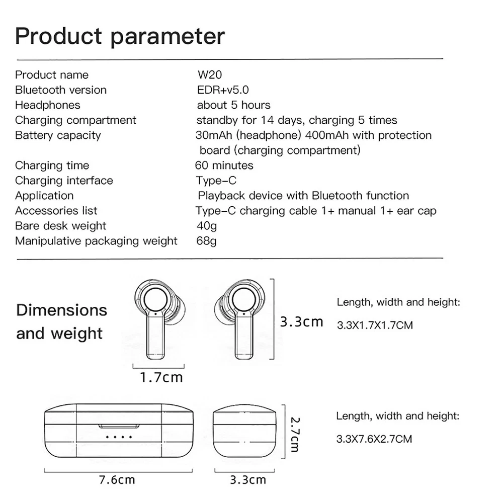 Feature: -100% new, high quality. -Wireless Bluetooth 5.0 Mini Headphone Microphone Headset Hands-free calling. -The latest Bluetooth headset is small and portable. Simple and stylish -Intelligent designed to hold your lace in place, stylish and comfortable. -The built-in audio processing system eliminates noise and echo very well, making it ideal for listening or watching at work. -It provides you with wireless freedom and provides you with the most comfortable wearing experience. Specification: Bluetooth version: Bluetooth 5.0 Bluetooth frequency: 2.4GHz Output power: 30mW Operating voltage range: 3.0V-4.2V Talk time: 6 hours Music time: 6 hours Standby time: about 210 hours Charging time: about 1 hours Transmission range: 10 meters or more Charging Box Battery capacity 400MAH Earphones Battery capacity 30MAH Package List: 2 X Bluetooth Headphones 1 X Charging Box 1 X Charging Cable 1 X Pair of Ear cap 1 X Manual