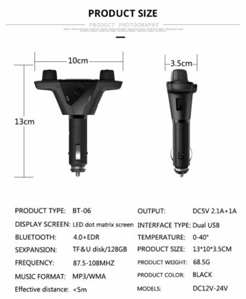 Bluetooth Car FM Transmitter MP3 Player Hands free Radio Adapter Kit USB Charger Bluetooth Car FM Transmitter MP3 Player Hands free Radio Adapter Kit USB Charger Description: - Bluetooth version 4.0, support for Bluetooth call hands-free, Bluetooth music transmission, caller ID; - Support TF card (Micro SD card) / USB Flash player (reader function), support MP3 / WMA music format; - Dual-charge USB port DC5V / 2.1A expandable portable device features for all mobile phones, tablets and other electronic charging products; -1.3 inch dot matrix LED display, frequency point display, file name and status information work; - Support UMA menu setting language setting, play mode and sound mode; - Memory support power failure and folder playback; -AUX input and output function; - car battery voltage indication; -FM frequency range: 87.5 MHz to 108 MHz -Automatic power-off memory function - Supported languages: Chinese, English, French, Spanish, German, Portuguese, Italian, Dutch, Swedish, Russian Specification: -FM Transmitter Mode: Stereo Digital PLL Lock - Rated operating voltage: 12 V-24 V. - LED screen size: 1.3 inches -USB output: 5V / 2.1A 5V / 1.0A - Working temperature: 0-40 degrees Celsius - Support game format: MP3 / WMA -TF / USB flash storage: <128 GB -Signal to noise ratio: > 60db - Distortion: <0.1% - Frequency response: Hz-15 20 Khz - Left and right channel separation: > 60db -BT version: version 4.0 + EDR -Bluetooth transmission distance: 10M -Bluetooth effective range: 0.5-2 M - Bluetooth sound processing: A2DP (Advanced Audio Distribution Profile) - FM transmission frequency: 87.5-108 Mhz - Product size: 13 * 10 * 3.5 cm - Net weight: 68.5G Package Included: -1 Bluetooth Car MP3 Player -1 user manual -1 fuse -1 AUX audio cable Operation guide: - Plug the FM transmitter into the car cigarette lighter socket to supply power. Please find this device. - Find an empty station and keep the FM transmitter and the car FM radio at the same frequency. On Feb 11, 2025 at 00:21:53 PST, seller added the following information: