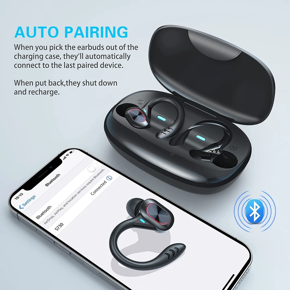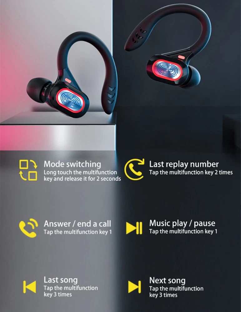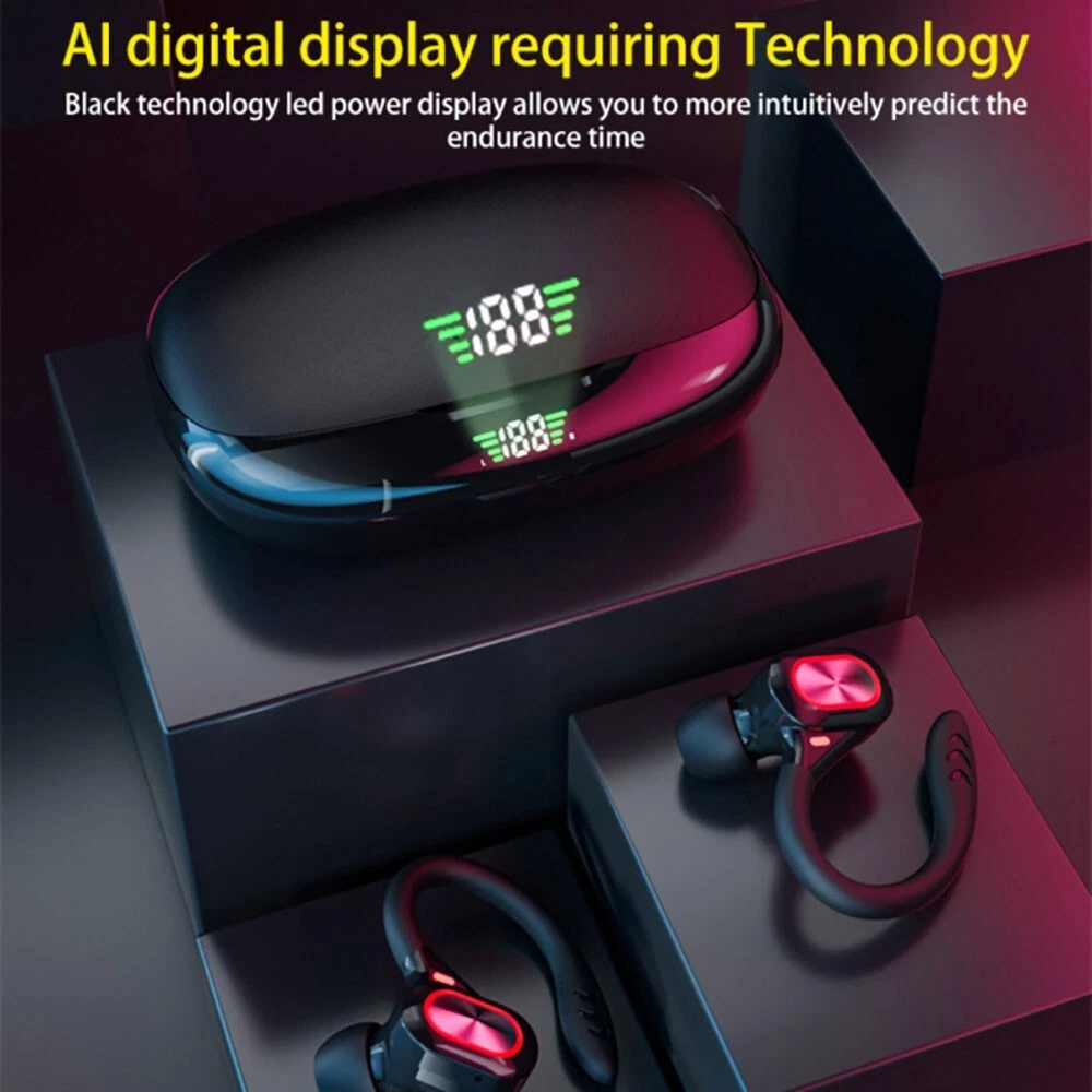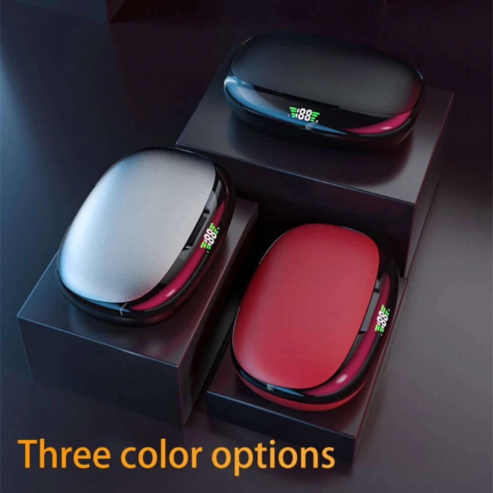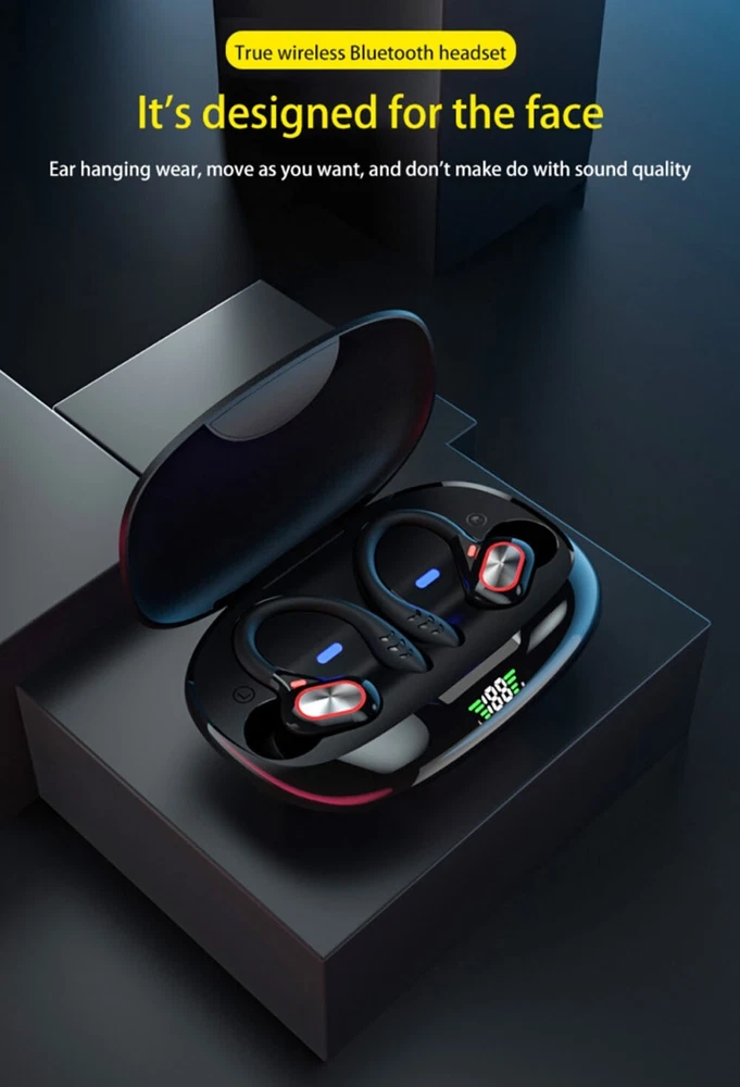 Features: -100% brand new and high-quality made. -Silicone Earhook for Sports,ensure your headphones fit comfortably in ear. -Bluetooth 5.2 chip technology and 10mm drivers let you experience crystal clear HD stereo sound and powerful bass. -It comes with charging box, easy to charge. LED Digital Power Display: show the battery level of the charging case and earbuds. -Just take the bluetooth headphone out of the charging box, open your bluetooth, connect with it. When you put it back, the earphones shut down and are recharging. -The headset could automatically power on and match the phone after picked up, eliminating the troublesome operation of manual startup and pairing. -Touch control technology: you can easily play/pause/skip music, answer/end/reject calls or activate voice assistant with simple-tap operating. -The built-in audio processing system eliminates noise and echo very well, making it ideal for listening or watching at work. -It provides you with wireless freedom and provides you with the most comfortable wearing experience. Specification: -Bluetooth version: Bluetooth 5.2 -Transmission distance: 10m -Charging box battery capacity: 800mAH -Listening time: About 4 hours (single use with full battery) -Charging time of headset: About 40 minutes -Charging time of charging box: about 1H -Frequency band/band: 2.4-2.485GHz -Maximum transmitted power: +2DBm -Color: Black, Gray, Red. Package Included: 2 X Wireless Bluetooth Headsets 1 X Charging Box 1 X Type C Charging Cable 2 X Pair of Ear cap 1 X Manual