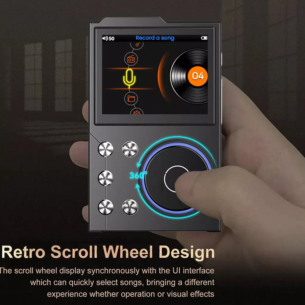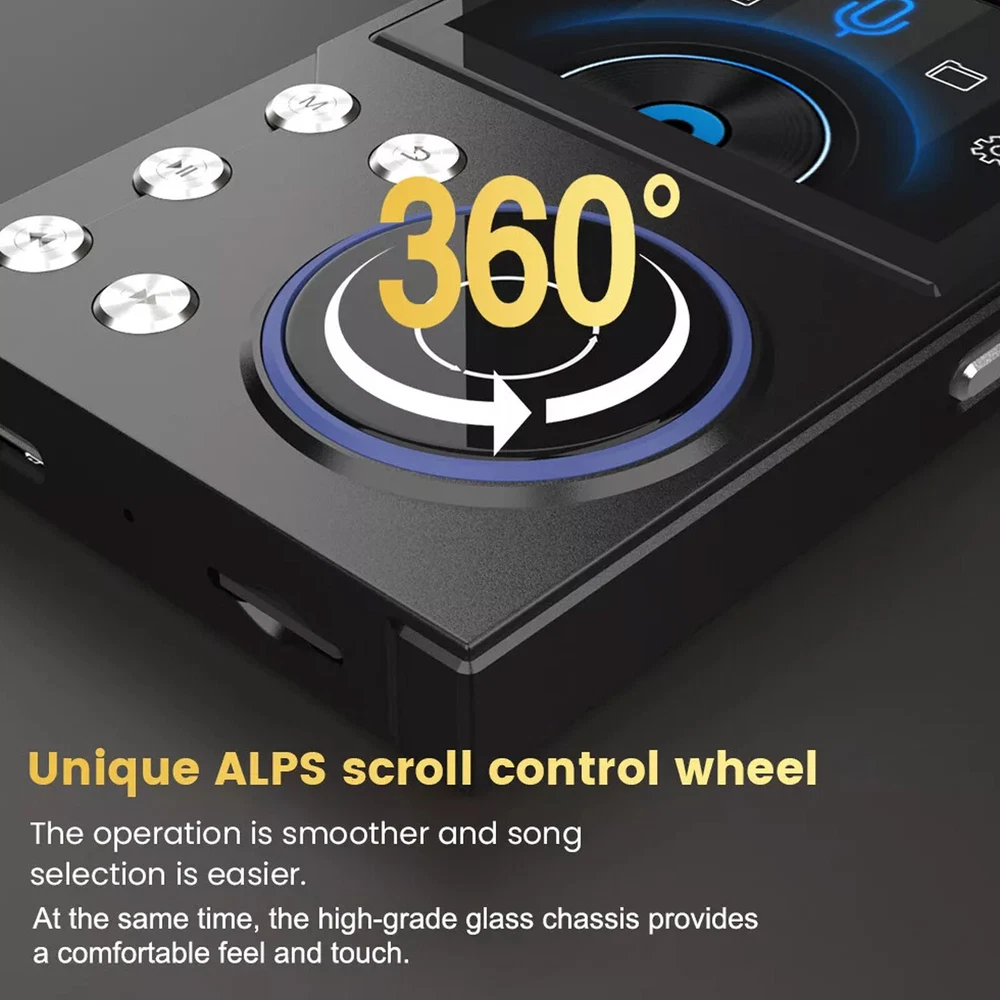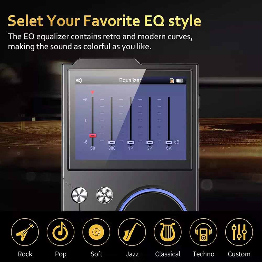 Features 【High Resolution Sound Quality Music Player】 This high resolution audio player has excellent sound quality with advanced DSD decoding technology to reduce distortion; the high resolution audio player captures the depth and breadth of each note. It is perfect for audiophiles to enjoy live music. (Warm reminder: the sound quality will be better with professional speakers or HiFi headphones.) 【HIGH RESOLUTION LOSSLESS AUDIO PLAYER】 The HIFI lossless MP3 player uses an advanced audio stereo DAC chip with a maximum sampling rate of 128-384 kHz/16-64 bit. [Long Playback Time and Expandable Large Memory】 With a built-in 1500mAh battery, you can enjoy up to 24 hours of uninterrupted high-resolution music at volume 30 and screen saver mode.Hi-Fi music player has a built-in capacity of 16GB, and you can also expand the storage space up to 128GB Micro SD card and enjoy the music library which is thousands of songs long. [Humanized Design] This digital music player features a 2.4-inch HD screen that is easy to navigate with the retro-designed scroll wheel. Control the main functions and volume intuitively with 1 finger. Line out and headphone out ports are flexible to use, including wired headphones or home audio systems, cars with auxiliary cables and amplifiers. 【Fashionable Craftsmanship】 The lossless music player is elegantly portable with a high-precision CNC aluminum alloy case. The unique scroll control wheel can quickly find menu files and is very responsive. The independent menu button and return button have a one-touch lock screen function, easy to operate. Specification Product Name: HiFi MP3 Player Product Model: HIFI-01 Operation mode: button + scroll wheel encoder Screen size: 2.4 inches Resolution: 240*320 Bluetooth version: 5.0 Memory capacity: 16GB built-in (self-contained) Memory Expansion: Maximum support 128GB TF card (not included) Audio format: MP3 WMA WAV APE FLAC ACC OGG DSD64 Recording format: MP3/WAV Image format: JPEG Charging time: 2 hours Charging port: Type-C Headphone jack: 3.5MM Battery capacity: 1500mAh high-density polymer lithium battery Playback time: about 24 hours (3.5MM headphone volume 30 screen saver to play lossless music) Playback Mode: Sequence,Random,Loop,Repeat Audio EQ: Rock, Heavy Metal, Pop, Bass, Classical, Customized sound effects Support System: Windows XP/win7/Vista/2K/ME/Linux9/Mac OS 10 Language Support: Chinese,Traditional,English,Korean,Japanese,French,German,Portuguese,Russian,German,Italian Body size: 97*60.4*13.9mm (L*W*T) Body material: metal Package Included 1* MP3 player (16GB) 1* Owner's Manual 1* Type-C cable Warm Notice 1. The TF card in the photo is not included! 2. According to the light color may vary! 3. Please allow a slight 1cm difference due to manual measurement! 4. Thank you for your understanding and concern, wish you have a pleasant shopping experience!