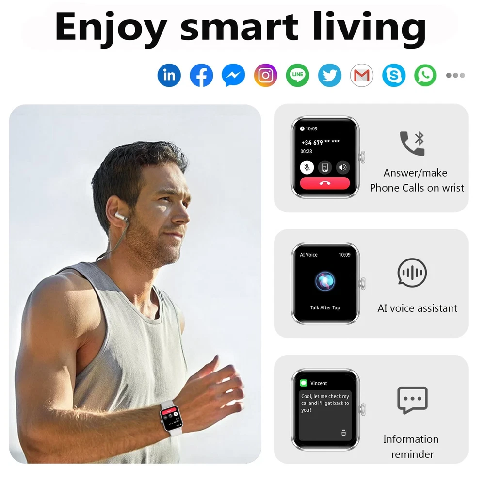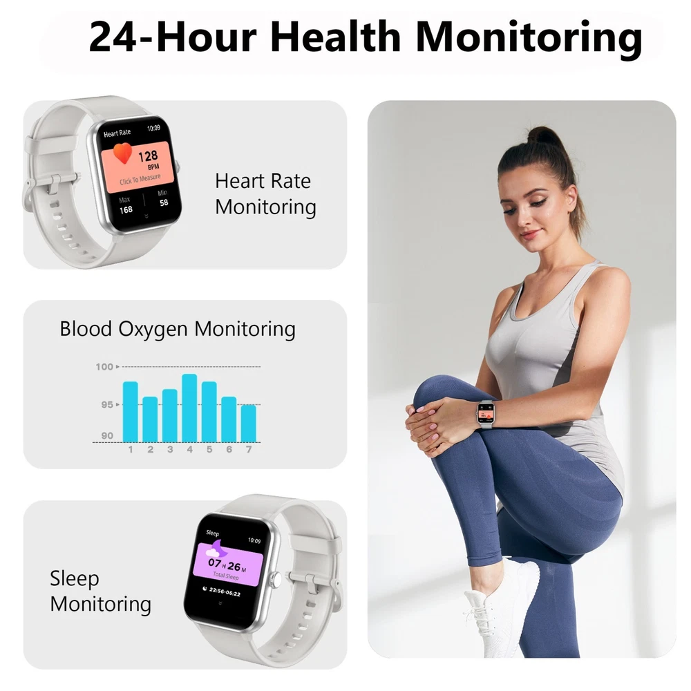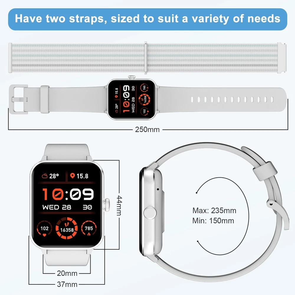 đ ăAnswer/Make Calls and AI Voice Assistantă Blackview smart watches come with built-in HiFi stereo speakers and microphone. Once connected to Bluetooth, you can directly answer or make calls through the smartwatch. The "Da Fit" app stores multiple contacts, ensuring you stay connected with family and friends anytime, anywhere. Receive real-time notifications on the smartwatch for incoming calls or messages (WhatsApp, Facebook, Instagram, etc.). Speak to the AI voice assistant for quick help, such as weather forecast, making calls, setting alarms etc. đ ăDIY Watch Faces & 2 Pack Watch Strapsă Fashionable smartwatches for men and women are constructed from a special aluminum alloy material, which comes with two types of watch straps - Nylon watch straps and silicone watch straps. You can choose the background image for your watch face (your family, pets, or other photos that you like), and download and use it through the "Da Fit" app on the 1.85-inch full-touch HD screen. The system offers over 100 watch faces to choose from as well. đ ă100+ Sports Modesă With more than 100 sports modes, this fitness tracker supports running, cycling, walking, climbing, yoga, skiing, football, and more. It tracks your daily data such as steps, time, distance, and calories, and connects to the GPS on your phone to record all your training routes and fitness using the "Da Fit" app to further motivate yourself to complete your exercise plan. It's an IP68 waterproof device that can meet your daily needs. (*NOTE: Not for sauna, hot water, swim, diving) đ ăMonitor Health in Real Timeă The fitness watch for women and men uses high-performance optical sensors to monitor dynamic heart rate in real time 24/7. It can also accurately track your personal sleep and detect blood oxygen saturation and stress levels to adjust your physical condition in a timely manner. The app even offers a detailed sleep quality analysis report (light/deep/awake sleep stage), helping you adjust your lifestyle towards a healthier lifestyle. (*NOTE: This watch cannot be used as a medical diagnostic tool.) đ ăMore Smart Toolsă Apart from the features mentioned above, this smartwatch also offers other useful daily functions such as smart notifications, music control, camera control, casual games, weather forecast, sedentary reminders, alarm clock, stopwatch, timer, etc. Compatible with most Android 6.0 and iOS 9.0 or above smartphones, it comes with a built-in large capacity battery of 350mAh, which ensures up to 7 days of use and approximately 30 days of standby with just 2 hours of charging. đ Fantastic Gift for Your Family and Friendsđ Packing List: 1 x Smart watch 1 x Replacement strap 1 x Charging cable 1 x User Manual đ˘đ˘đ˘Frequently asked question Please note that the maximum Bluetooth distance is 8-10 meters. If the watch was beyond the distance, it will cause the disconnection, you need to bind the watch to the app again. If the app canât detect the watch, please restart your phone and also reset the watch (Turn on the watch--> Click the "Settings" icon-->Click the "System"--> "reset".) Then try again. If you still canât connect the watch: please uninstall the app and also delete the "R50" from the Bluetooth paired list of your phone. Install the app and try again. If you can not receive any message or make the call,please check the permission enabled.(On your phone permission about Appďź It support system version above Androdid 6.0 and IOS 9.0.if the version is lower than 9.0, please upgrade first.ďźIt can be set through the mobile phone - general -about this machine - check the versionďź