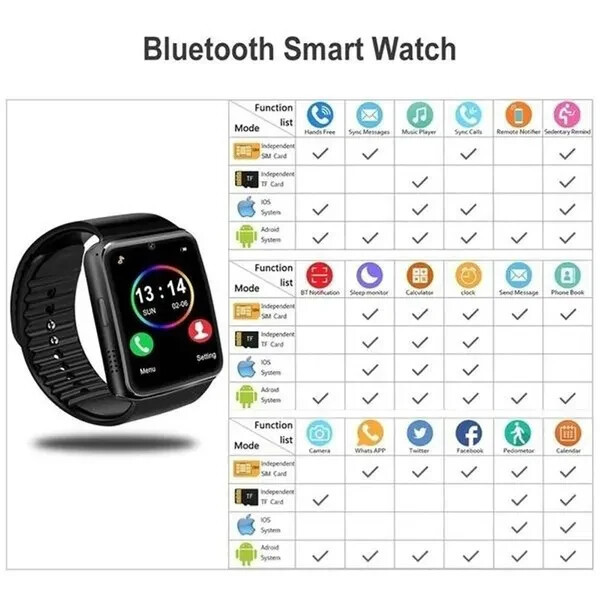 Bluetooth Smart Watch GT08 SIM Card for child kids tracker phone watch camera. Features: Battery: 380mah large-capacity polymer battery. Call function: GSM/ gprs850/900/1800 four-frequency call. VERY IMPORTANT , most areas in Australia no longer support GSM. Please check your area or travel destination for network compatibility. Call the speakerphone and record the phone. SMS: local SMS and SMS bluetooth synchronous push. Entertainment: bluetooth music playback, camera. The calculator pedometer, sitting for a long time to remind the sleep monitor to take a photo calendar stopwatch. SMS push. Time setting synchronization. Call remind: the bell and vibration to remind the clock, calendar, file management, photo albums, intelligent search, recording, music player. Specifications: Display: 1.52-inch, TFT ultra hd LCD. Resolution: 240*240 pixel. Call function: support the gsm 850/900/1800 /1900 four-frequency call. Clock display: 3 sets of display clock, free toggle. Sitting reminder: choose any time period according to your personal preference, and remind users to get up after the arrival. Memory: 32M+32M support TF card expansion. Display: 1.54 inch TFT high-definition LCD resolution: 240*240PIXL. Touch screen: capacitive touch screen.