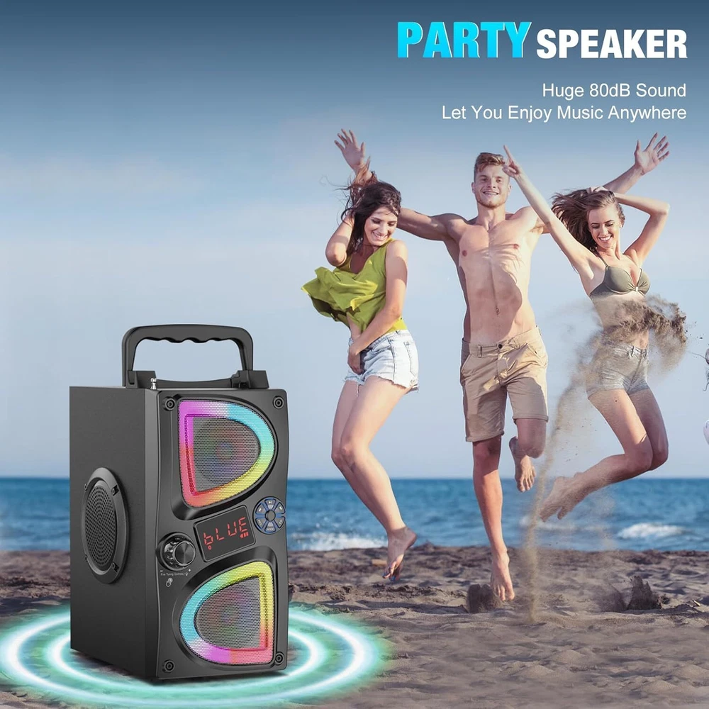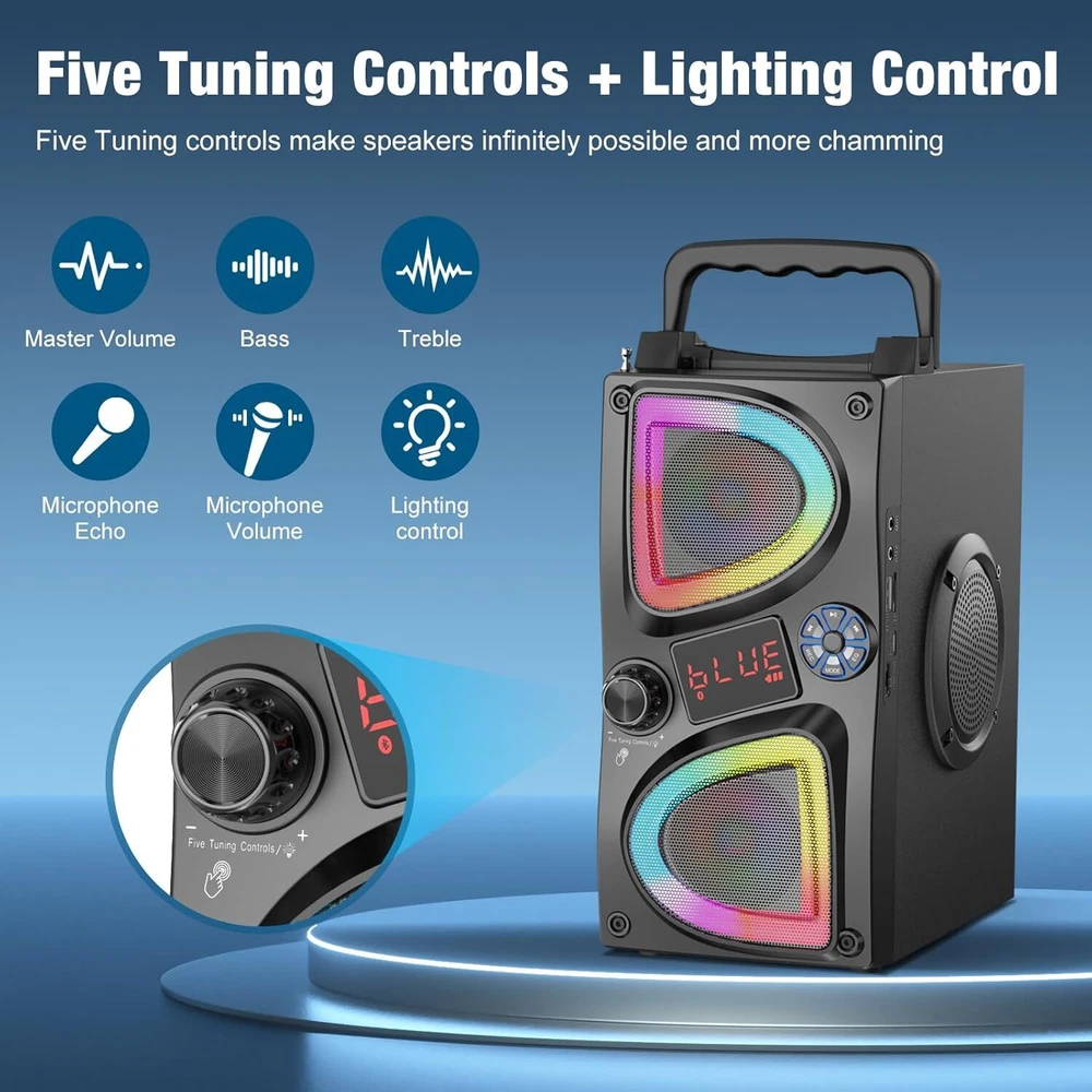 Speaker Maximum Output Power 6E+1 Watts Frequency Response 8E+1 Hz Connectivity Technology Auxiliary/Bluetooth/USB/Wireless Audio Output Mode Stereo Immersive Audio Experience: This SUPNIU Bluetooth speaker delivers a powerful 60W (peak) output with a cutting-edge 4-driver configuration, including 2 woofers and 2 tweeters, for superior sound projection, unparalleled clarity, and depth, ensuring your music, movies, and more come to life like never before. Long-Lasting Portability: Equipped with the latest Bluetooth 5.0 technology for seamless connectivity and a 4000mAh battery, this portable speaker offers up to 15 hours of playtime, making it the perfect companion for outdoor adventures, parties, or any occasion where you need to take your music on the go. Dazzling Light Show: Elevate your parties with the speaker's stunning light show feature, where vibrant colors dance and pulse to the rhythm of the music, creating an electrifying atmosphere that will energize your gatherings. Versatile Connectivity: With Bluetooth, USB, TF card, and AUX input options, this versatile speaker offers multiple ways to play your favorite tunes, ensuring you can enjoy your music anytime, anywhere, from any compatible device. Thoughtful Design: The integrated display screen showcases the remaining battery level, so you're never caught off guard when the power runs low, while the included remote control and karaoke microphone add convenience and fun to your music experience.