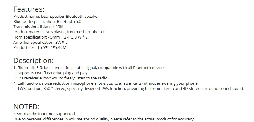 30 Days Return Fast Shipping Trusted Seller Bluetooth Speaker 8D mini Soundbar Dual Speaker Stereo Tfusb Playback Fm Voice Broadcasting Portable Subwoofer Wireless Speaker Please note: Colors may vary slightly due to lighting, screen settings, or viewing conditions. • Dual Speaker Stereo : Enjoy high-quality sound with two speakers that provide a stereo experience. • Bluetooth 5.0 : Connect your device seamlessly with the latest Bluetooth 5.0 technology. • Portable Speaker : Take your music anywhere with this lightweight and compact portable speaker. • USB Input : Play your favorite tunes directly from a USB drive without the need for additional devices. • Dual stereo speakers: Enjoy high-quality sound with two speakers that provide a stereo effect. • Bluetooth 5.0: Connect your device seamlessly with the latest Bluetooth 5.0 technology. • Portable Speaker : Take your music anywhere with this lightweight and compact speaker. • USB Input : Play your favorite tunes directly from a USB drive without the need for additional devices. • Dual stereo speakers: Enjoy high-quality sound with two speakers that provide a stereo experience. • Bluetooth 5.0: Connect your device seamlessly with the latest Bluetooth 5.0 technology. • Portable Subwoofer: Take your music anywhere with a powerful subwoofer that delivers deep bass. • TF USB Playback: Play your favorite tunes directly from a USB drive without the need for additional devices. • Dual stereo speakers: Enjoy high-quality sound with two speakers that provide a stereo experience. • Bluetooth 5.0: Connect your device seamlessly with the latest Bluetooth 5.0 technology. • Portable Subwoofer: Take your music anywhere with a powerful subwoofer that delivers deep bass. • Playback FM Voice Broadcasting : Tune in to your favorite radio stations and enjoy clear voice broadcasts. • Dual stereo speakers: Enjoy high-quality sound with two speakers that deliver clear and crisp audio. • Bluetooth 5.0: Connect your device seamlessly with the latest Bluetooth 5.0 technology. • Portable Subwoofer: Take your music anywhere with a powerful subwoofer that delivers deep bass. • Playback FM Voice Broadcasting : Tune in to your favorite radio stations and enjoy voice broadcasts with ease. Features: Product name: Dual speaker Bluetooth speaker Bluetooth specification: Bluetooth 5.0 Transmission distance: 10M Product material: ABS plastic, iron mesh, rubber oil Horn specification: 45mm * 2 4 Ω 3 W * 2 Amplifier specification: 3W * 2 Product size: 15.5*5.4*5.4CM Description: 1: Bluetooth 5.0, fast connection, stable signal, compatible with all Bluetooth devices 2: Supports USB flash drive plug and play 3: FM receiver allows you to freely listen to the radio 4: Call function, noise reduction microphone allows you to answer calls without answering your phone 5: TWS function, 360 ° stereo, specially designed TWS function, providing full room stereo and 3D stereo surround sound sound. NOTED: 3.5mm audio input not supported Due to personal differences in volume/sound quality, please refer to the actual product for accuracy Notice: 3.5mm audio input not supported This product is not waterproof and should not be placed in water Due to personal differences in volume/sound quality, please refer to the actual product for accuracy Colors may vary slightly due to lighting, screen settings, or viewing conditions. If you experience any issues with your order, please contact us directly before opening a return case or leaving feedback. We are committed to resolving your concerns promptly and ensuring your satisfaction. SHIPPING POLICY: Free Worldwide Shipping RETURN POLICY: 30 Days returns! PAYMENTS: Safe and secure payement with PayPal! FEEDBACK: Customer satisfaction is very important to us. If you have any problem with your order, please contact us. We are here to assist you and resolve any issues that arise, so please give us a chance to do so prior to potentially posting any negative feedback. We are sure that we can provide a solution that makes you satisfied. CONTACT US: If you have any queries, please contact us via ebay . We usually respond within 24 hours on weekdays. Thank you for shopping with us!