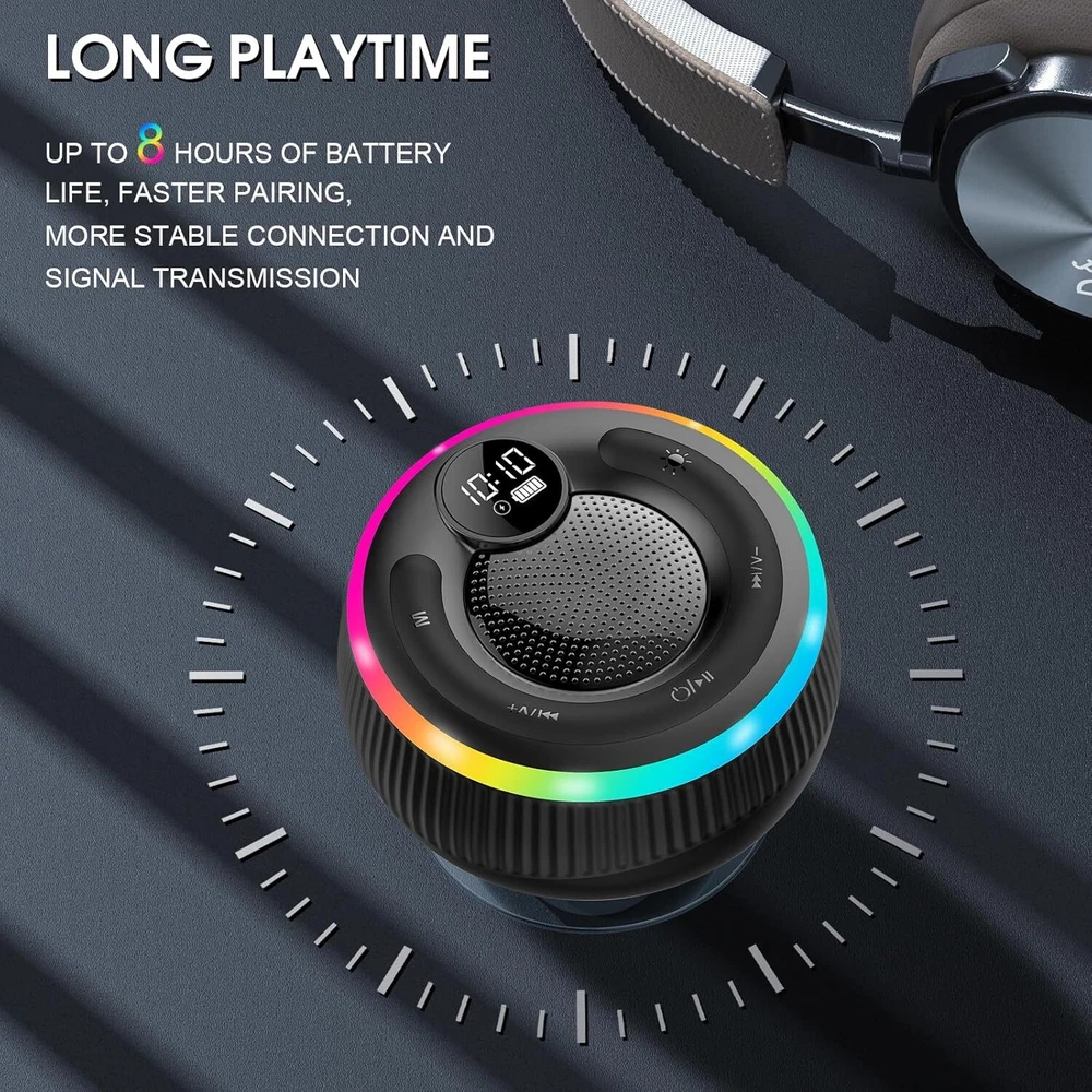 Bluetooth Speaker, HD Stereo Sound Shower IPX7 Waterproof, Black Product Details Model Name: M9 Speaker Type: Multimedia Special Feature: Portable, LED Light, Waterproof, Built In Microphone, Display Recommended Uses For Product: For Smartphones or Tablets, For Computers, For Bathroom Use Compatible Devices: Laptop, Desktop, Tablet, iphone, Smartphone Color: Black Included Components: 1 x Bluetooth Speaker, 1 x User Manual, 1 x Type C Charging Cable Product Dimensions: 4.7"D x 2.2"W x 5.7"H Age Range (Description): Adult Is Waterproof: True Number of Items: 1 Control Method: Voice Wireless Communication Technology: Bluetooth Power Source: Battery Powered Water Resistance Level: Waterproof Number of Batteries: 1 Lithium Polymer batteries required. (included) Audio Driver Type: Dynamic Driver Bluetooth Range: 1E+2 Feet Connectivity Protocol: Bluetooth Includes MP3 player?: Yes Specific Uses For Product: Versatile: Bathroom, Outdoor, and General Use Style: Modern Manufacturer: Ddidbi Item Weight: 11.1 ounces Item model number: M9 Batteries: 1 Lithium Polymer batteries required. (included) Country of Origin: China Brand: Ddidbi Speaker Maximum Output Power: 10 Watts Connectivity Technology: Bluetooth Audio Output Mode: Stereo Mounting Type: Wall Mount Immersive 360° Stereo Sound: Equipped with cutting-edge audio technology, this Bluetooth speaker offers a powerful 360° stereo soundstage that surrounds you with rich, immersive audio. Dual passive radiators harmonize with main drivers to amplify low frequencies, delivering deep, punchy bass while maintaining clear mids and highs. Whether you’re into soft acoustics or energetic beats, this portable speaker adapts effortlessly, delivering dynamic, versatile sound for any occasion. IPX7 Waterproof and Durable Design: This shower speaker, reinforced with IPX7-level protection, offers robust resistance to water, steam, dust, and shocks—making it an ideal choice for bathrooms, poolside relaxation, and outdoor adventures. Enjoy your favorite music without worry, even in the most demanding environments. Additionally, the speaker includes a secure suction cup for added stability, allowing it to firmly adhere to glass, ceramic, or any smooth surface. Bluetooth 5.3 & Hands-Free Calls: Equipped with advanced Bluetooth 5.3, this waterproof shower speaker pairs with all iOS and Android devices, phones, computers, and even Echo series devices in under 3 seconds. It offers an impressive connection range of up to100 feet, ensuring stable, crystal-clear audio with minimal delay. The built-in microphone enables hands-free calling, letting you take calls while cooking, working out, or in the shower—no need to reach for your phone. Bathroom Ambiance Lighting: This portable LED Wireless Bluetooth Speaker doubles as a vibrant bathroom light, with colors syncing to the beat for a mesmerizing glow in wet environments. Featuring gradient lighting, dynamic colors, and an LED display for battery level, it creates a dream-like atmosphere, especially at night. A wireless surprise for your loved ones – the perfect gift for any occasion. Compact & Long-Lasting Power: This 95*95.2*56mm portable speaker bluetooth, with a 1000mAh battery for up to 8 hours of playtime, is ideal for bathroom use and other wet environments. Enjoy uninterrupted music in the shower or around the house without worrying about recharging. Sleek, portable, and perfectly suited for any room or adventure!(Note: Short press the forward/backward button to switch songs, long press to adjust the volume. )