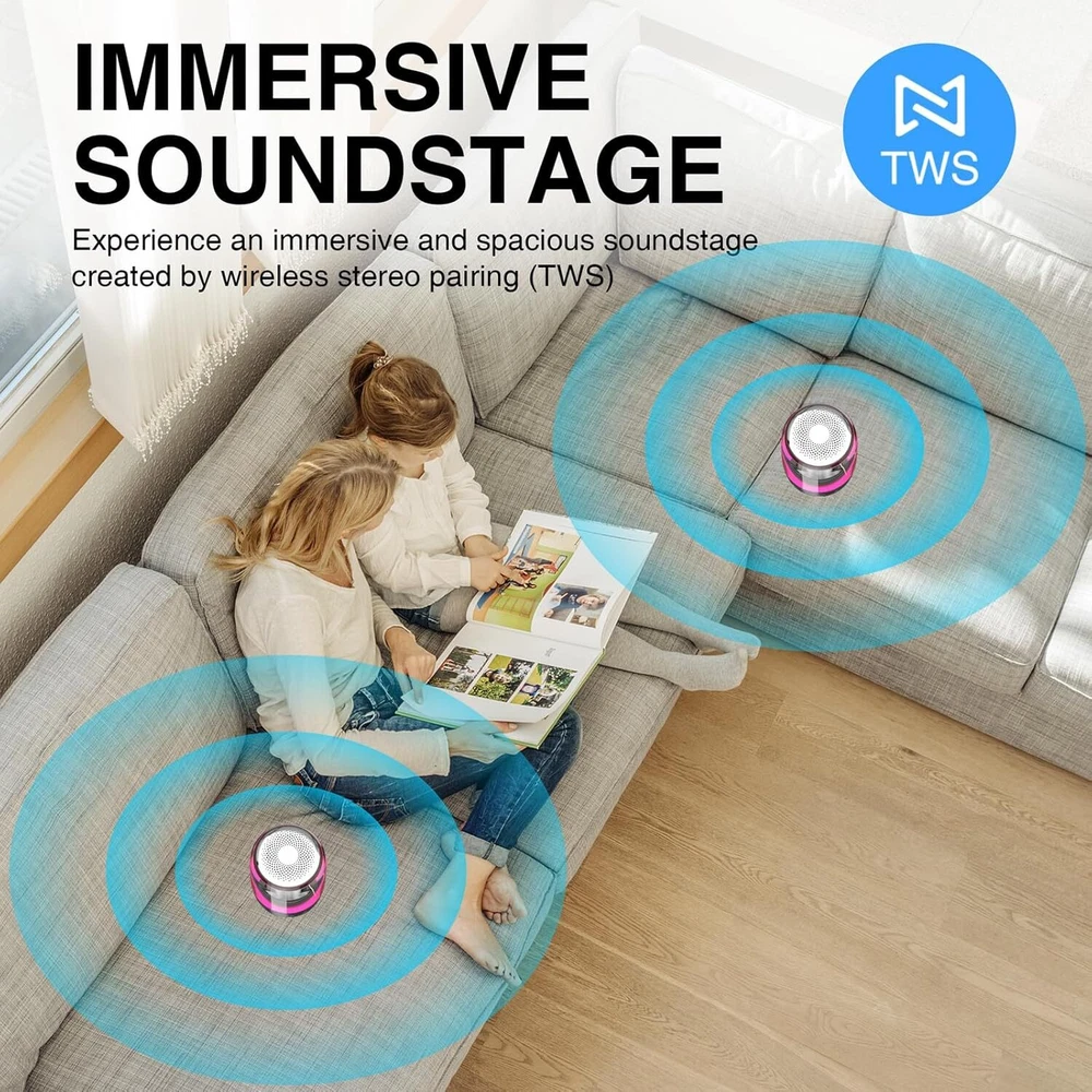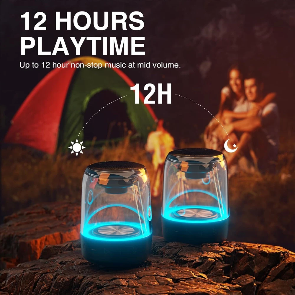 IMMERSIVE STEREO SOUND – Experience an immersive and spacious wireless stereo soundstage that makes you feel like you're right in the middle of the music, thanks to the featured TWS (True Wireless Stereo) capability. Equipped with premium speaker drivers, bass radiators and fine-tuned sound processors, this pair of speakers deliver clear, powerful, and balanced sound with deep, resonant bass. VIBRANT LED LIGHT SHOW - The LED lights will sync perfectly with the rhythm and beat of the music in 7 lighting modes, creating a mesmerizing light show that adds an extra dimension to your listening experience. EFFORTLESS CONNECTIVITY - Bluetooth 4.2 ensures wireless music streaming with stable pairing up to 66 feet (20 meters). Plus, take crystal-clear calls from your speaker with the touch of a button, thanks to the built-in speakerphone. The auxiliary (aux) input provides the option to connect your non-Bluetooth devices for wired music. UP TO 12 HOURS PLAYTIME - The built-in high-capacity rechargeable Lithium Polymer battery provides up to 12 hours of music playback at mid volume. WATERPROOF & PORTABLE - This IPX5 rated speaker is designed and built to withstand various weather conditions and has waterproof and dustproof capabilities. This handheld-sized speaker is designed to be lightweight (10 oz), making it easy to carry around in your bag, or hold in your hand. Product Description MEGATEK AuraStage Immersive Wireless Stereo and Stunning Light Show MEGATEK AuraStage With decades of expertise in sound engineering, Megatek combines cutting-edge technology, and meticulous craftsmanship to create top-notch speakers that redefine portable audio. Dual Portable Bluetooth Speakers An audio and visual experience like never before! Megatek AuraStage 2 - dual portable Bluetooth speakers are a perfect combination of unparalleled quality sound with immersive wireless stereo soundstage, thanks to its featured TWS technology, and visually stunning LED light show. Astonishing Sound Wireless Stereo Stunning Lights IPX5 Waterproof 12-Hour Playtime AUX Input Built-In Mic Immersive Wireless Stereo Sound Experience an immersive and spacious wireless stereo sound stage that makes you feel like you're right in the middle of the music, thanks to the featured TWS (True Wireless Stereo) capability. MEGATEK AuraStage Unparalleled Quality Sound Equipped with premium speaker drivers, bass radiators and fine-tuned sound processors, this pair of speakers deliver clear, powerful, and balanced sound with deep, resonant bass. Wireless Stereo Pairing (TWS) TWS capability pairs two Bluetooth speakers together and allows you to enjoy a true wirelessly stereo sound experience without the need for any wires or cables, creating a wider soundstage and a more immersive listening experience. Vibrant Led Light Show The LED lights will sync perfectly with the rhythm and beat of the music in 7 lighting modes, creating a mesmerizing light show that adds an extra dimension to your listening experience. Key Features 12-Hour Playtime The built-in high-capacity rechargeable Lithium Polymer battery provides up to 12 hours of music playback at mid volume. AUX Input The auxiliary (aux) input provides the option to connect your non-Bluetooth devices for wired music. Waterproof and Ultra-Portable This IPX5 rated speaker is designed and built to withstand various weather conditions and has waterproof and dustproof capabilities. This handheld-sized speaker is designed to be lightweight (10 oz), making it easy to carry around in your bag, or hold in your hand.